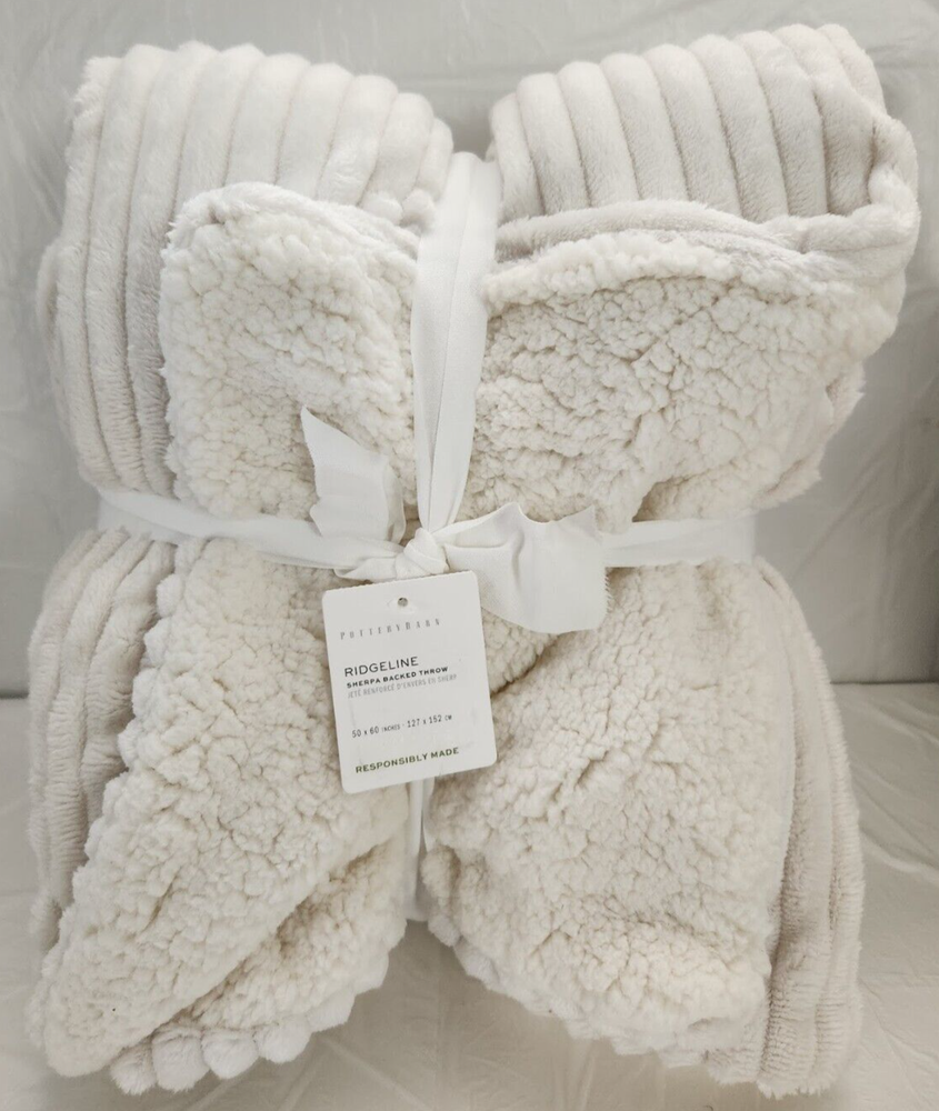 New With Tagged, as Shown on Photos. Add cozy warmth to your bedroom with this Pottery Barn Ridgeline Sherpa Backed Throw. Measuring 50" x 60", the rectangular throw is made of 100% plush polyester knit on the front & 100% polyester on the reverse fabric. The ivory color and modern style make it a perfect addition to any bedroom decor. This throw blanket features the Ridgeline Sherpa Backed pattern and is machine washable for easy care. With no closure type, it's easy to use and perfect for both teens and adults. This Pottery Barn Ridgeline Sherpa Backed Throw is a must-have for anyone looking to add some warmth and style to their bedroom.