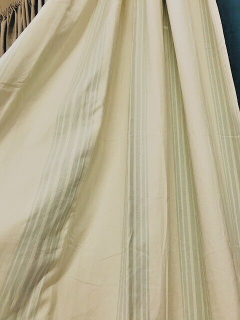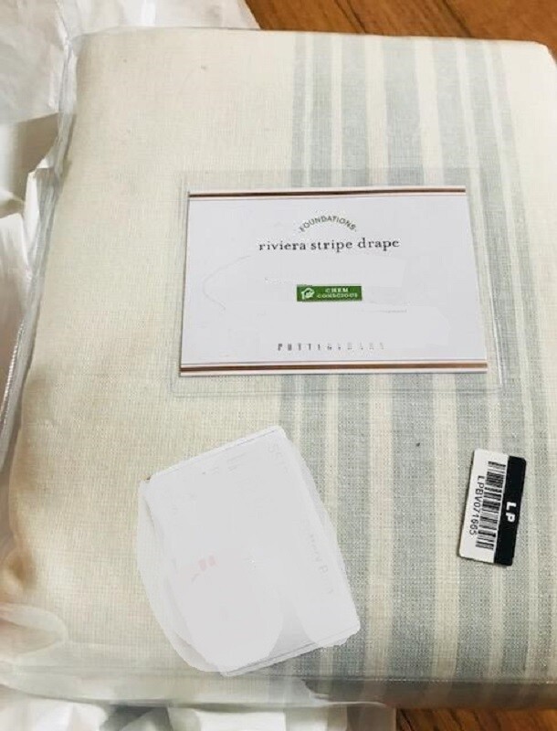 POTTERY BARN RIVIERA DRAPES Our Riviera Stripe Drape’s cross-woven design creates a sun-bleached effect. Woven of 55% linen, 45% cotton. Yarn-dyed fabric has incredibly rich color that holds its vibrancy over time. Hangs from the pole pocket or converts to ring-top style with the included drapery hooks. Use with 10 Clip or Round Rings (sold separately). Dry-clean only. Imported. Auction is for TWO drapery panel in 50 in. W by 108" L Color available is PORCELAIN BLUE *** Drapes ARE COTTON Lined. Items are BRAND NEW in ORIGINAL PACKAGING! A d d i T i O N a l P h o T O s A v a i L a B Le U p O n R e Q u e S T PURCHASED DIRECTLY FROM POTTERY BARN. AUTHENTIC.