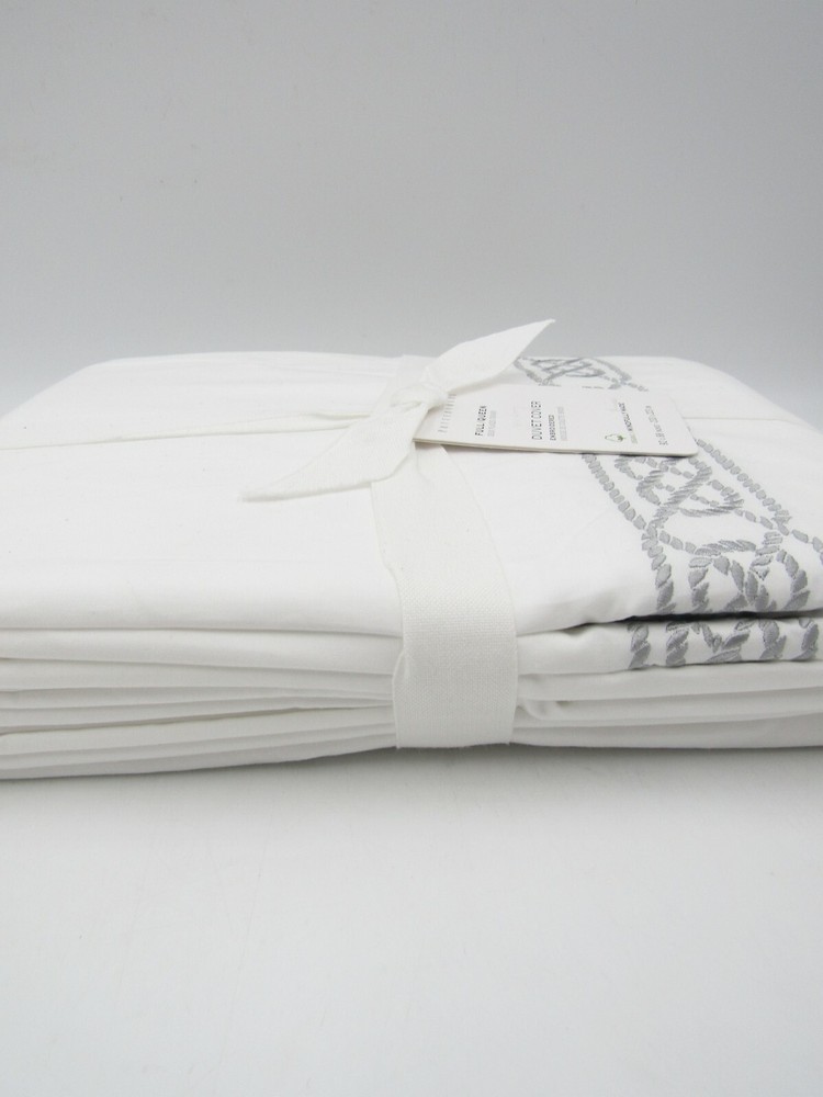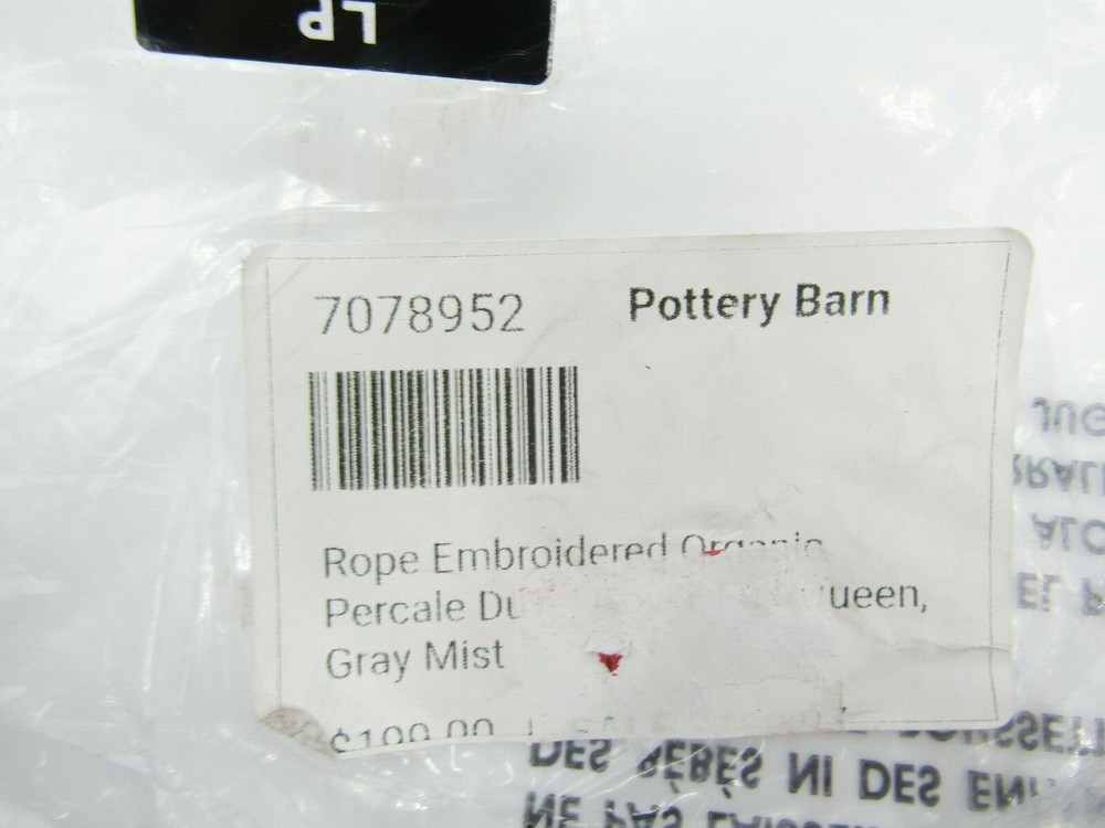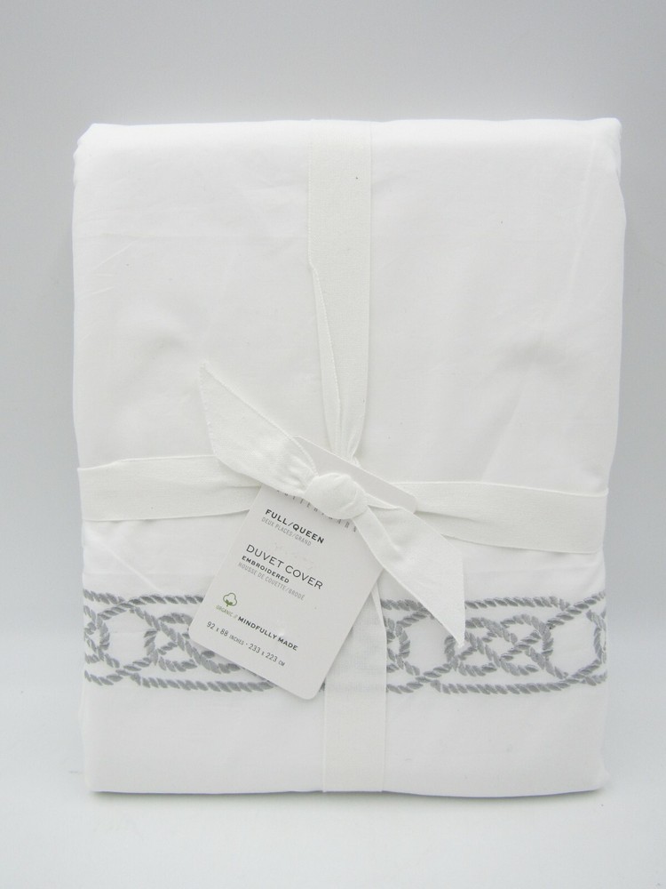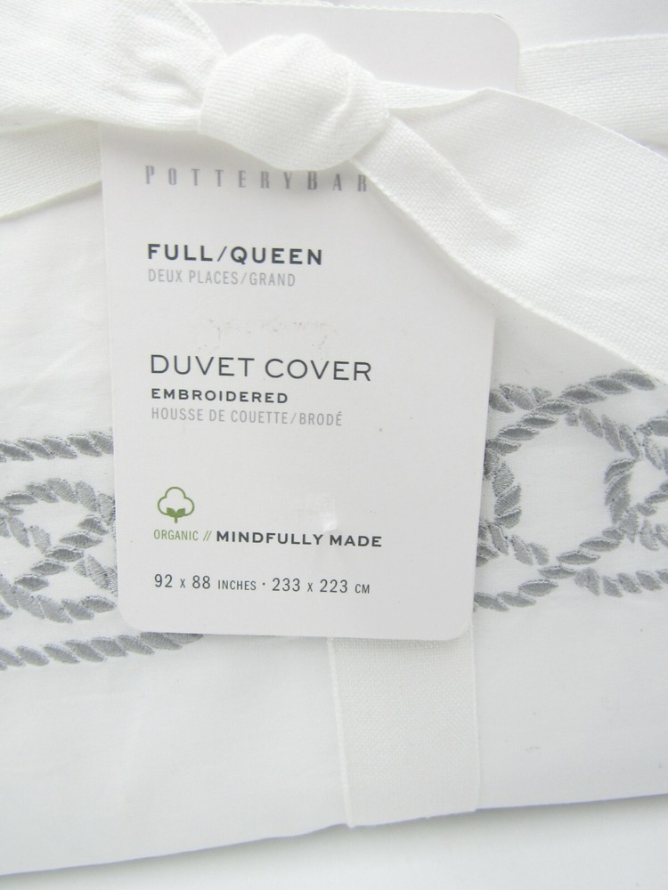 Pottery Barn Rope Embroidered Organic Percale Duvet Cover Gray Mist Full Queen #3625 Item is brand new! Auction includes: 1 Full/Queen Duvet Cover Woven of 100% organic cotton. Duvet features a button closure and interior ties to help keep insert (sold separately) in place; sham features an envelope closure. Certified to the Global Organic Textile Standard (GOTS) 400-thread count constructed of 2-ply yarns. Duvet and sham reverses to solid. Detailed with a satin-stitched embroidery. Imported. DIMENSIONS Duvet Cover Full/Queen: 88" l x 92" w CARE AND MAINTENANCE Machine wash in cold water; gentle cycle, with like colors. Only non-chlorine bleach when needed. Tumble dry on low heat; remove promptly. Warm iron as needed.