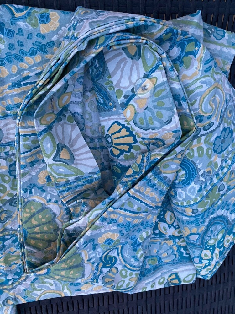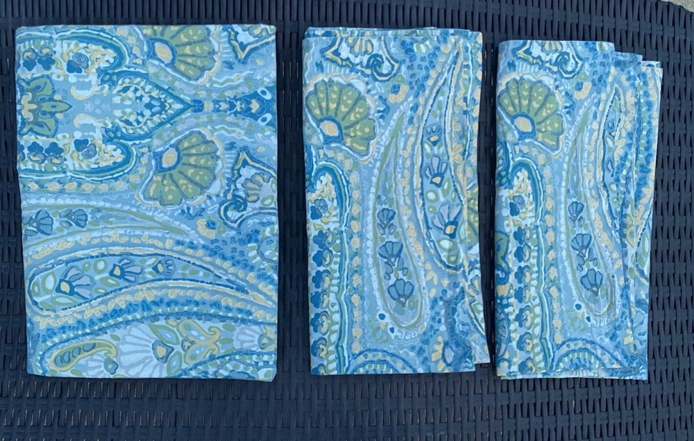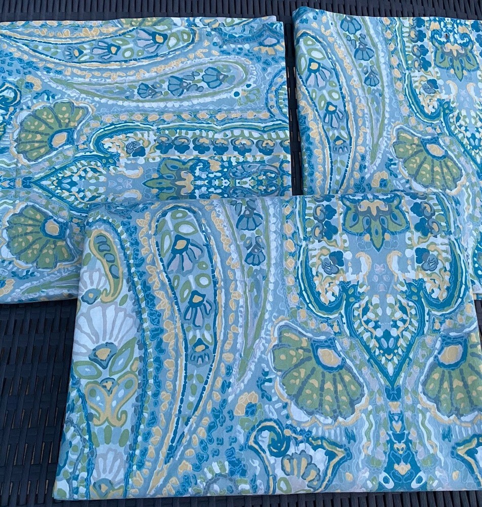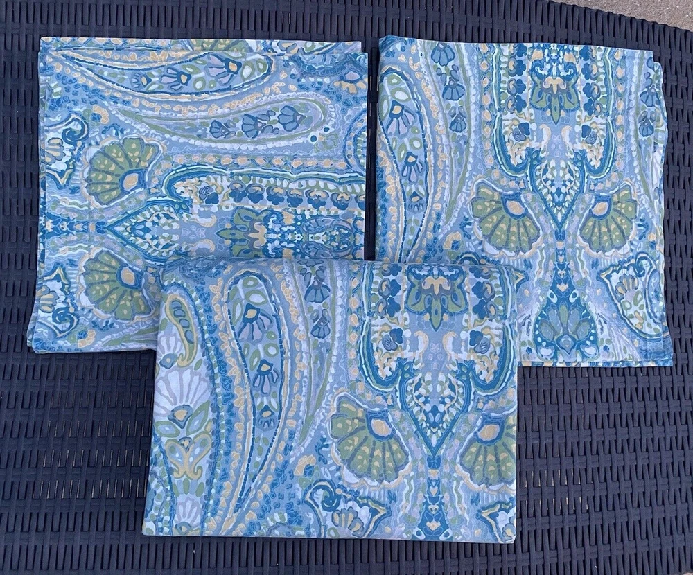 Pottery Barn Rosalie Blue Floral Paisley 100% Cotton QUEEN Duvet Cover Set 3pc Size: QUEEN One Duvet Cover & Two EURO Pillow Shams Condition: Good Pre-owned condition. Dimensions: Duvet cover: 90 Inches (L) x 90Inches (W) Shams: 24 in x 24 in Features: Corner Anchoring Ties Textile Material: 100% Cotton Backing Material: 100% Cotton Pattern: Floral Care and Cleaning: Machine Wash & Tumble Dry Please see pictures for further details.
