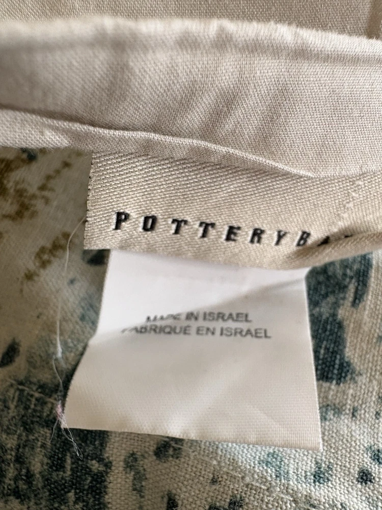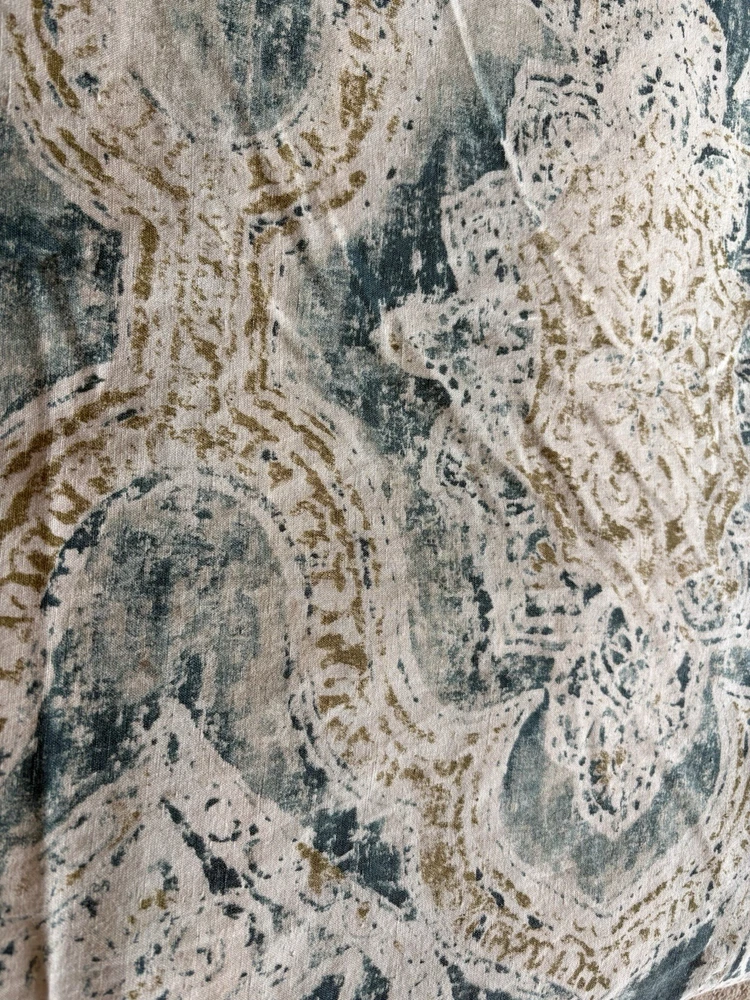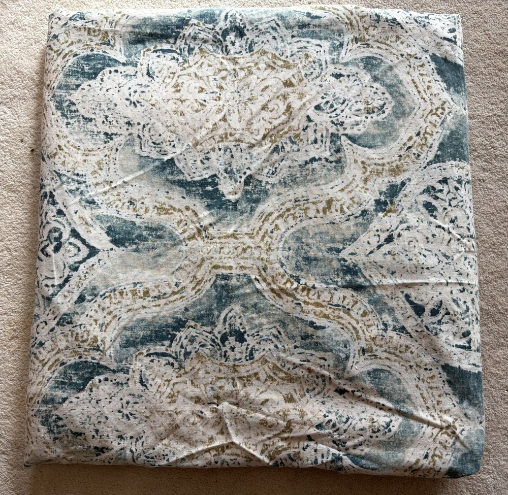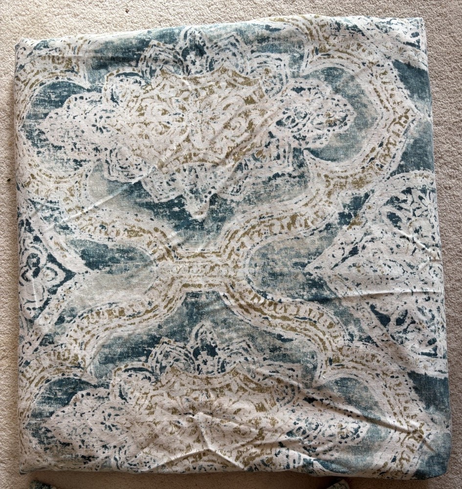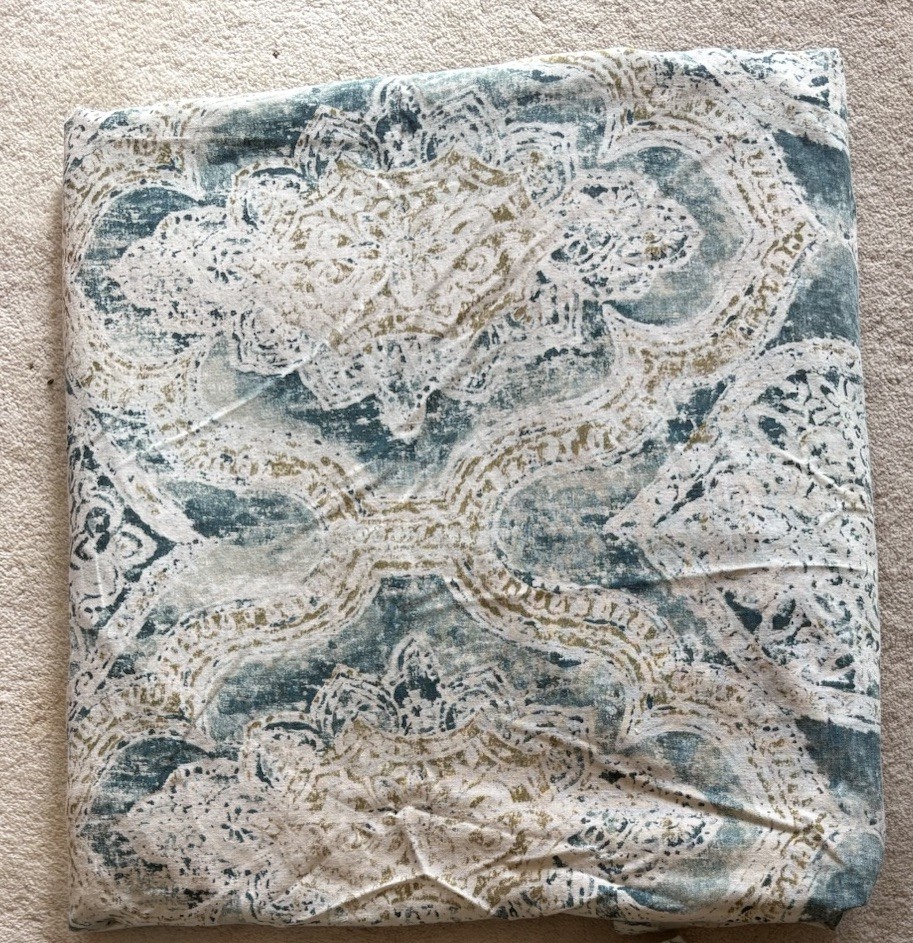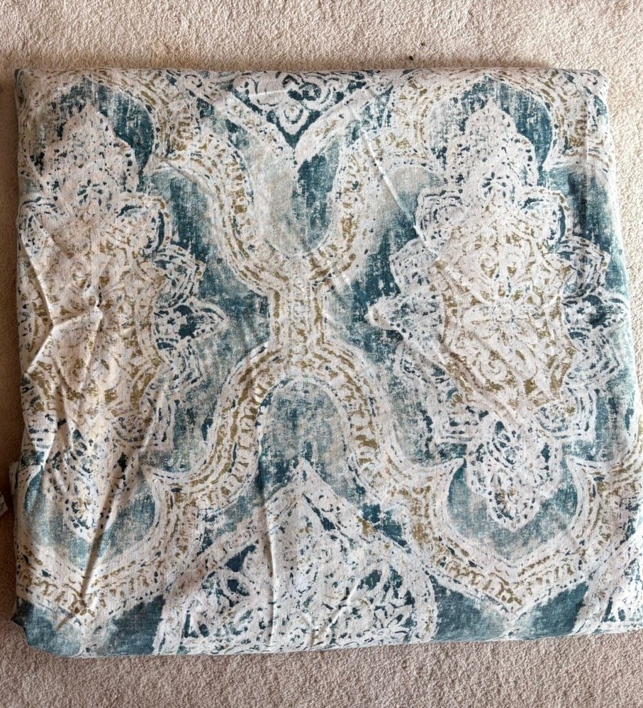 The Pottery Barn Rowena Medallion Duvet Cover in Teal/Gold is a luxurious addition to any bedroom. Made from a 55% linen & 45% cotton blend, this duvet cover features a beautiful medallion pattern in shades of cream, teal blue/green and gold adding a touch of elegance to your space. With a Full/Queen size and button closure, this duvet cover is both stylish and practical, perfect for creating a comfortable and inviting atmosphere. This full/ queen duvet is just gorgeous. The linen is so light and soft and it has been extremely well cared for. has been used in a guest bedroom. no stains or odors, tears or any damage of any kind.