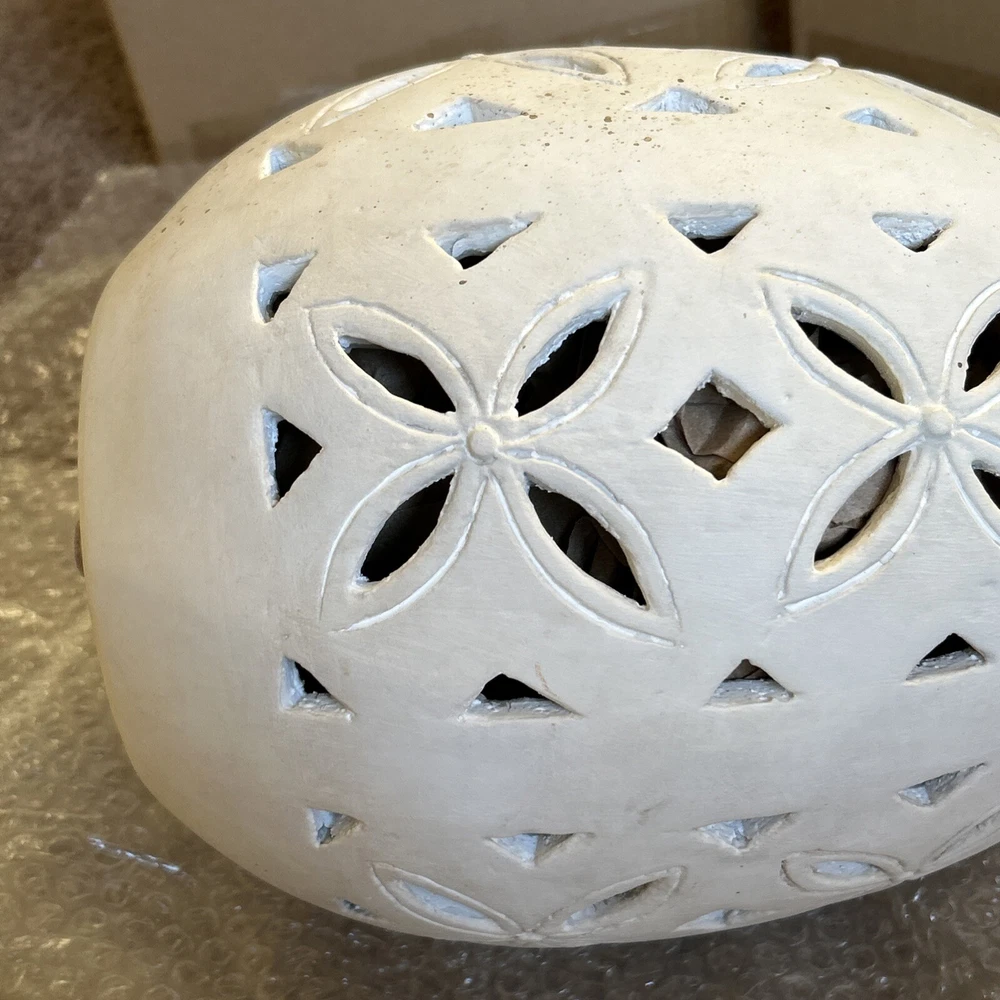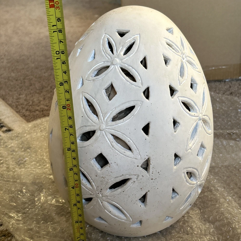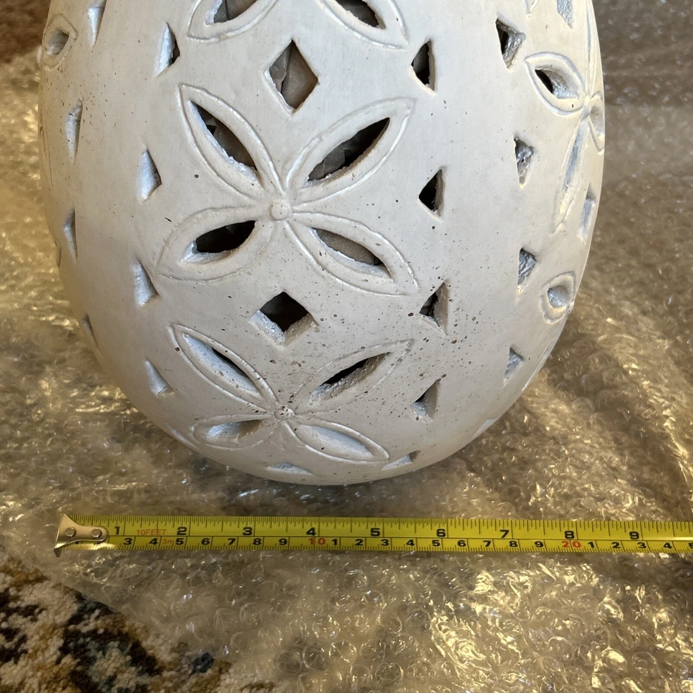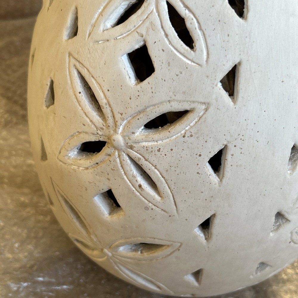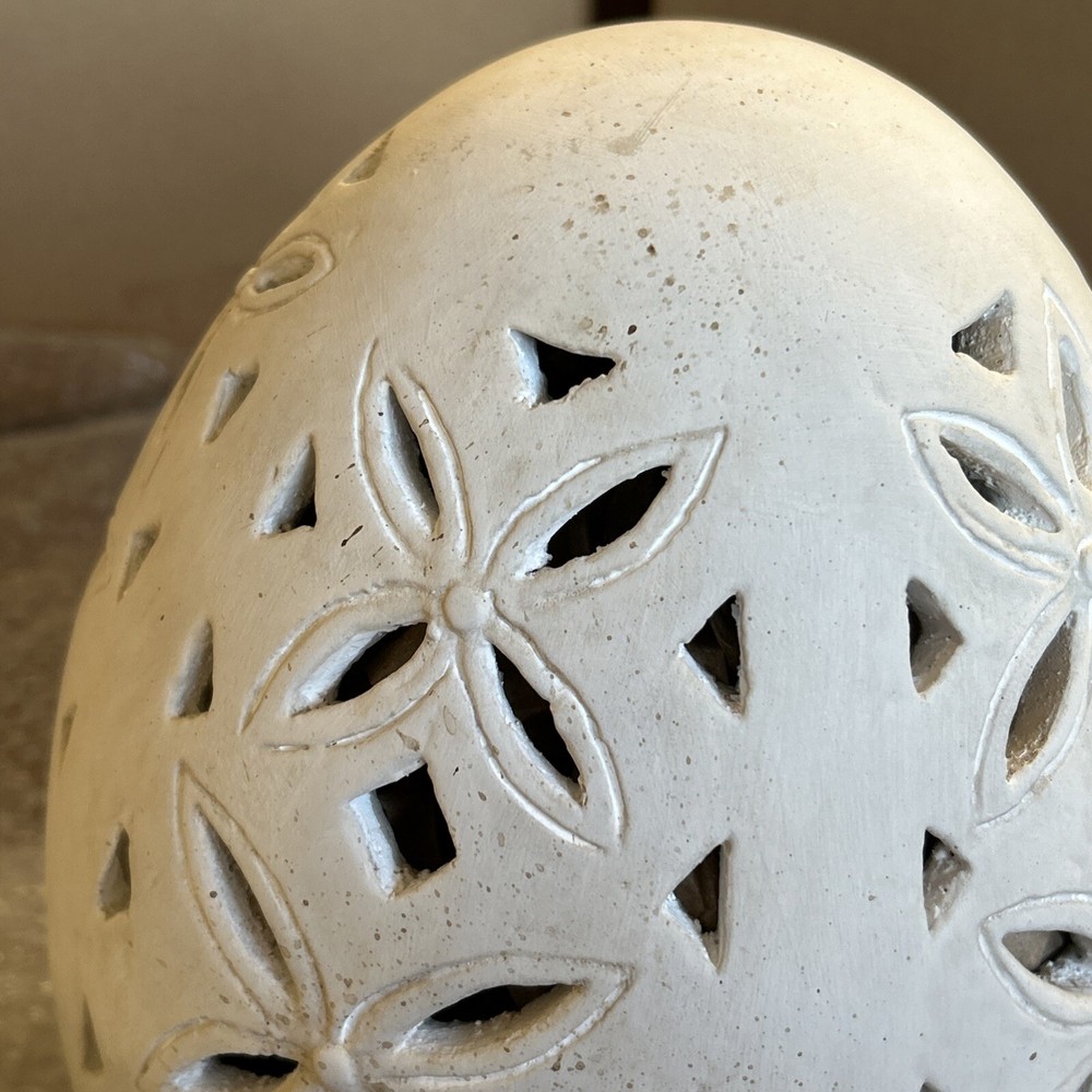 An irresistible addition to your Easter decor, this Pottery Barn sculptural egg features intricate cutouts in a beautiful, all-over design. Handcrafted from terracotta and finished in an antique white, it is both sophisticated and festive. For a warm glow and beautiful shadow play, add a votive or string lights inside. Brand new in box Rustic Easter egg cut out luminary Approximately 11” in height & 8” width Beautiful Decor for any time of the year