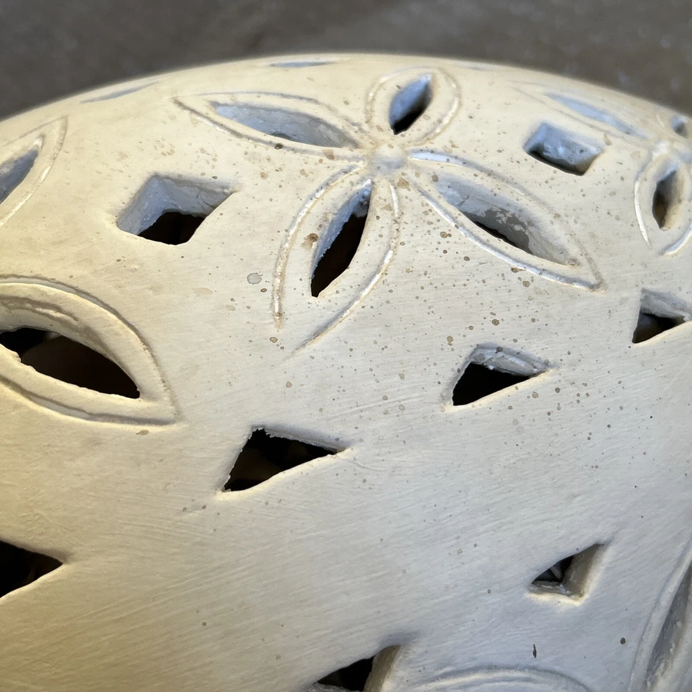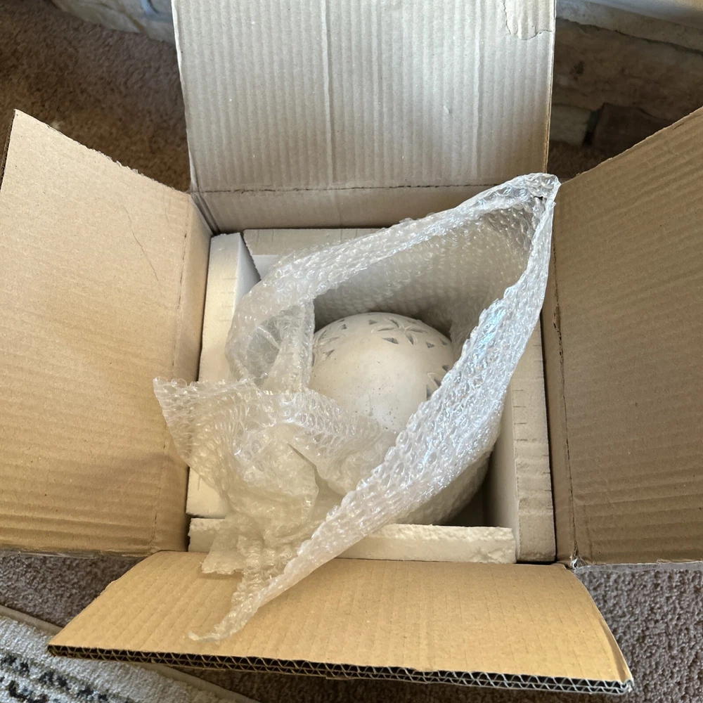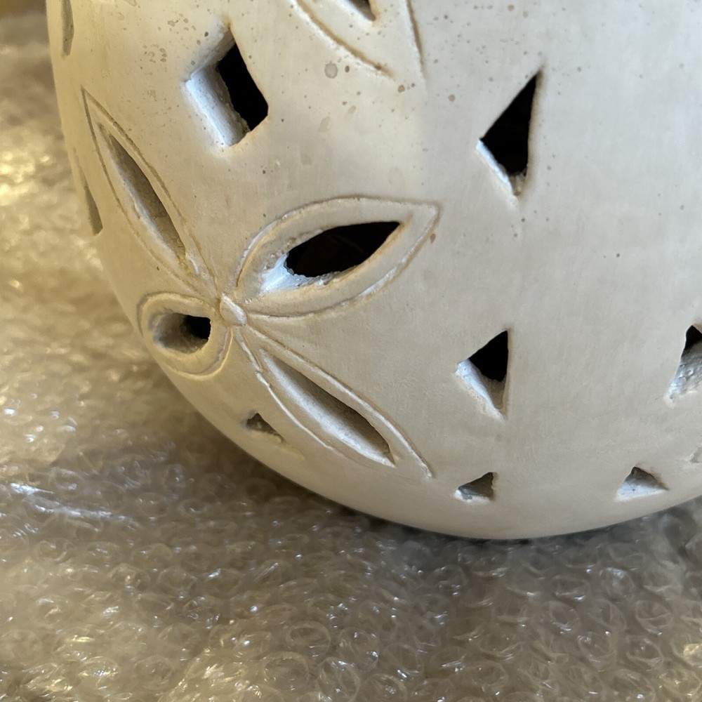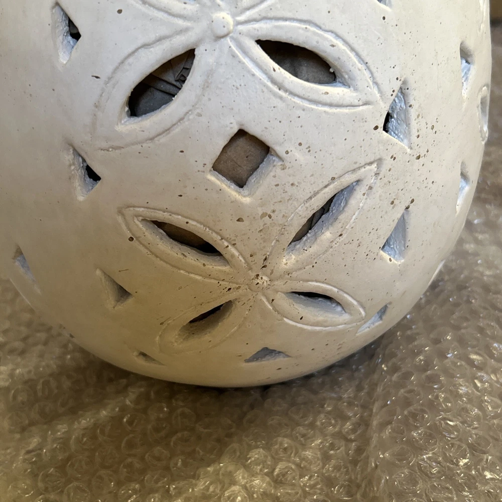 An irresistible addition to your Easter decor, this Pottery Barn sculptural egg features intricate cutouts in a beautiful, all-over design. Handcrafted from terracotta and finished in an antique white, it is both sophisticated and festive. For a warm glow and beautiful shadow play, add a votive or string lights inside. Brand new in box Rustic Easter egg cut out luminary Approximately 11” in height & 8” width Beautiful Decor for any time of the year