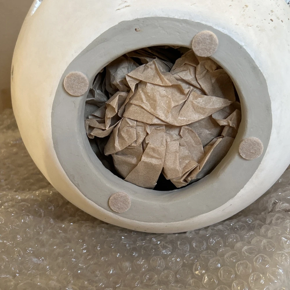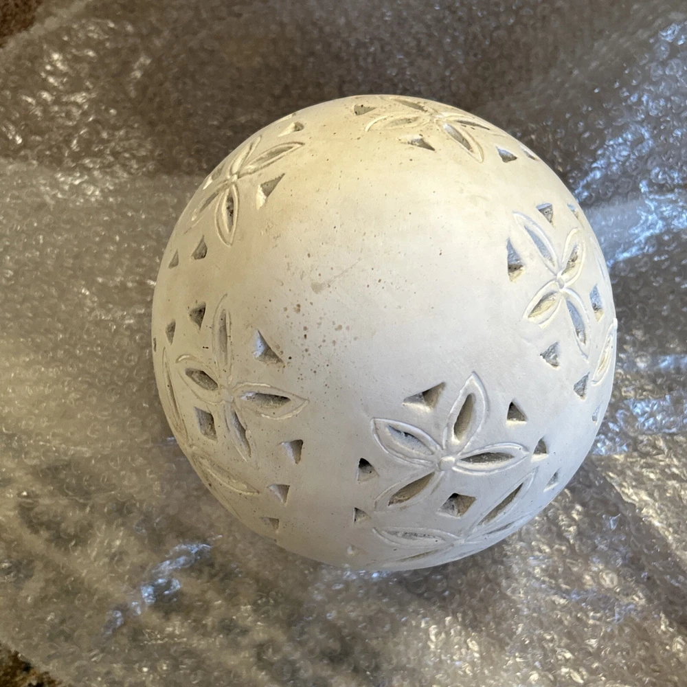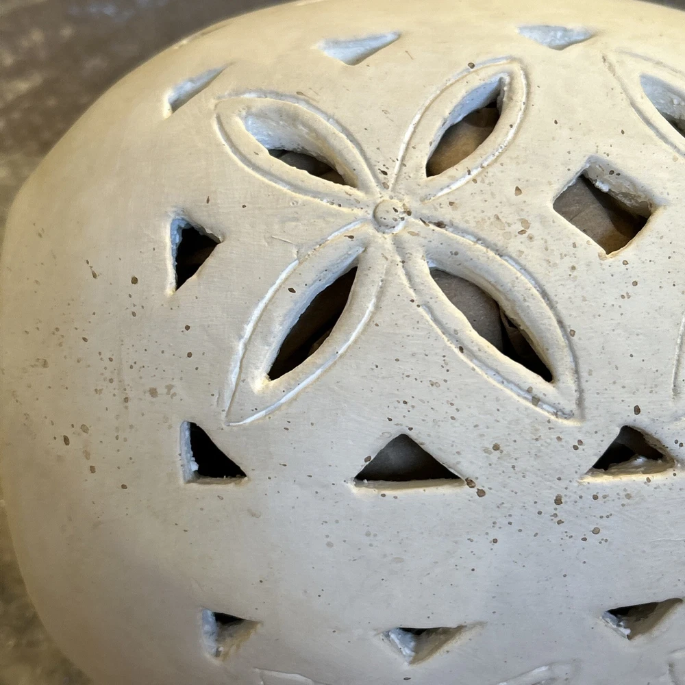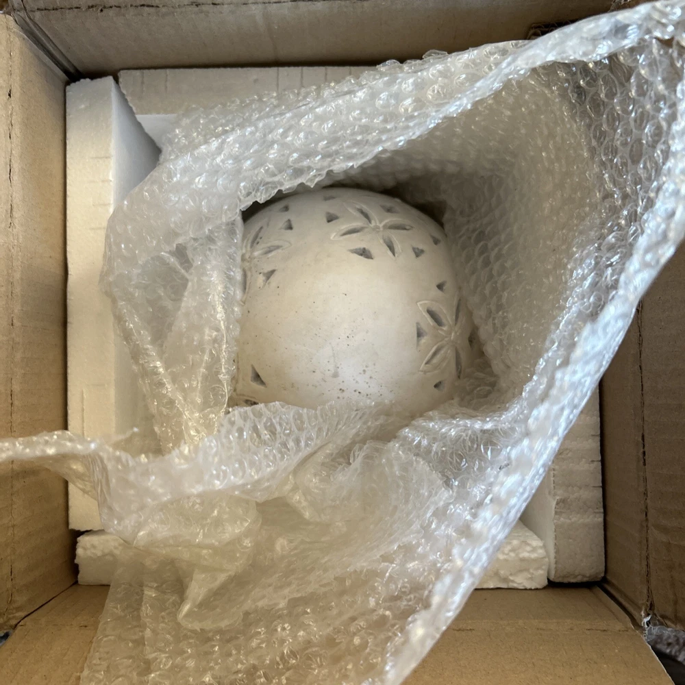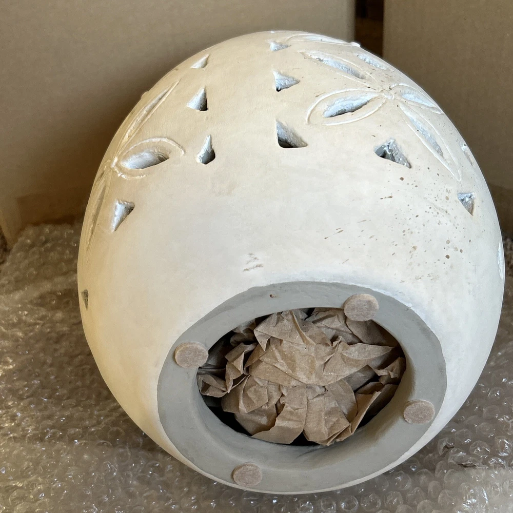 An irresistible addition to your Easter decor, this Pottery Barn sculptural egg features intricate cutouts in a beautiful, all-over design. Handcrafted from terracotta and finished in an antique white, it is both sophisticated and festive. For a warm glow and beautiful shadow play, add a votive or string lights inside. Brand new in box Rustic Easter egg cut out luminary Approximately 11” in height & 8” width Beautiful Decor for any time of the year