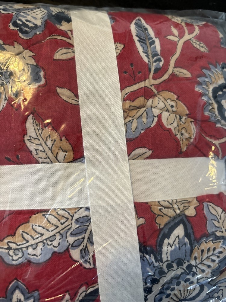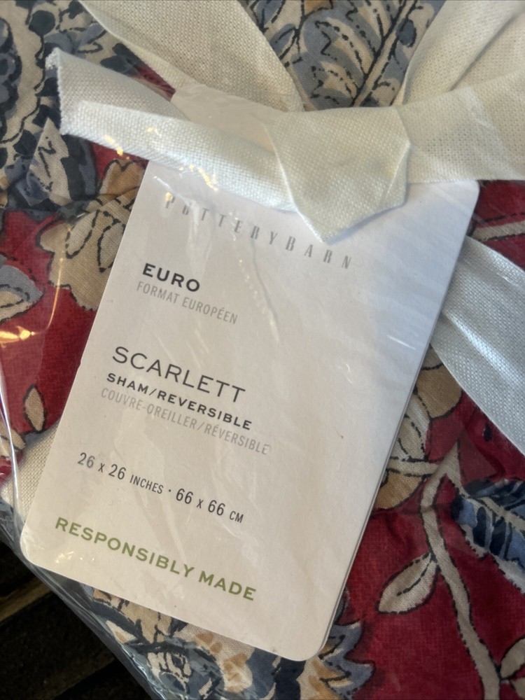This is a Pottery Barn Scarlett Euro Sham in red, featuring a floral pattern and a square shape. Made of 100% cotton with 100% polyester fill material, it is quilted and reversible. The sham measures 26 inches in length and width and is part of the Pottery Barn Scarlett collection. It is machine washable and designed for use in the bedroom.