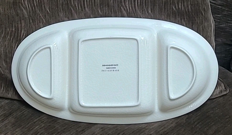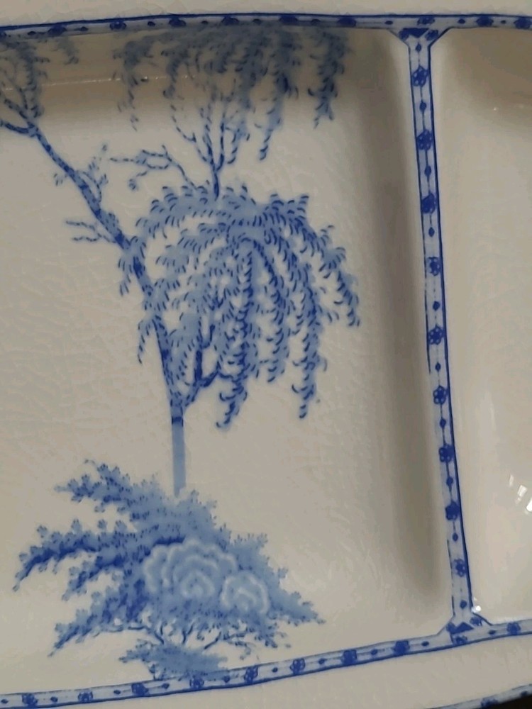 Pottery Barn SOPHIA 3 compartment divided serving dish. In perfect never used condition. Measures 14.75" x 7.5" and 1.75" tall. Blue design with a crackle finish. Have matching pieces in other listing...