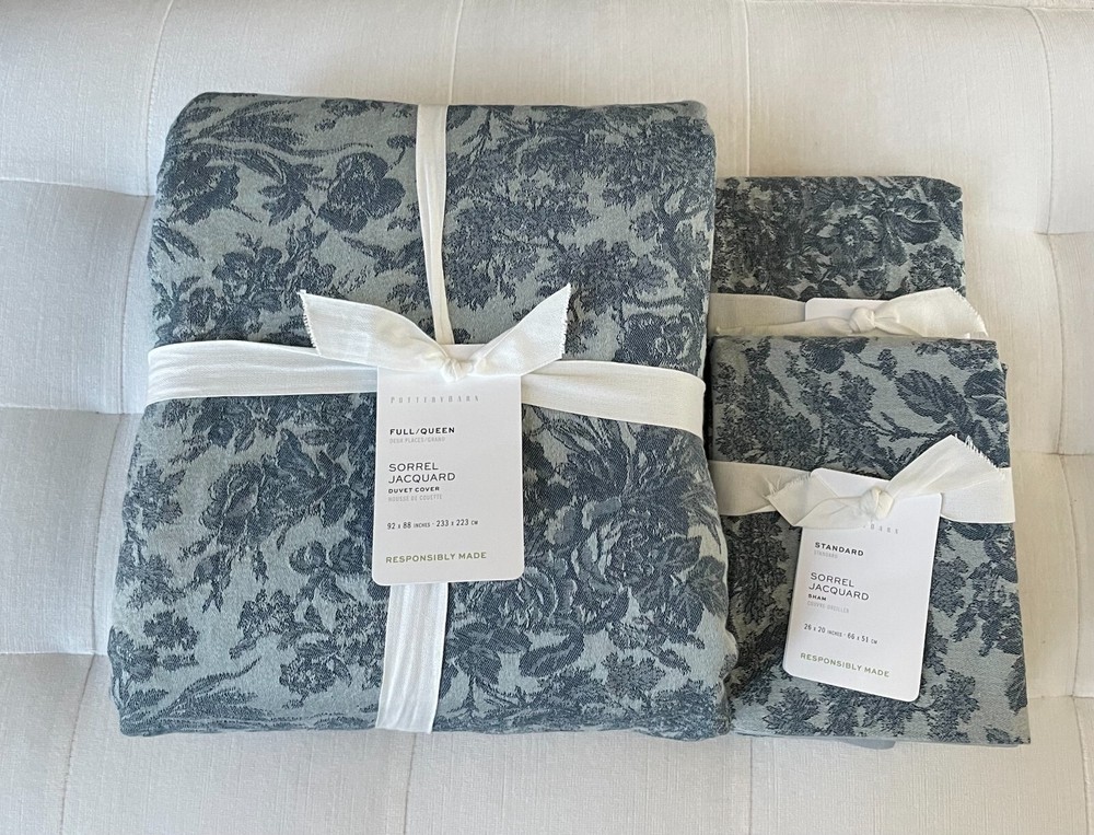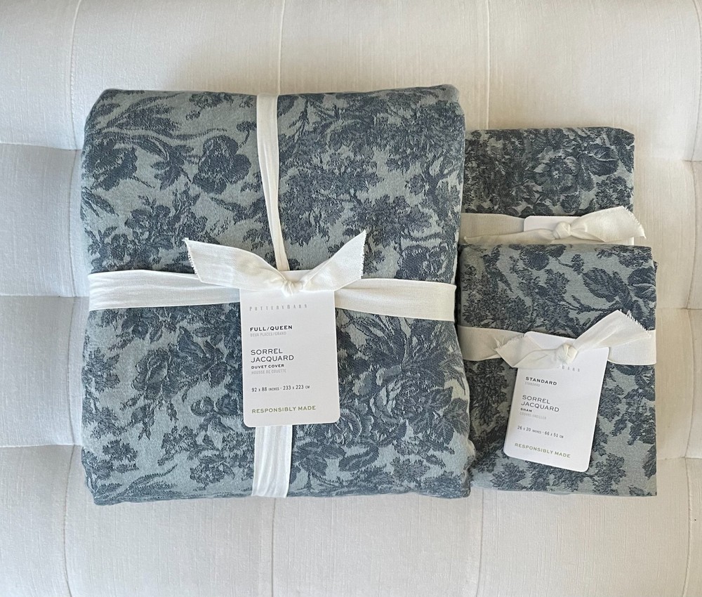 Pottery Barn SORREL TOILE JACQUARD Duvet Cover Full/Queen & 2 Standard Shams Dark Blue New with Tag PB describes as: Sorrel is a classically beautiful choice for the bed. In traditional toile style, the pattern features a mix of flora and fauna in a jacquard weave for gorgeous texture. Crafted from slubbed cotton, it comes in a range of beautiful colors, too. Made from 100% cotton; reverses to 100% cotton sheeting. Reverses to solid color. OEKO-TEX® STANDARD 100: tested for 1000+ harmful substances. 14.HUS.42449 HOHENSTEIN HTTI. Made in a Fair Trade Certified™ factory, empowering workers who made it. By choosing our cotton products, you’re supporting our investment in Better Cotton’s mission. This product is sourced via mass balance and therefore may not contain Better Cotton. Duvet features a hidden button closure with inner ties that keep insert in place; sham features an envelope closure. Imported Machine wash in warm water; gentle cycle. Use only non-chlorine bleach, if needed. Tumble dry on a low temperature. Warm iron as needed. Full/Queen Duvet: 88" l x 92" w Standard Sham: 20" w x 26" l Pet & Smoke free Ships within 1 business Thank you!