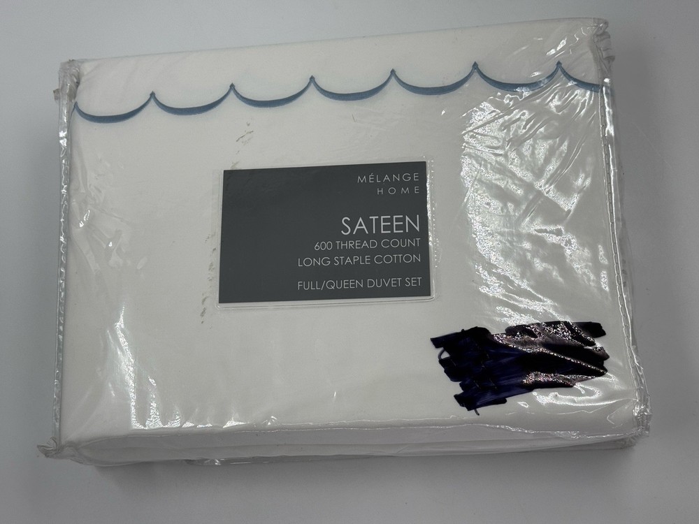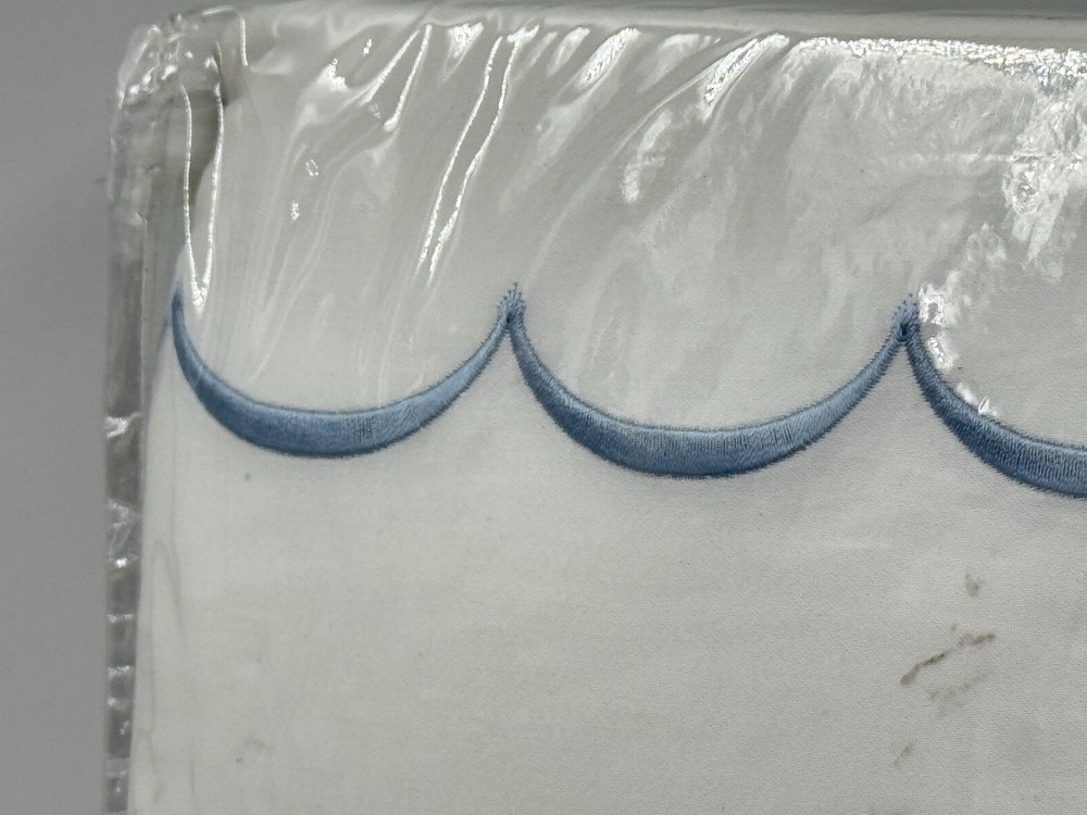 Pottery Barn Sadee Embroidered Queen Duvet Cover w/2 shams, Blue Scalloped Manufactured by Melange Home and sold by Pottery Barn as the Sadee set. Markings on package. Made from 100% sateen cotton. 600-thread count. Features embroidered duvet edge. Duvet cover features a hidden button closure with inner ties that keep the insert in place; sham features an envelope closure. Duvet: 90x90” Shams: 20x26”