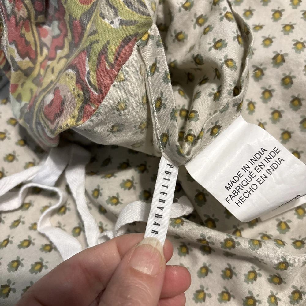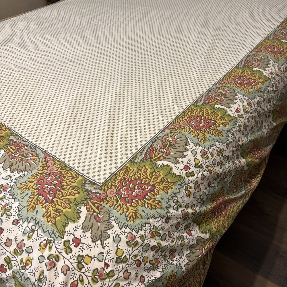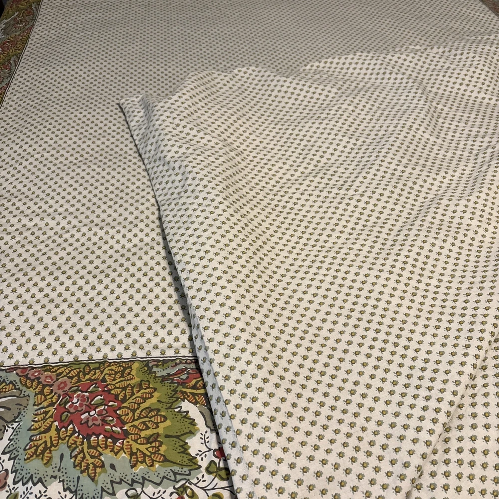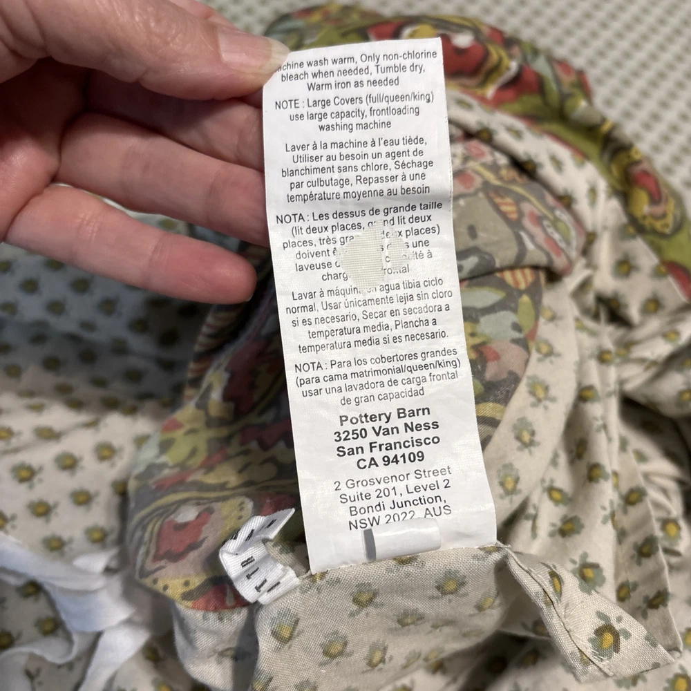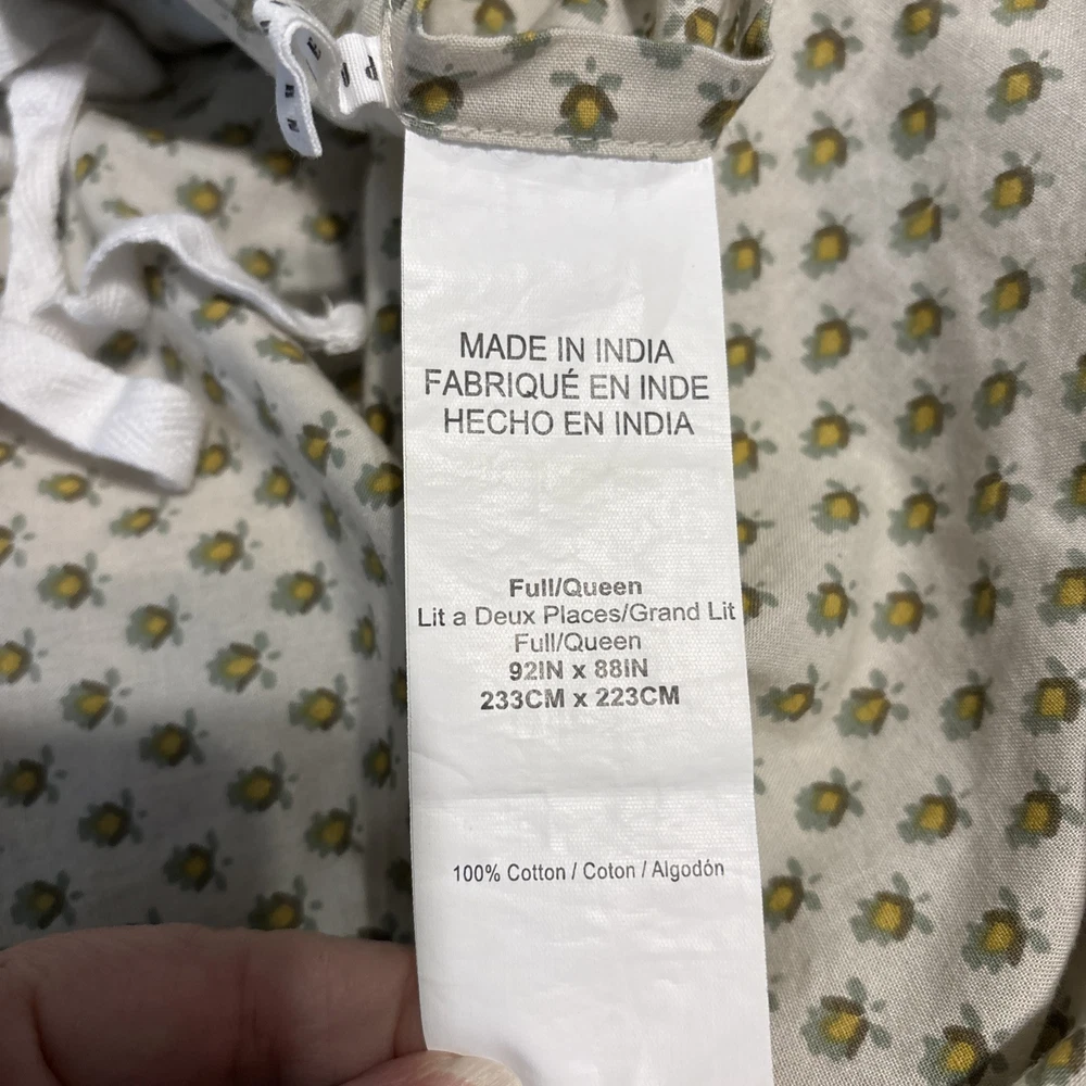 This full/queen size duvet from Pottery Barn is called Salinas and features pretty earth tone colors in a French Provencal style. All buttons are present and working properly. There is one small spot shown in pictures with pen. See all photos.