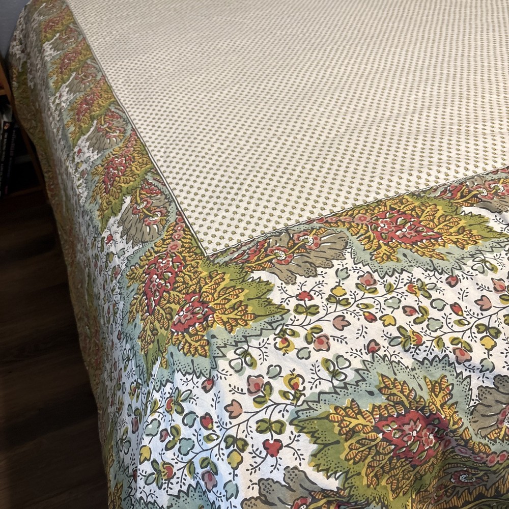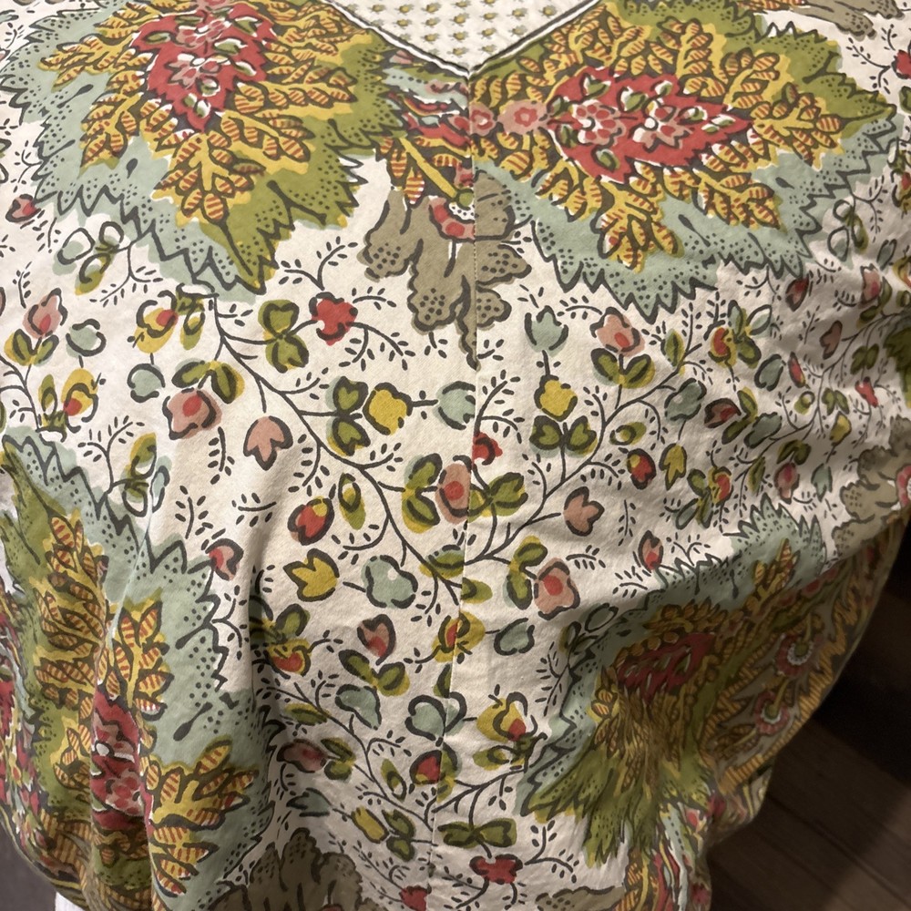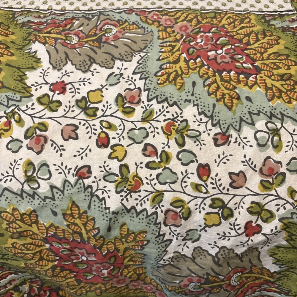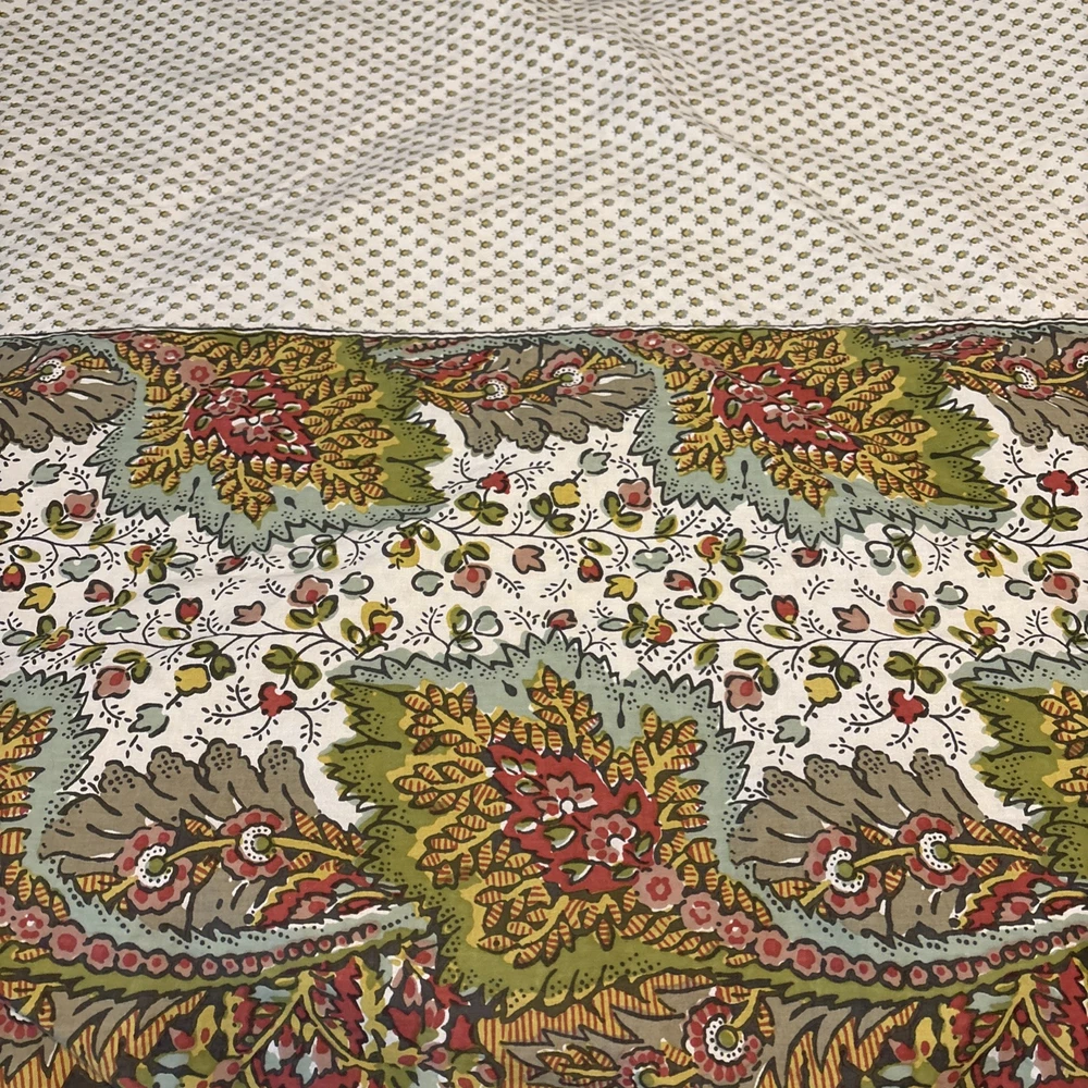 This full/queen size duvet from Pottery Barn is called Salinas and features pretty earth tone colors in a French Provencal style. All buttons are present and working properly. There is one small spot shown in pictures with pen. See all photos.