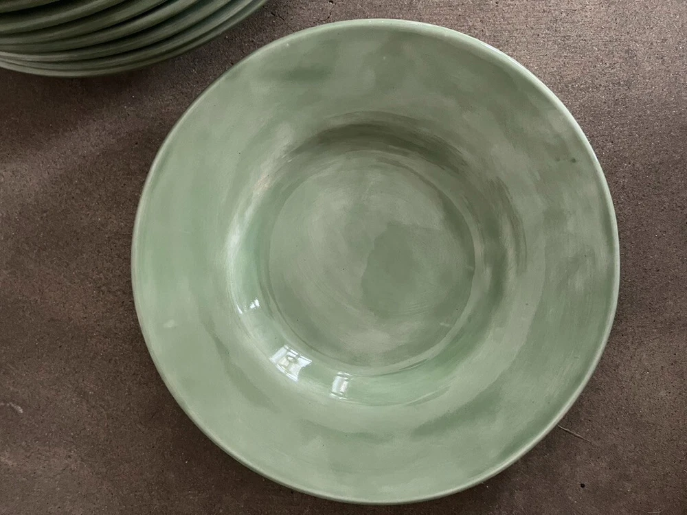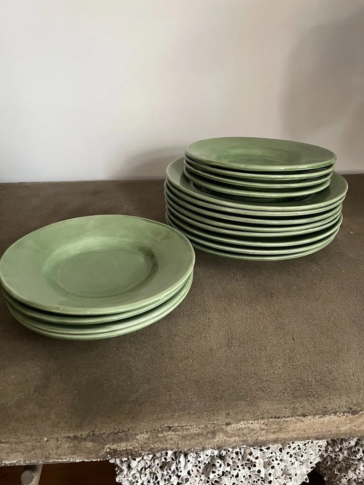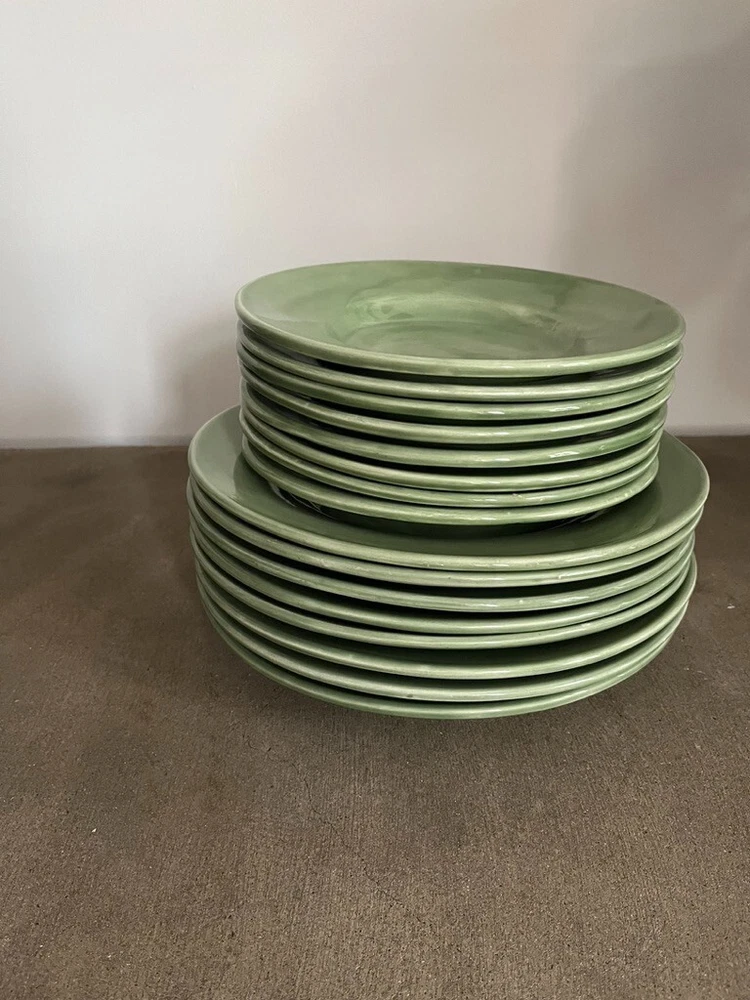This is a set of 16 Pottery Barn Sausalito (8) dinner and (8) salad plates in Sausalito Sage Green. The plates are round in shape, made of stoneware, and are microwave and dishwasher safe. The plates are part of the Pottery Barn Sausalito product line, and are discontinued. Message me with any questions. I am happy to take additional photos upon request.