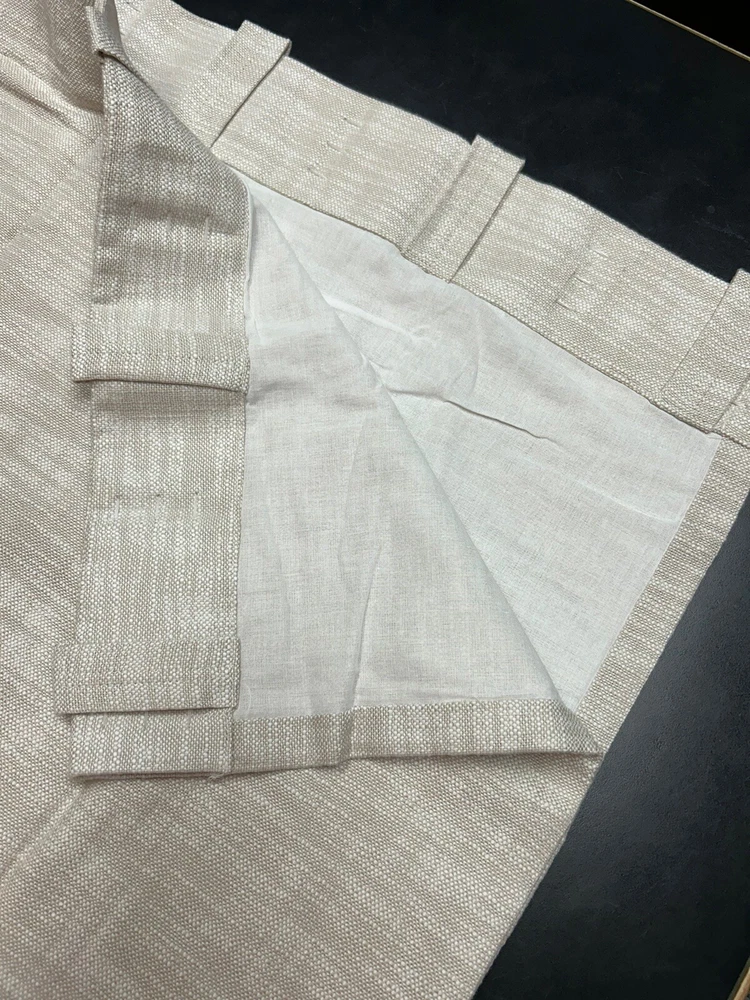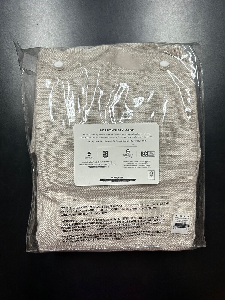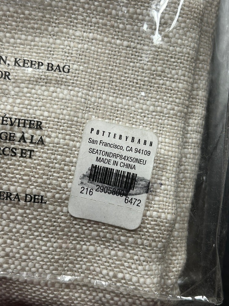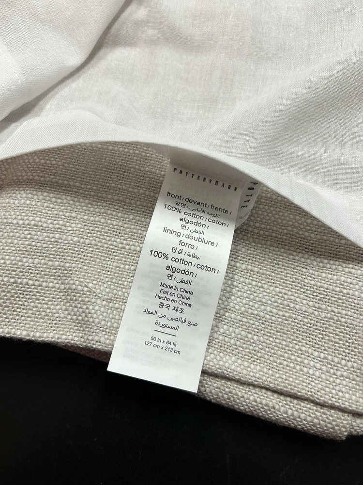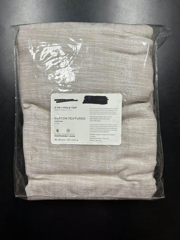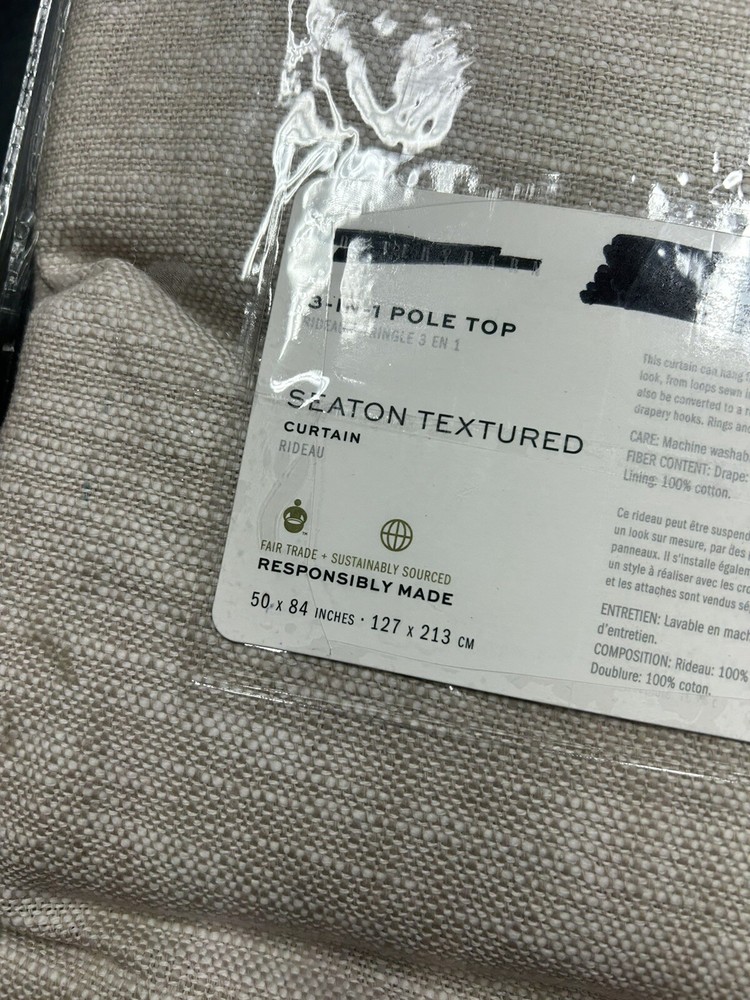 Gorgeous curtain panel from Pottery Barn's Seaton Textured Cotton Drapery collection in 'oatmeal' beige. Beautiful textured cotton fabric with cotton lining. Appears to be new in package. Fabric feels crisp and new and is still wrapped around cardboard. It shows no signs of use or wear. Missing drapery hooks. One panel oatmeal 100% cotton with light filtering cotton lining 84" long by 50" wide 3-in-1 style top with options for rod pocket, tabs or drapery hooks/rings Current retail price $109