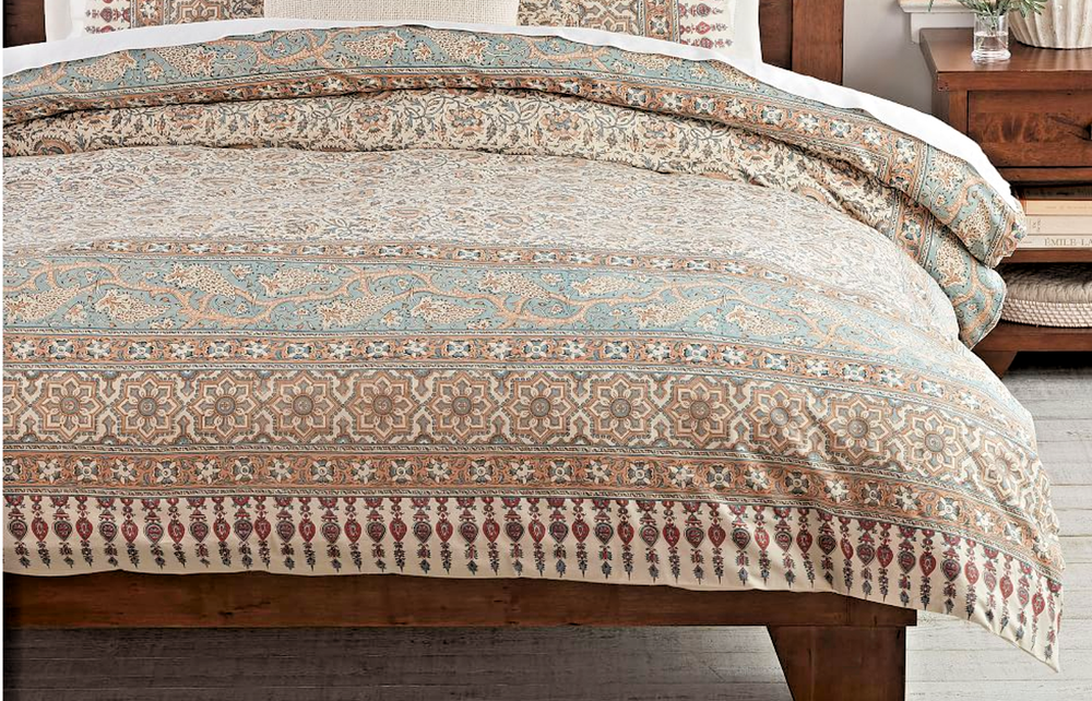 Enhance your bedroom with the Pottery Barn Selena Kalamkari Duvet Cover, a testament to classic French Country style. This king-size duvet cover boasts a vibrant multicolor floral medallion pattern that brings a touch of elegance and warmth to any space. Crafted from luxurious cotton, it promises comfort and durability. The rectangular shape measures a generous 108 inches in length and 92 inches in width, ensuring a perfect fit for your king-sized bed. The duvet cover features an easy-to-close button closure, allowing for effortless maintenance. Proudly made in India, it adds a touch of global sophistication to your bedding ensemble.