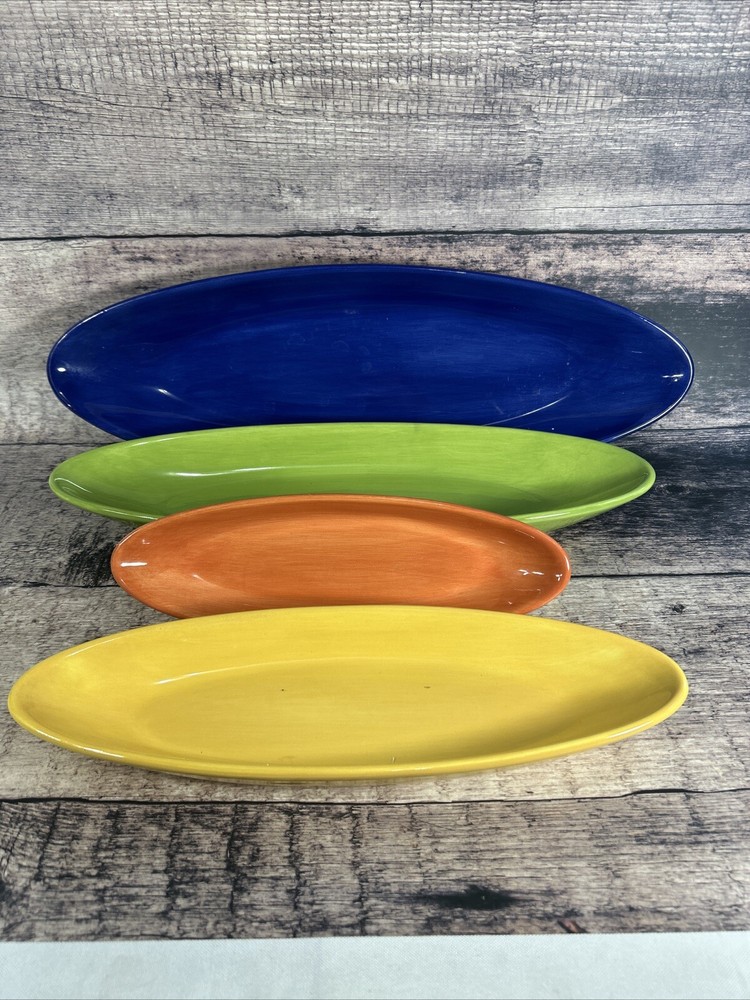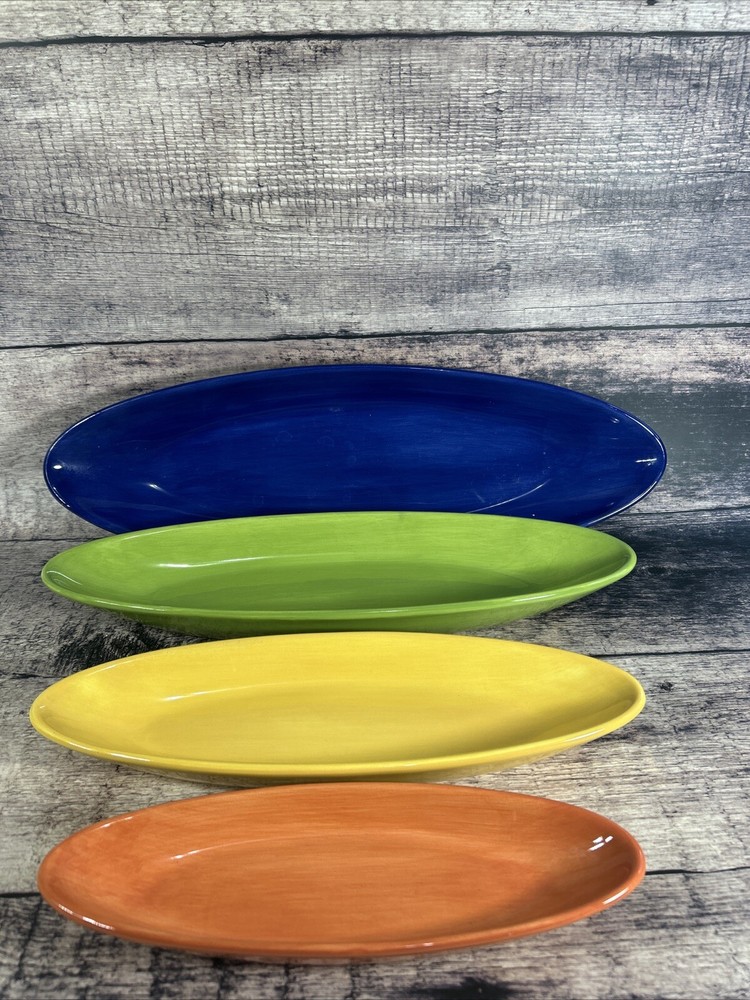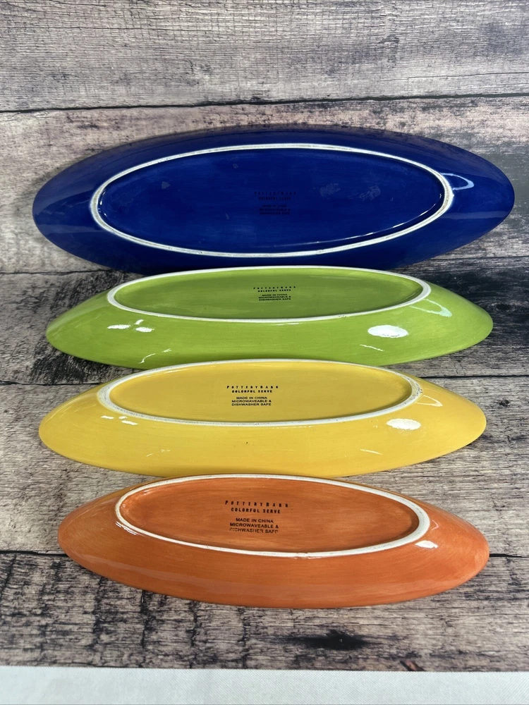 Add a splash of color to your dining table with this set of four Pottery Barn serving platters. Crafted from high-quality ceramic, these platters are perfect for serving up your favorite dishes in style. The colorful design is sure to impress your guests and elevate your dining experience. Ideal for both daily use and special occasions, these platters are a must-have addition to any kitchen or dining room.