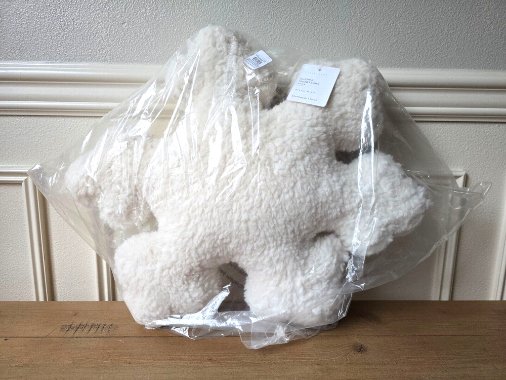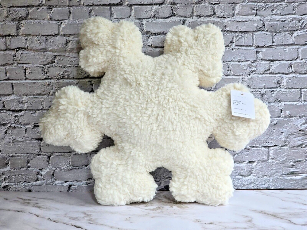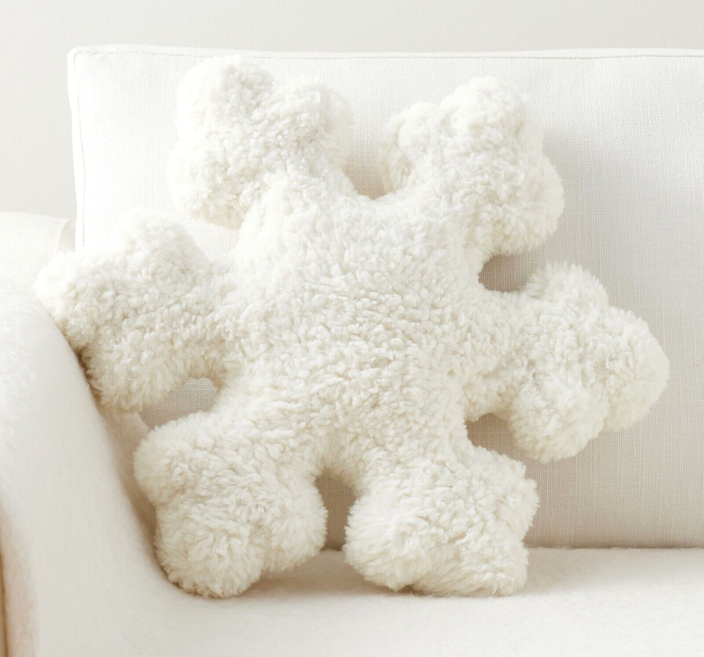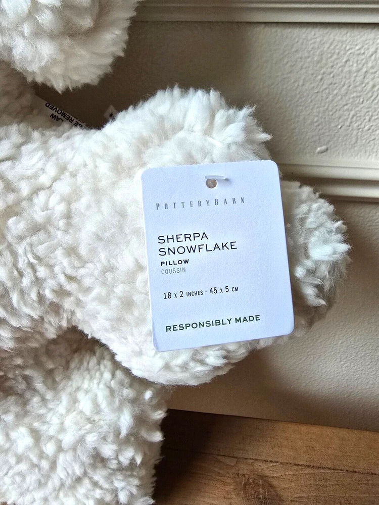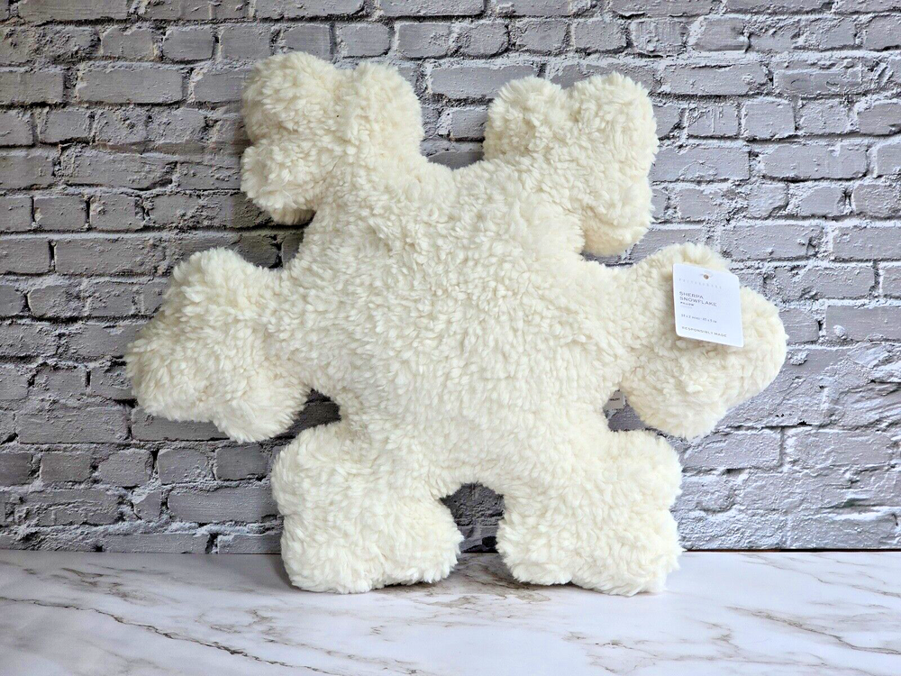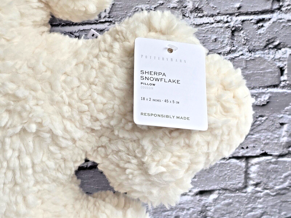 Pottery Barn Sherpa Snowflake Pillow Brand New in the Original Packaging Crafted of our coziest sherpa, our snowflake pillow makes every day a snow day. Its whimsical shape offers an effortless way to add even more character to your holiday pillowscape. Made of 100% recycled polyester, reverses to same. Polyester fill. Imported. Spot clean with soft, damp cloth. Blot to remove excess water. Air dry. Overall: 18" diam, 18" h Thank you very much for visiting!