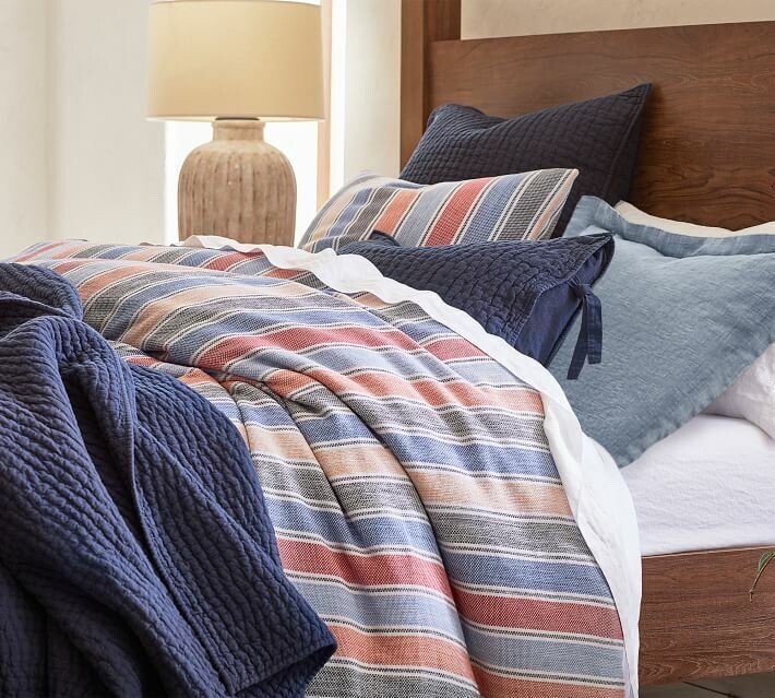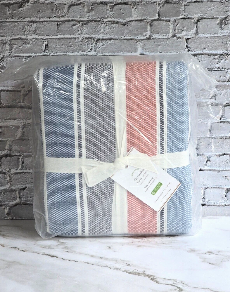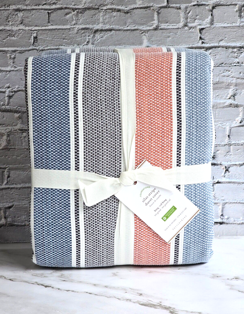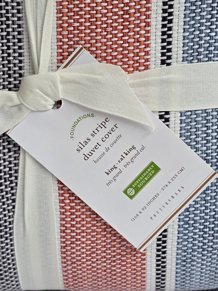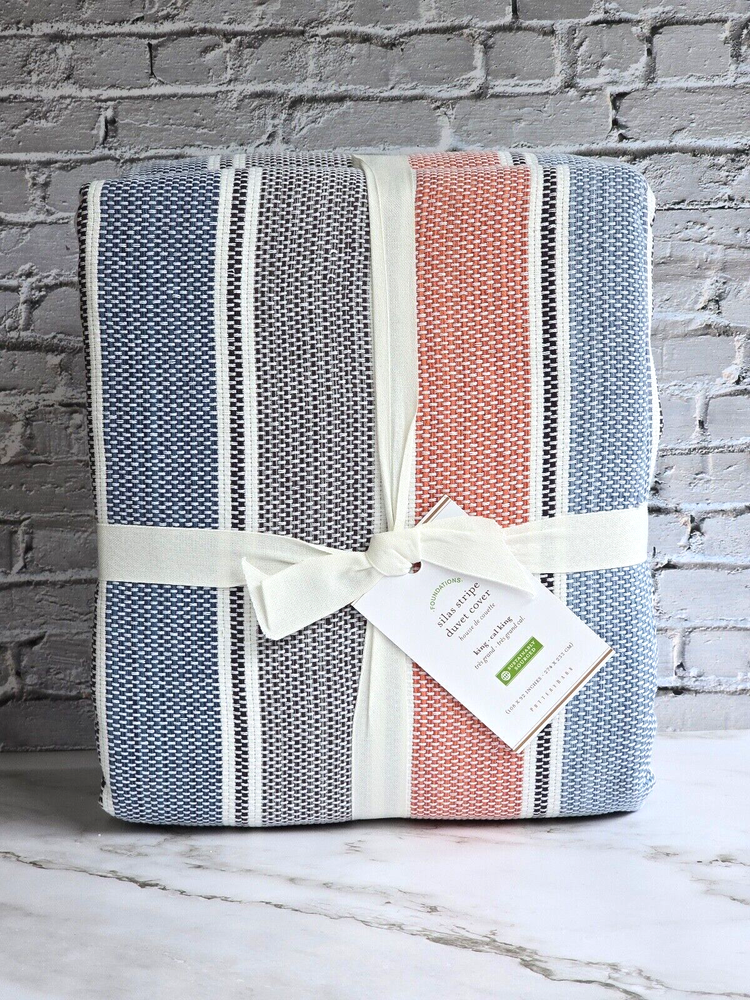 Pottery Barn Silas King Duvet Brand New in Original Packaging Dream in color. This Silas bedding is crafted of thick cotton for a rustic feel, with muted colors and worn markings that resemble an heirloom. 100% cotton Button closure and interior ties to help keep insert in place Reverses to solid white Machine wash cold; gentle cycle Tumble dry low; remove promptly Warm iron if needed King/Cal.King: 92" long x 108" wide Thank you very much for visiting!