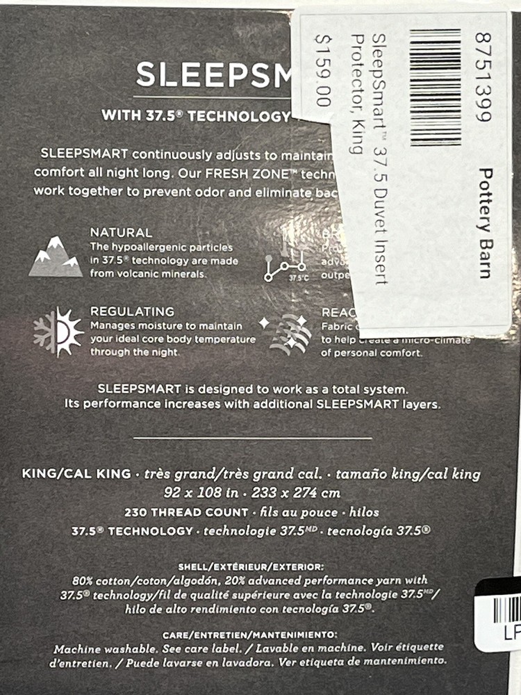 Brand New And In The Package Pottery Barn Sleepsmart 37.5 Technology Temperature Regulating Duvet Insert Protector King/Cal.King Brand New in the package Retails for $159. + tax 1 duvet insert protector king/cal.king----92" long X 108" wide----233 X 274 cm Color--White Exclusive SleepSmart bedding continuously adjusts to help maintain a climate of personal comfort at the ideal temperature of 37.5° Celsius all night long, so you can wake up rested and refreshed. This duvet insert is also designed with two layers of dry protection. PRODUCT DETAILS Construction Shell is woven of 80% cotton and 20% 37.5° performance polyester. 37.5° activated carbon particles absorb odor molecules to keep your bedding smelling fresh. Sleepsmart 37.5 technology uses naturally derived fibers that work continuously to trap heat when cold or evaporate excess humidity when warm before sweat can form. Sleepsmart is designed to work as a total system, its performance increases with additional Sleepsmart™ bedding layers. Sleepsmart™ high-performance properties last the life of the product. Allergen barrier weave is breathable yet resists allergens from entering into your bedding. 230 thread count Zipped closure and corner ties for easy attachment to your duvet insert. As you sleep, temperature and humidity build-up and become trapped in your sleep environment or microclimate. This is where you start to feel overheated and uncomfortable and eventually disrupt your rest. Body heat-activated performance. Comfort personalized to each sleeper's need for warmth, so you stay asleep longer. Duvet Cover and duvet insert are sold separately. Imported.+ CARE Machine wash and dry. Do not use fabric softener or dryer sheets. DIMENSIONS King/Cal. King Duvet Insert Protector: 92" l x 108" w