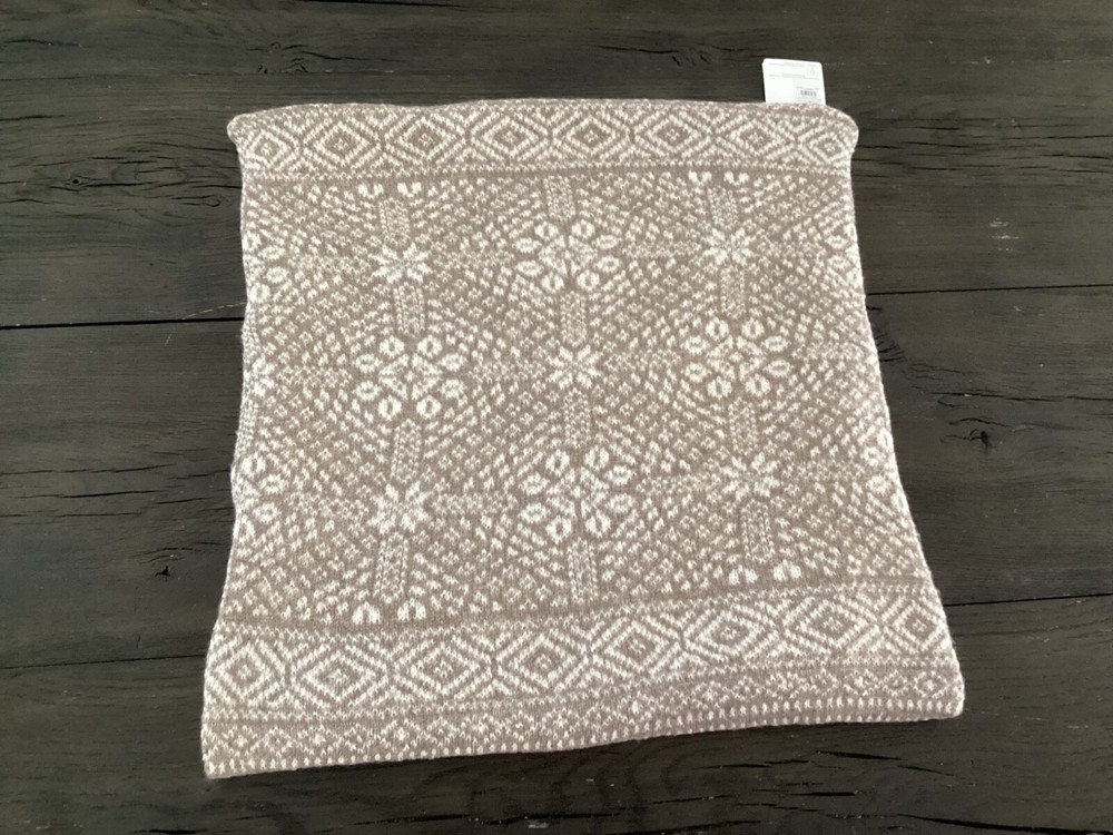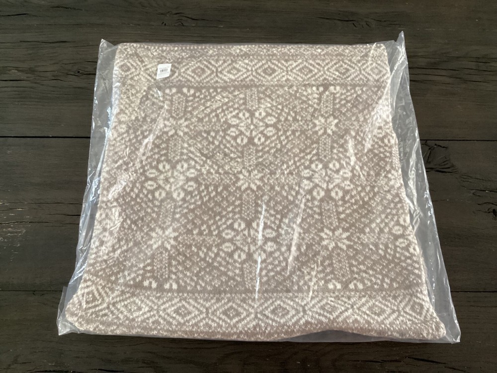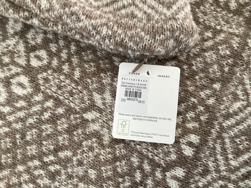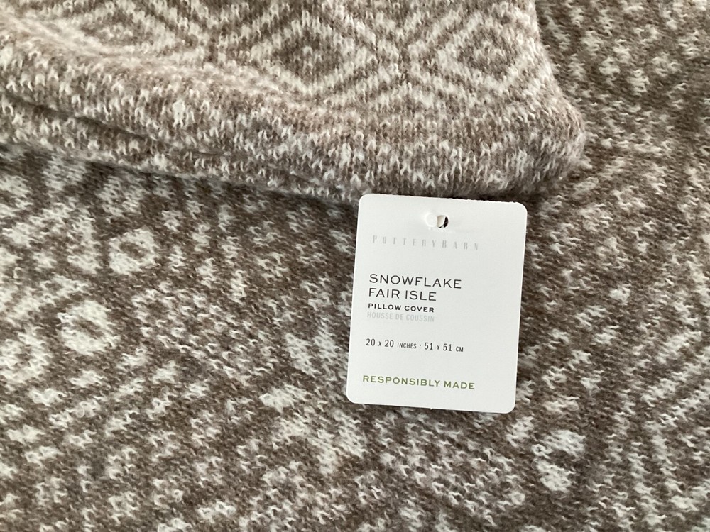 New Pottery Barn Snowflake Fair Isle Knit Pillow cover. This comes from a smoke free and pet free home. Check out our other listings as we can combine shipping. Made of 50% recycled polyester and 50% polyester. Reverses to same. Zipper closure. Accommodates 20" square insert. Sold separately. Imported. CARE Machine wash in cold water; gentle cycle. Only use non-chlorine bleach, if needed. Tumble dry on low heat; remove promptly. Warm iron as needed. DIMENSIONS Overall: 20" sq