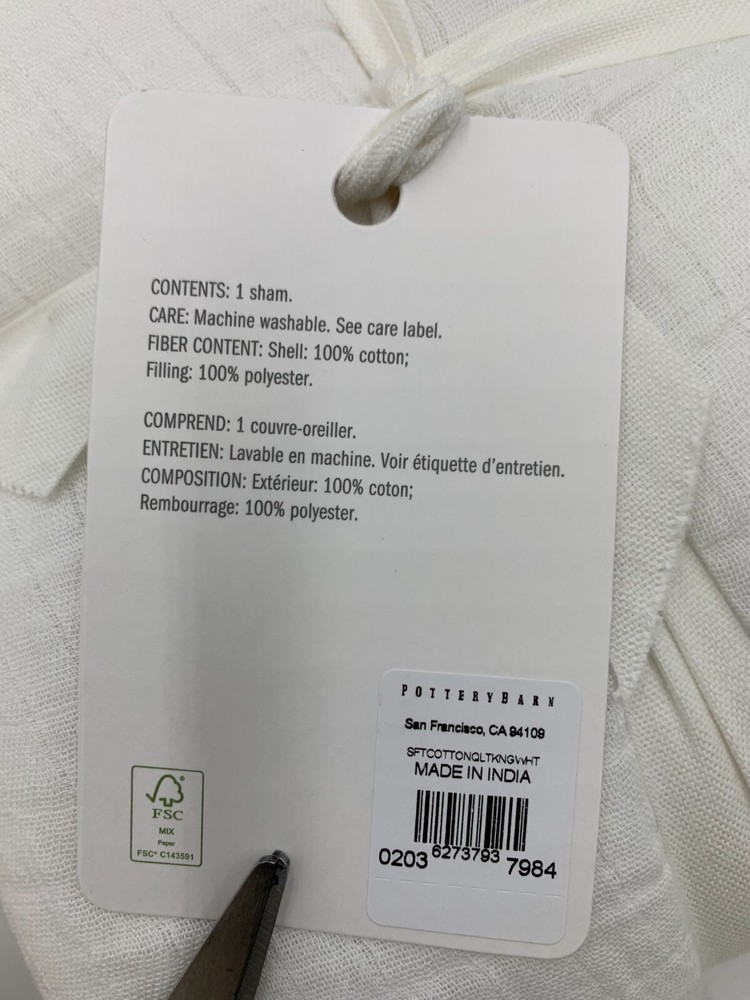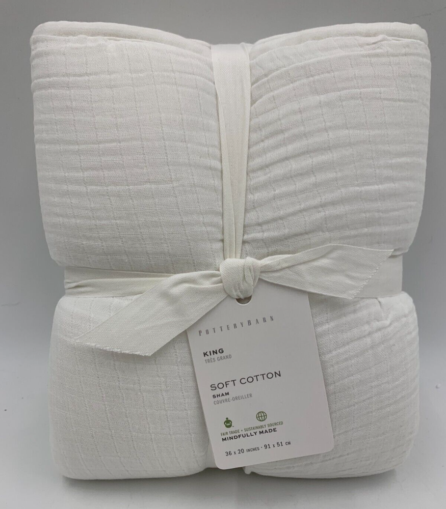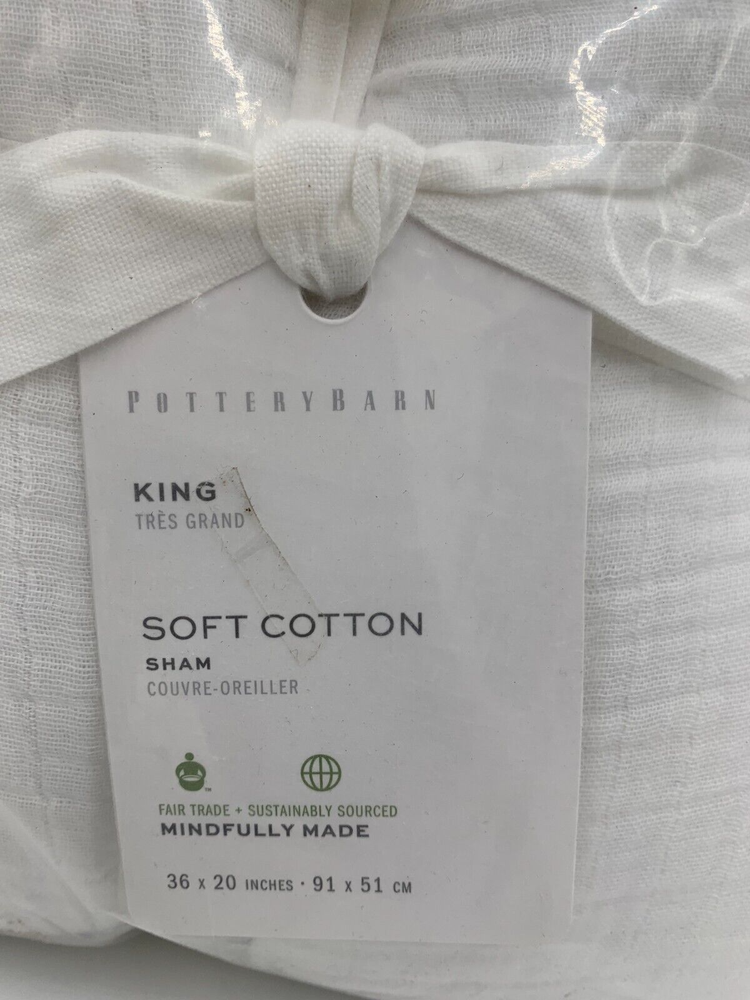 Pottery Barn Soft Cotton Handcrafted Sham Item is brand new Auction includes: 1 sham PRODUCT DETAILS CONSTRUCTION Made from 100% cotton. Yarn-dyed fiber has incredibly rich color that holds its vibrancy over time. Sham features an envelope closure. Sham reverses to 200-thread count cotton weave. By choosing our cotton products, you’re supporting our investment in Better Cotton’s mission. This product is sourced via mass balance and therefore may not contain Better Cotton. Learn more at bettercotton.org/massbalance. Sham and insert sold individually. Imported. Standard Sham: 20" h x 26" w Euro Sham: 26" sq King Sham : 20" h x 36" w CARE Machine wash in cold water; gentle cycle. Only non-chlorine bleach when needed. Tumble dry on low heat; remove promptly. Warm iron as needed.