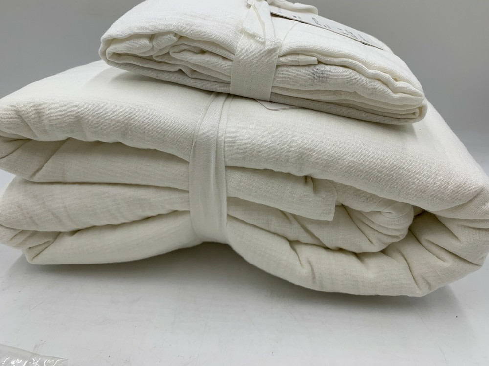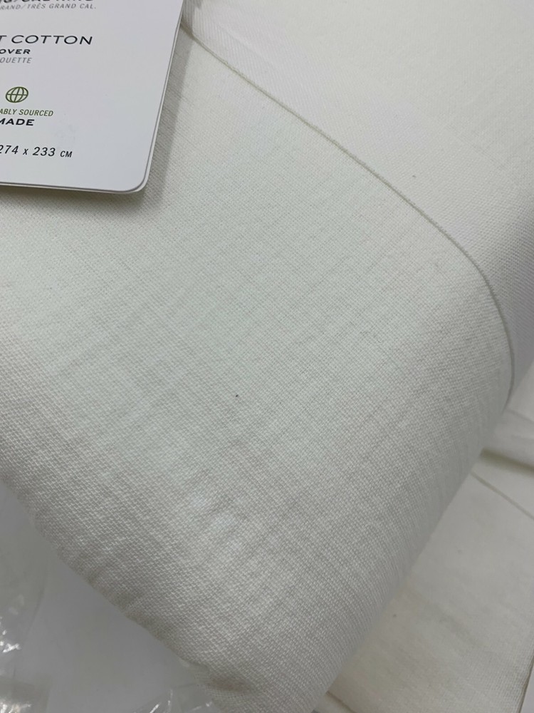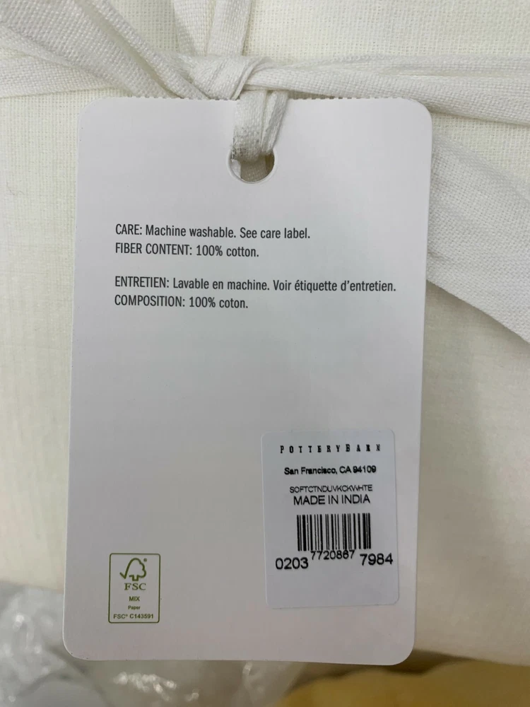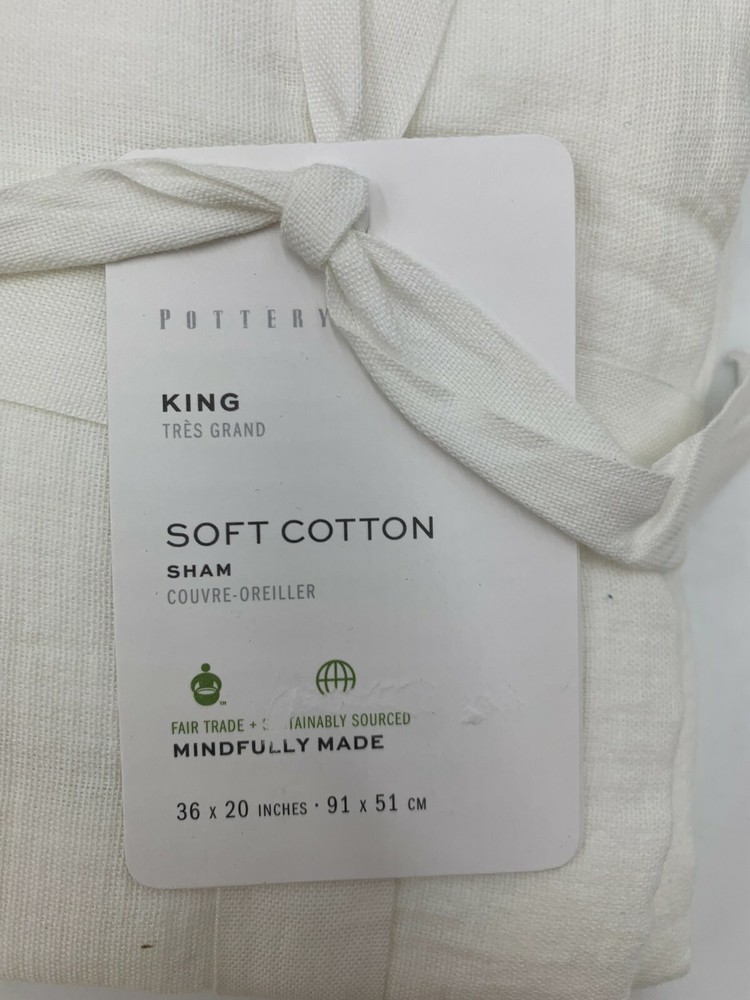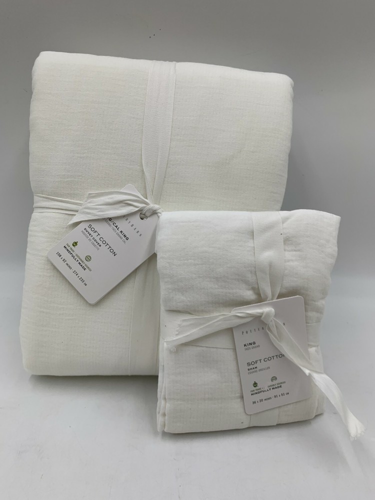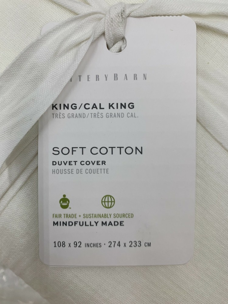 Pottery Barn Soft Cotton King California King Duvet Cover w1 King Sham 7829C Item is brand new. Auction includes one duvet cover and one sham. Woven of 100% organic cotton. Duvet features a hidden button closure with inner ties that keep insert in place; sham features an envelope closure. Reverses to same. Machine wash. Imported. DIMENSIONS Duvet Cover King/Cal King: 92" l x 108" w Sham King: 20" h x 36" w CARE AND MAINTENANCE Machine wash in warm water, gentle cycle. Use only non-chlorine bleach when needed. Tumble dry on low heat; remove promptly. Warm iron as needed.