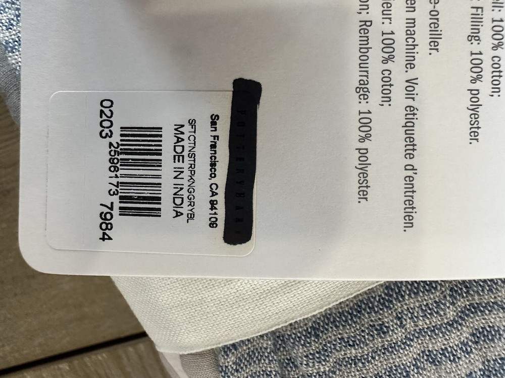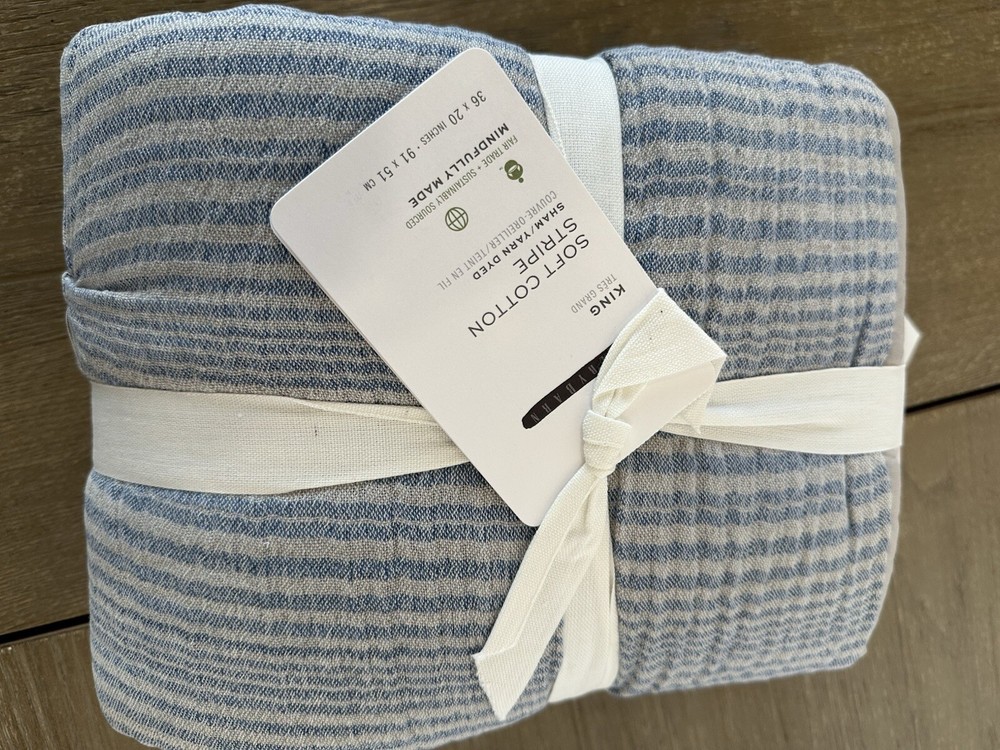 You are purchasing one Pottery Barn Soft Cotton King size sham color is blue and gray new, in package. just has a black line through the pb name on the paper tag...