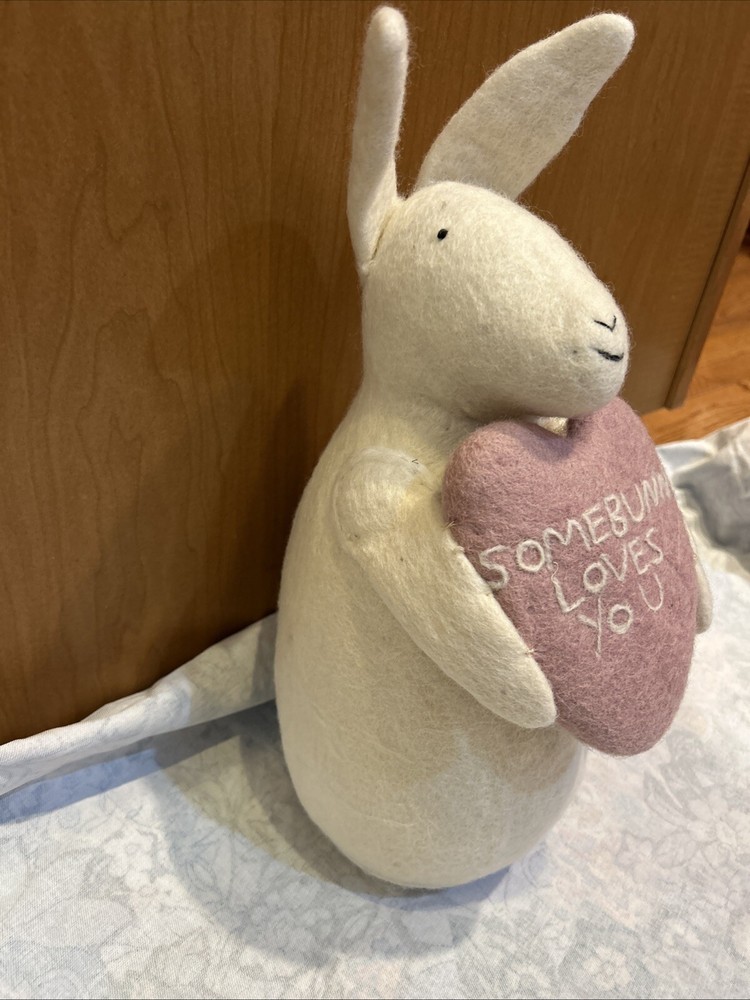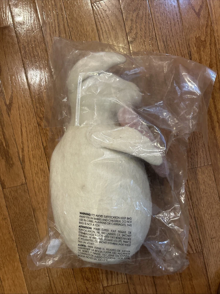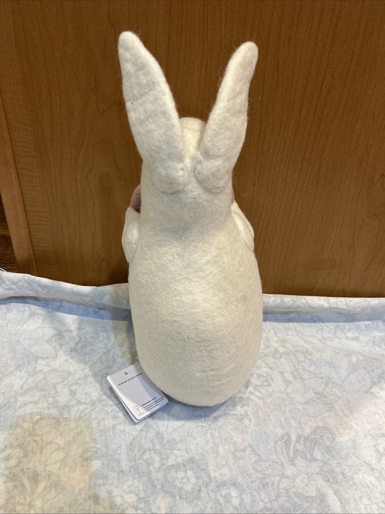 The product is a charming Pottery Barn Bunny Shaped Pillow featuring a hand-stitched design of an Easter bunny, perfect for adding a touch of whimsy to your home decor. The pillow is made of 100% wool in a white color, with a size of 6" wide by 17" high, making it a lovely decorative piece for the Easter season. The bunny theme and character of the pillow make it a delightful addition for those who love rabbits and Easter decorations.