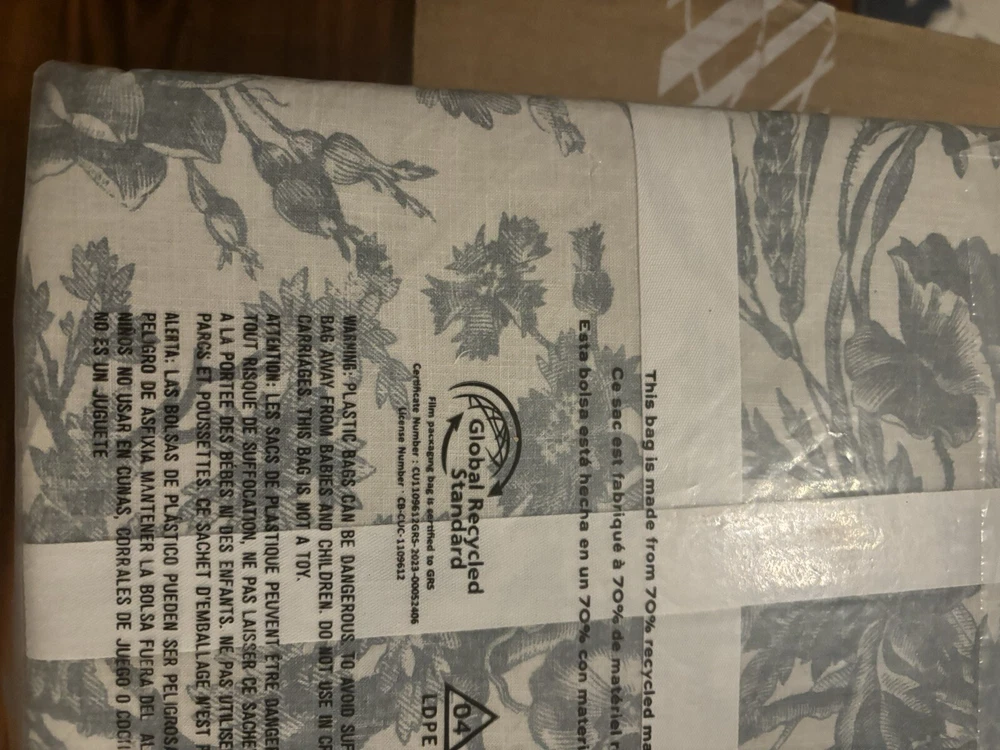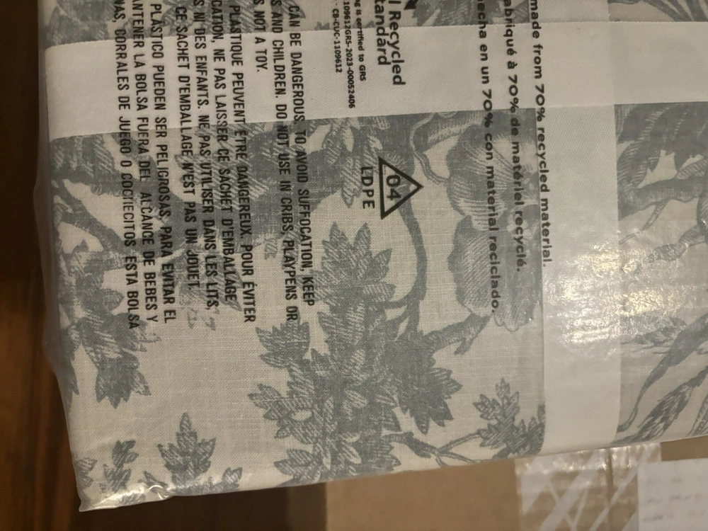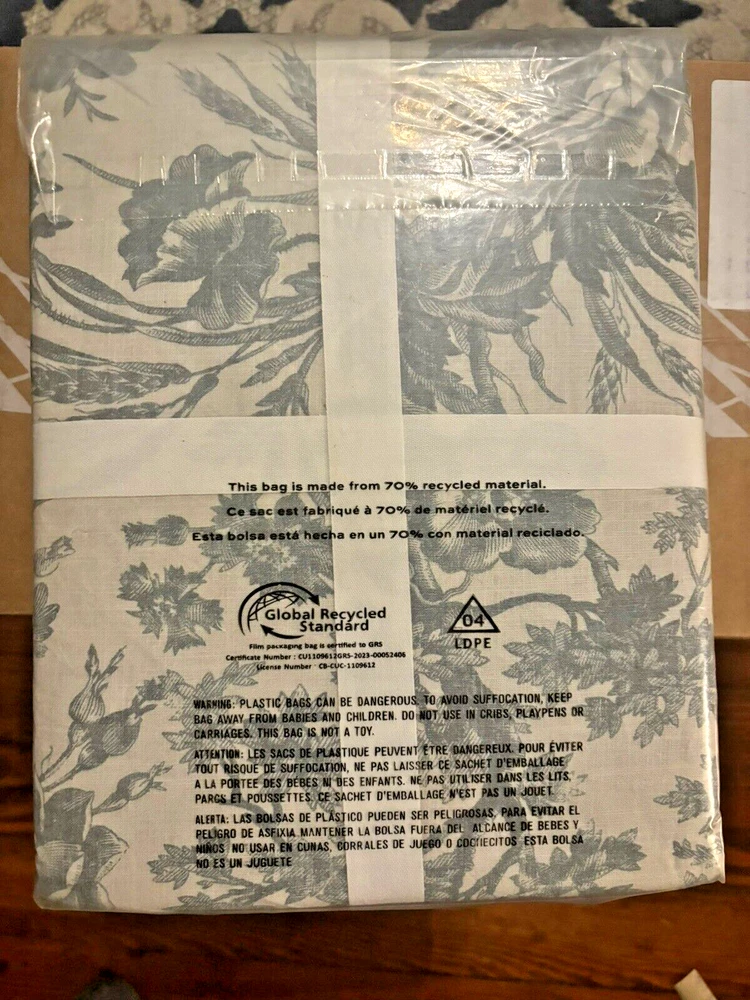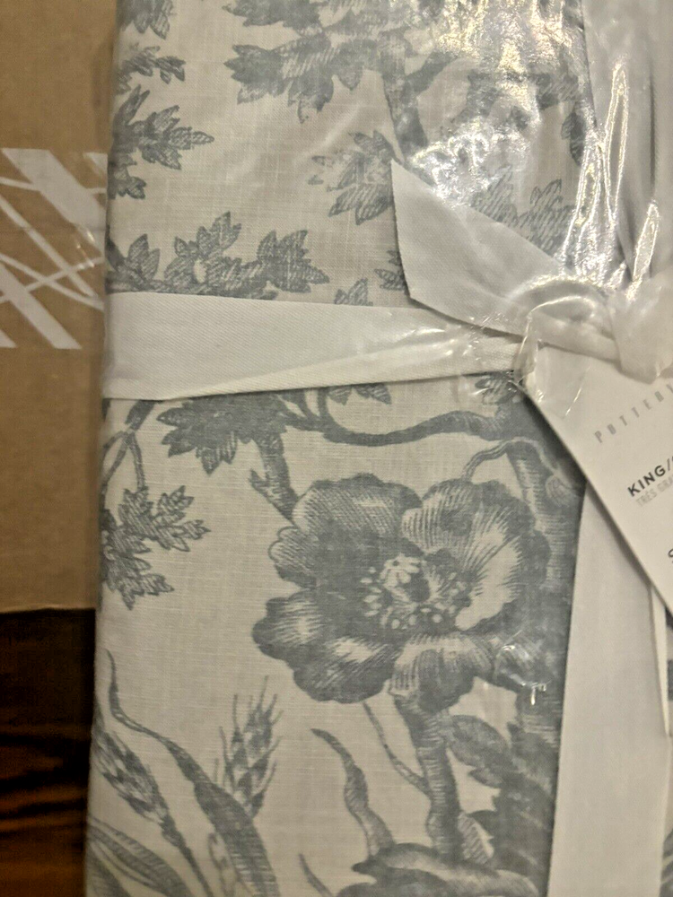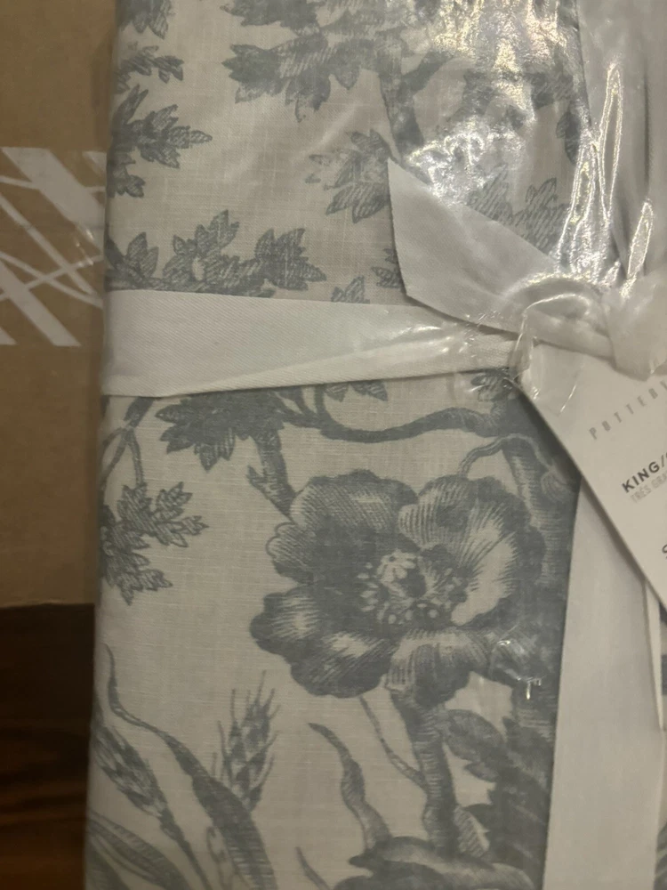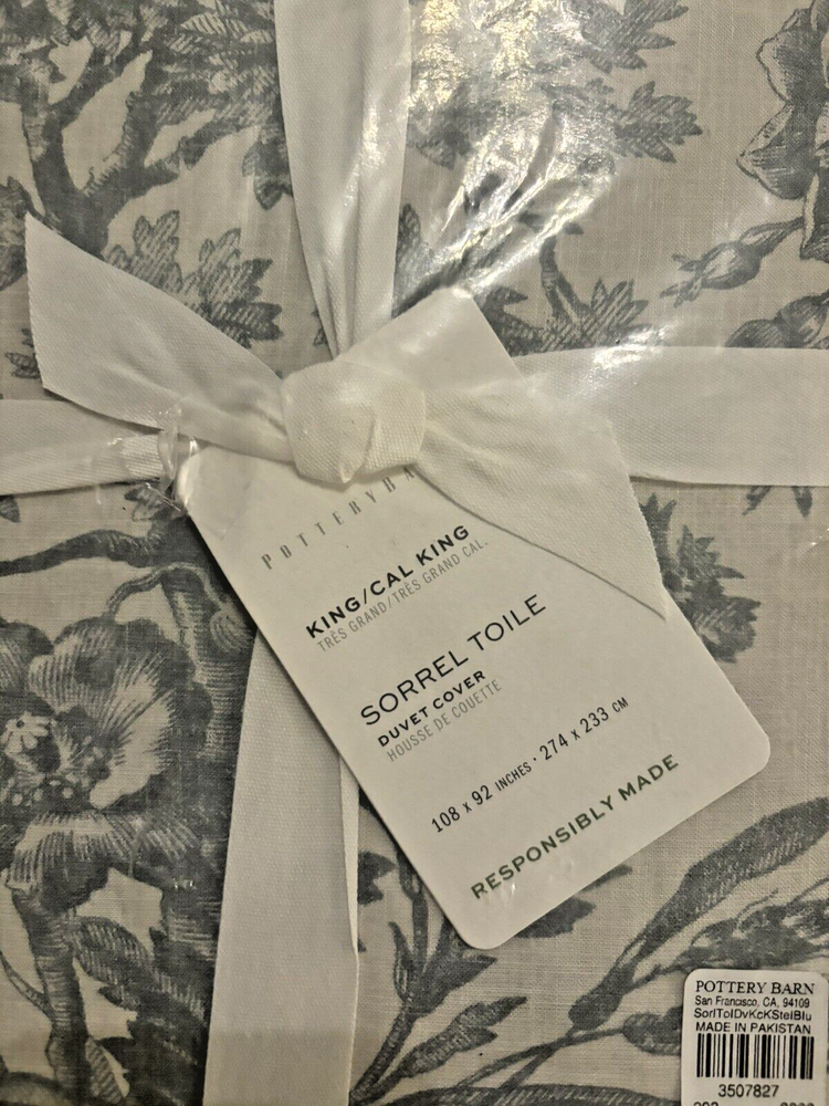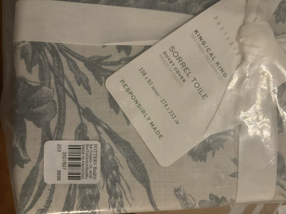 Brand new Duvet Cover (KING/CAL KING) . So soft and cheery! Was $289 Color is steel blue - very muted blue / gray. Cotton Sorrel is a classically beautiful choice for the bed. In traditional toile style, the pattern features a mix of flora and fauna that layers effortlessly. Crafted from slubbed cotton with subtle texture, it comes in a range of beautiful colors, too. machine wash. new!