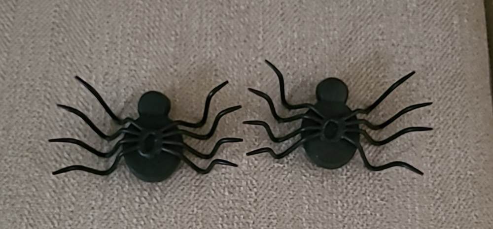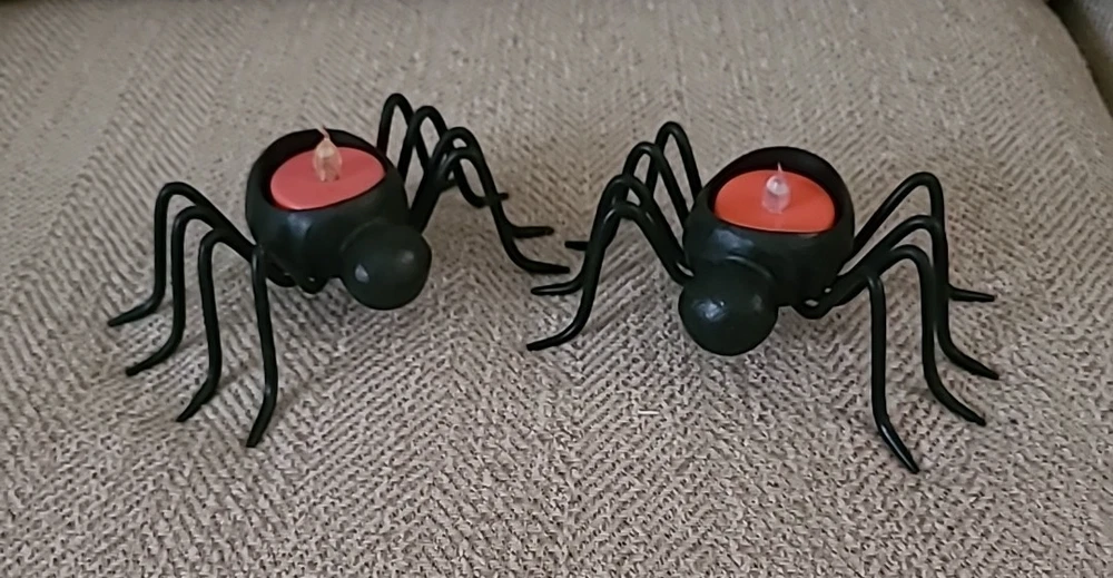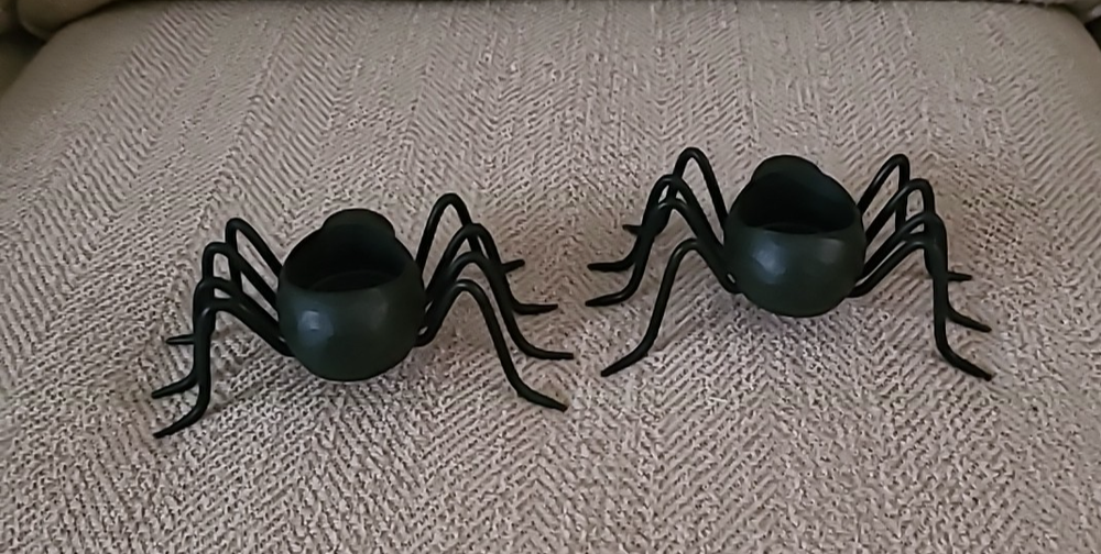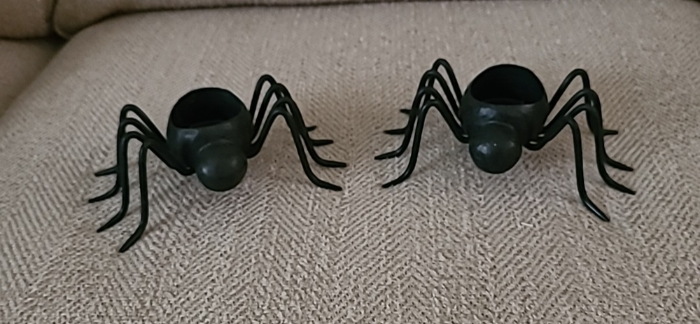 Brighten your Halloween decor with this Pottery Barn Iron Spider Candle Tea Light Holders Set of 2 for sale. Will include the 2 orange tealights I used (see photos), but they could use new batteries. The spiders each measure approximately 6" wide, 3 1/2" front to back and 2" tall. Smoke free home. I offer 2 different shipping options so you can choose. I share my ebay seller shipping discount with my buyers!