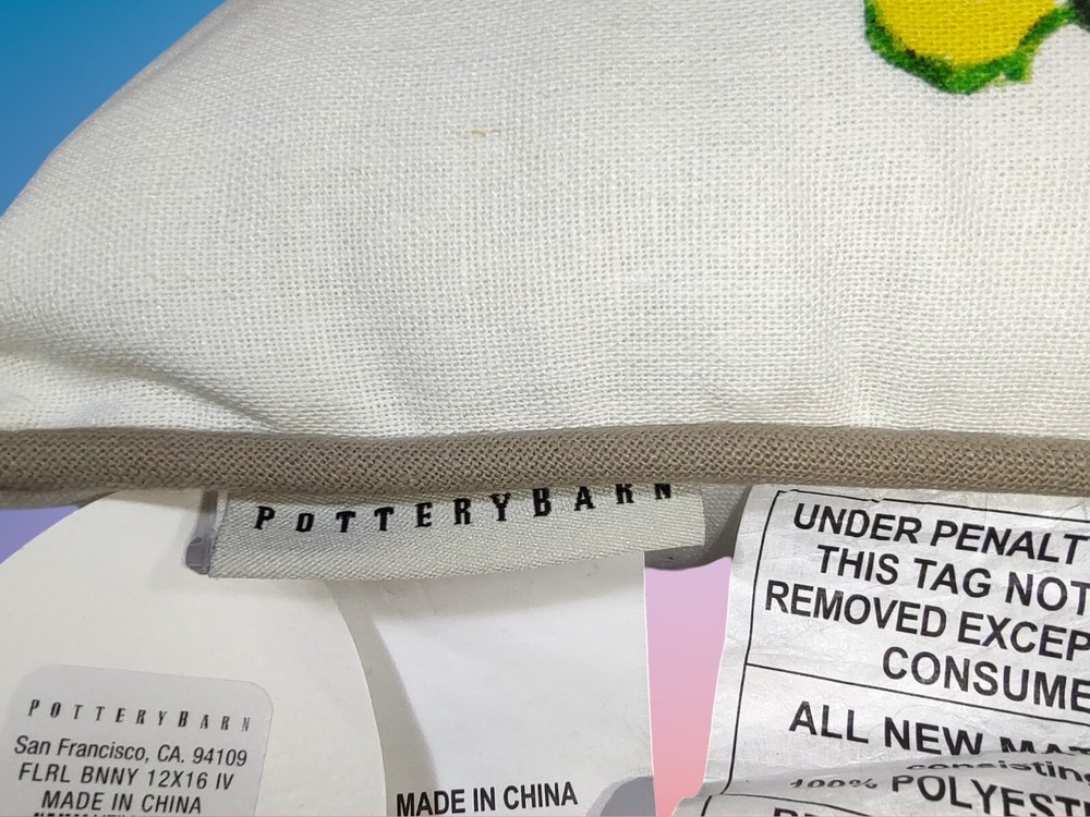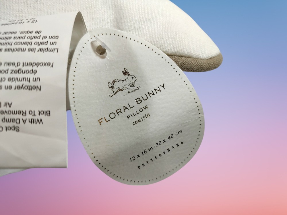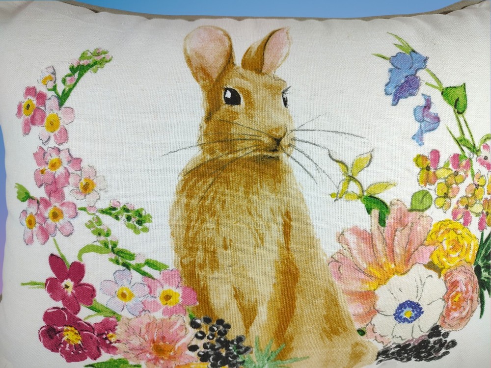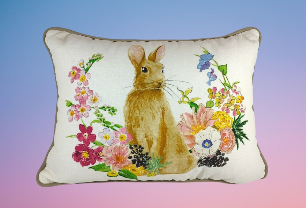 Pottery Barn Floral Bunny Lumbar Pillow Perfect for Spring with Rabbit Surrounded By Beautiful Colorful Flowers. The Pillow Measures 12 inches by 16 inches and Has Its Original Tag. The Shell is 55% Linen and 45% Cotton With 100% Polyester Filling.