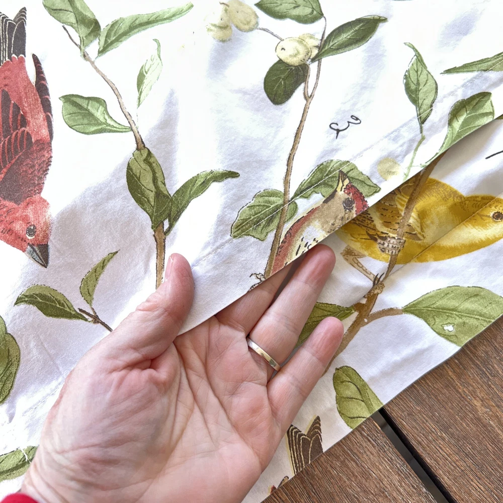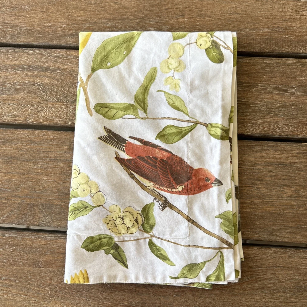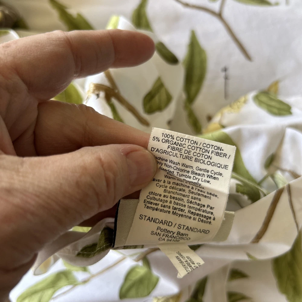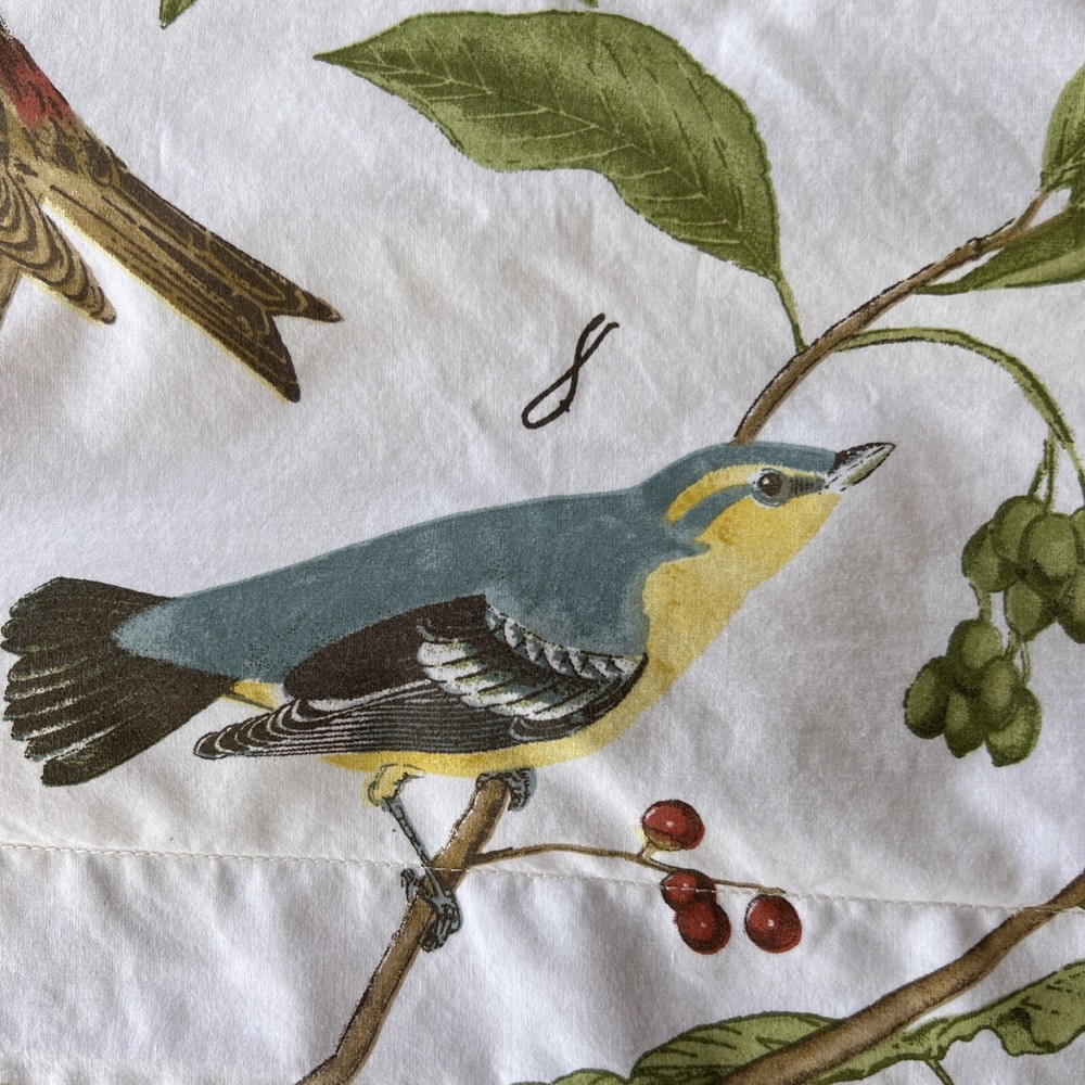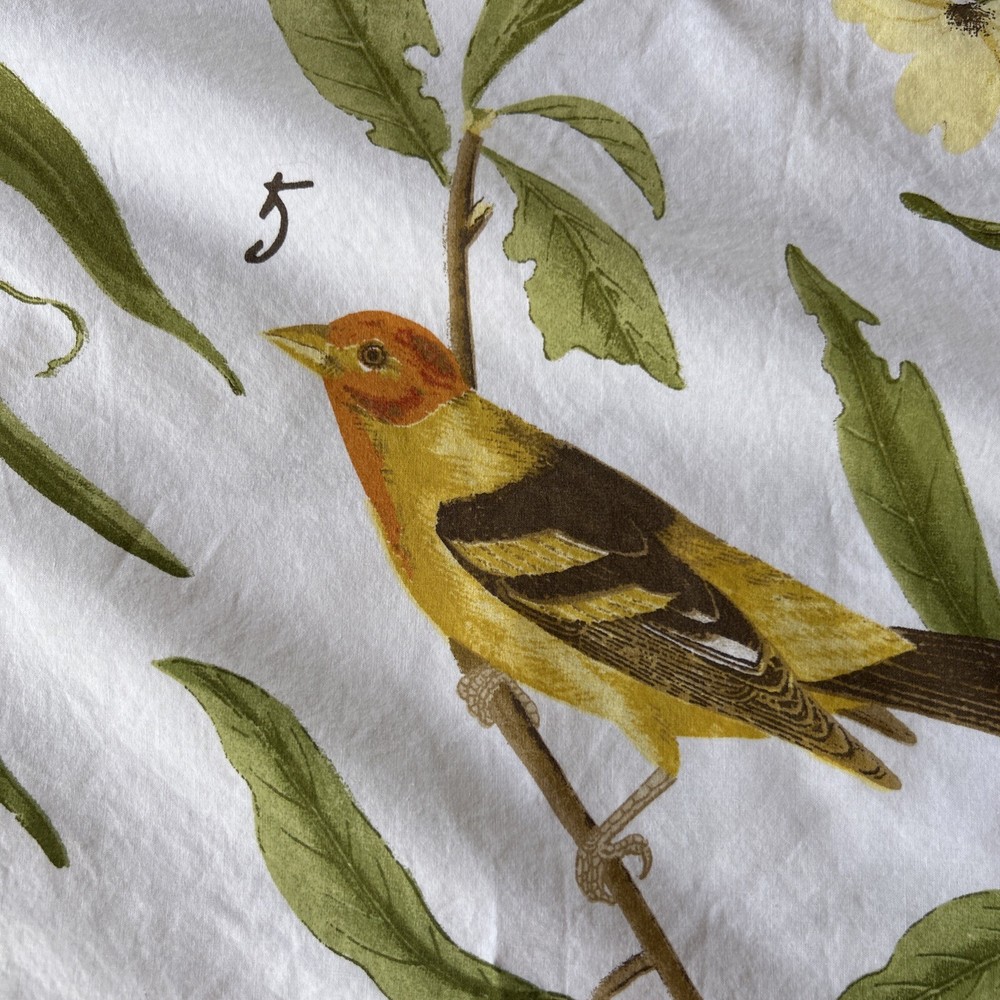 Refreshing standard pillow sham by POTTERY BARN in a naturalist/botanical design with SPRING SPARROW SONGBIRDS sprinkled all over! 100% cotton w 5% organic cotton. Numbers beside the birds as you would have in a naturalists' reference manual. Measures 29" wide and 24" tall. 100% cotton. No holes or stains.