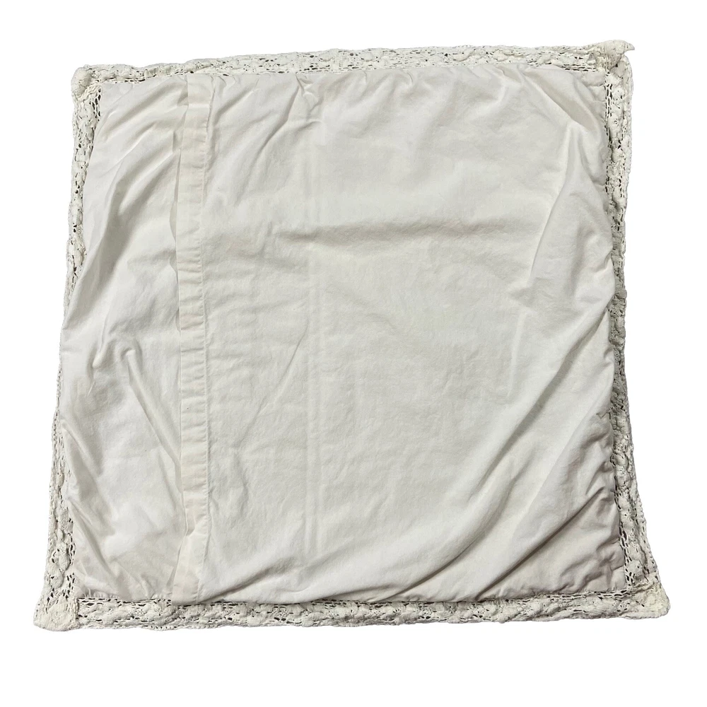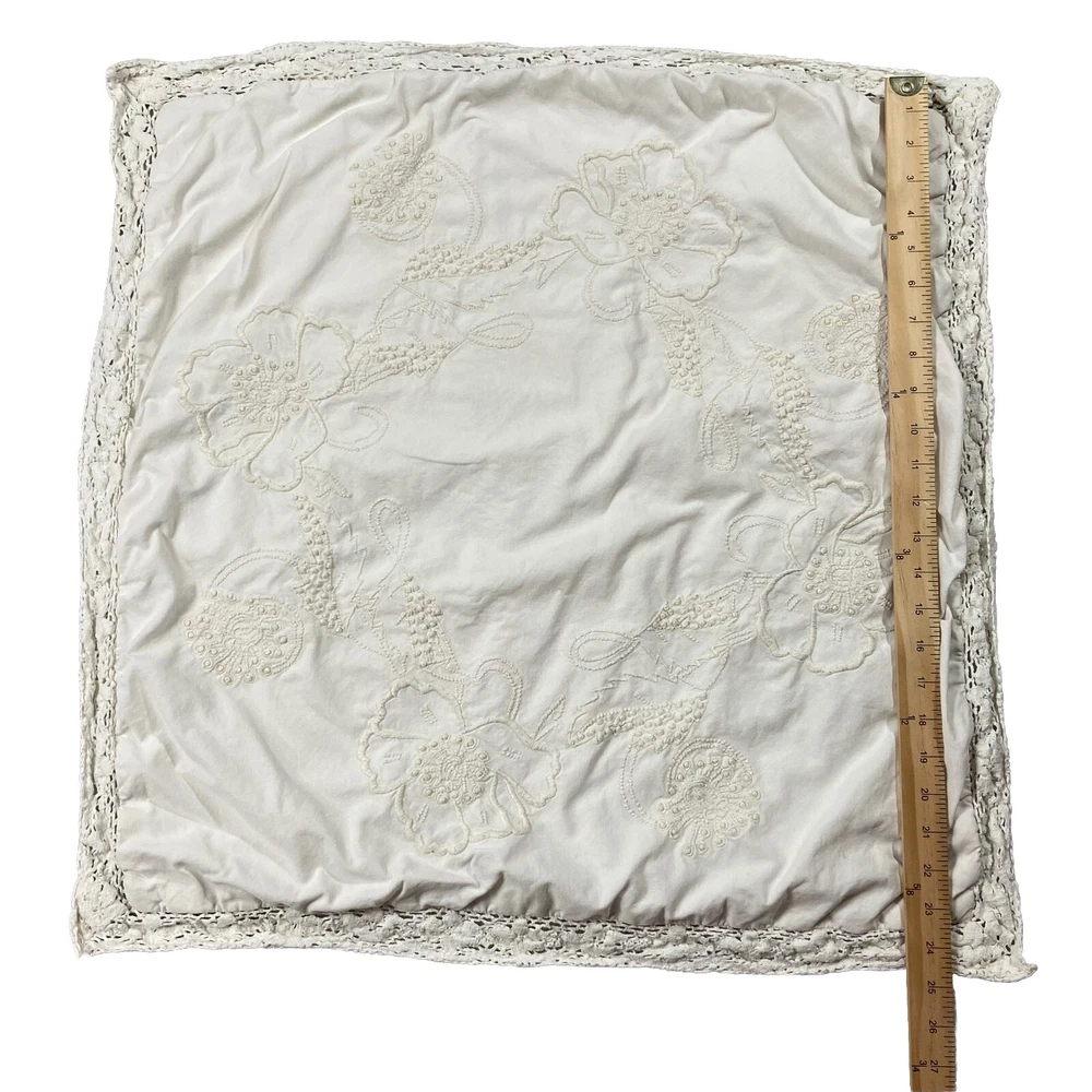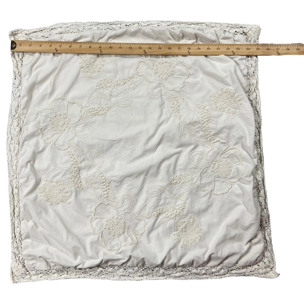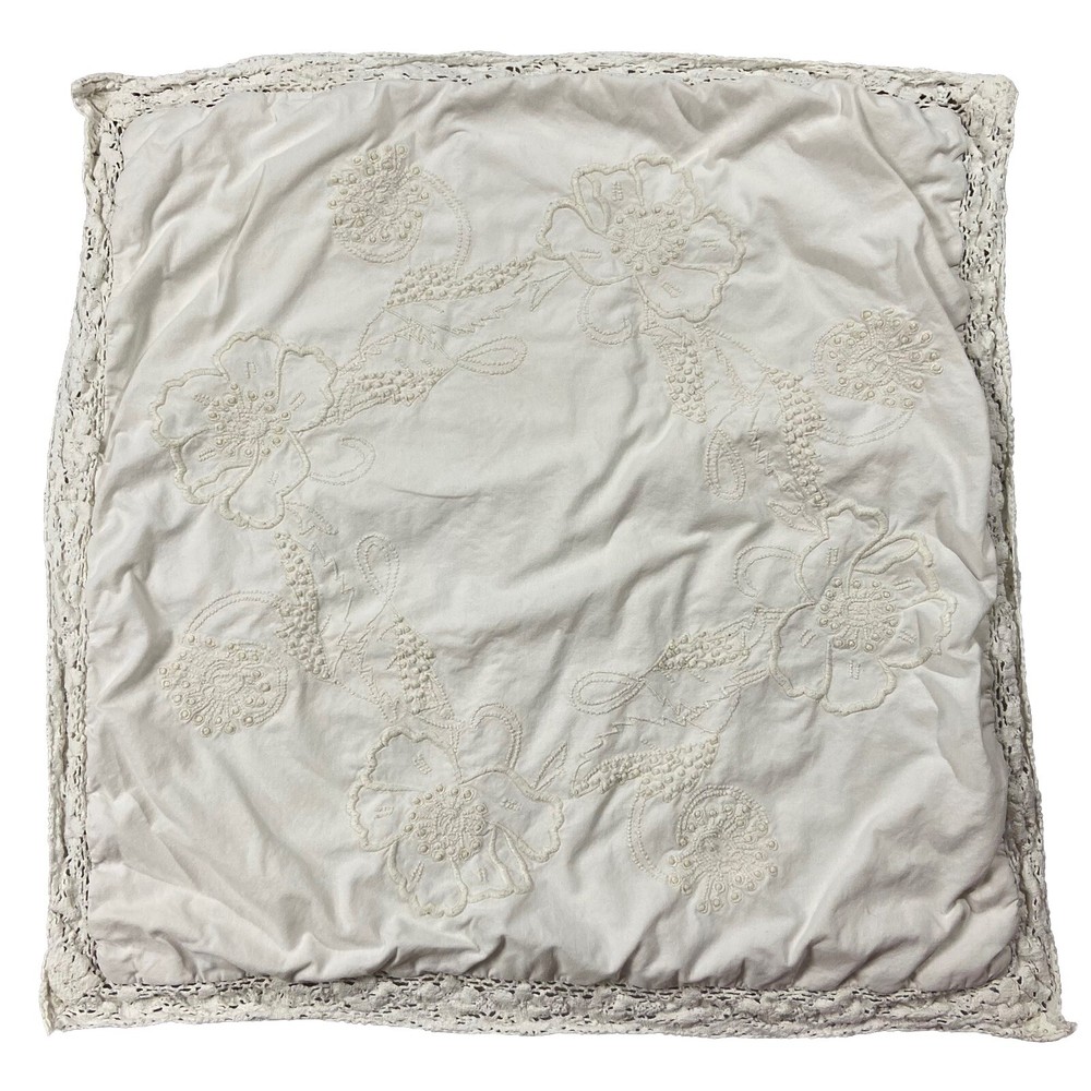 Pottery Barn Square Embroidered Pillow Cover Features a lace, trim detail around the perimeter of the pillow Beautiful ivory on ivory floral embroidery Has an envelope back closure Romantic shabby-chic style This pillow case has been well loved and is in good condition; there's some minor pilling on some of the embroidery. It's been laundered so many times the material tag no longer has print so unfortunately I don't have info on the materials this pillow cover is made of. Please note this listing is just for the pillow cover and does not include a pillow insert.