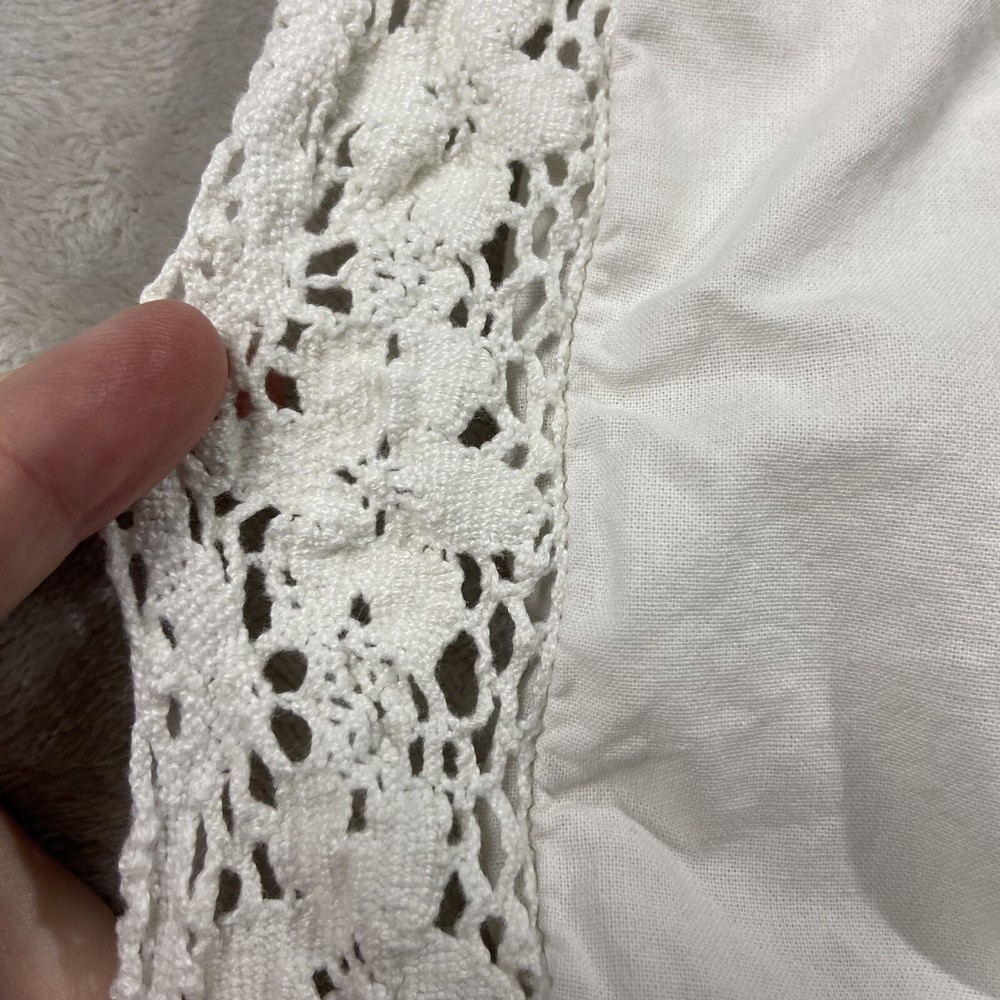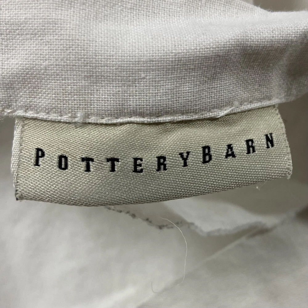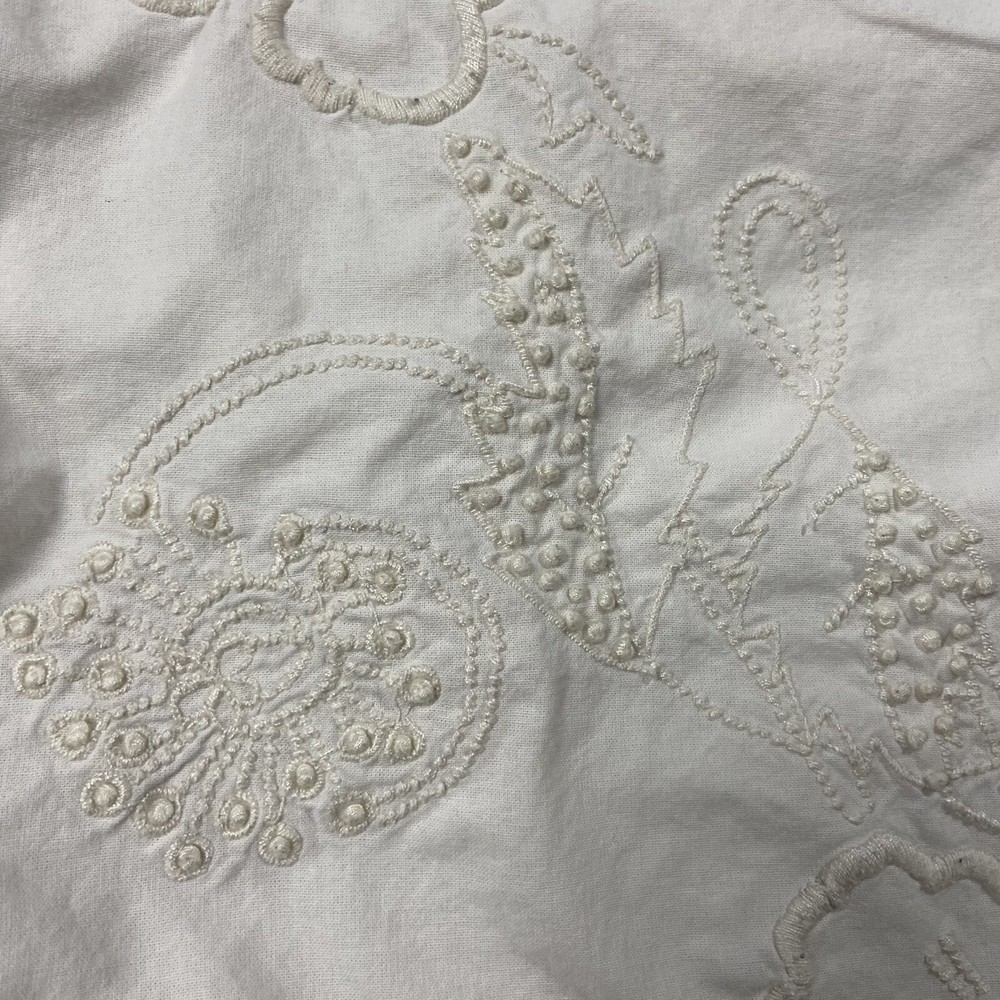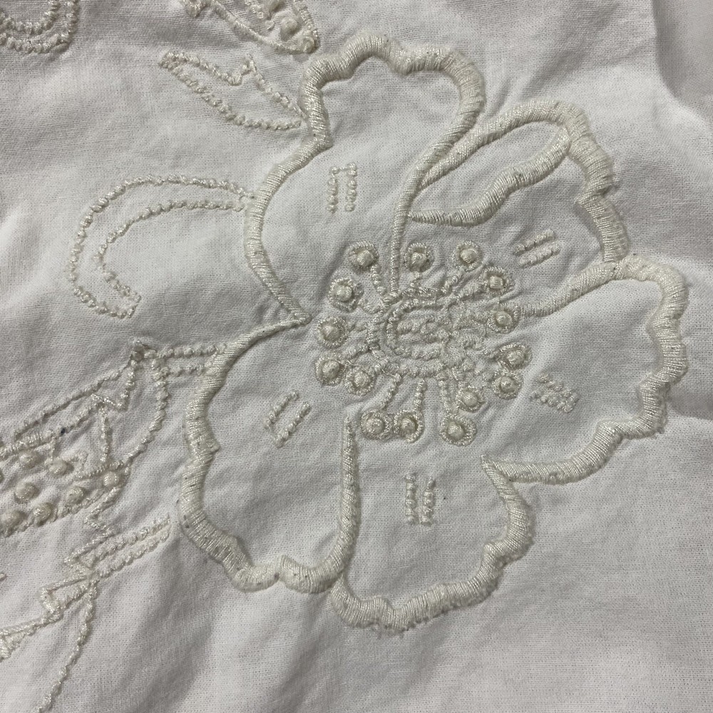 Pottery Barn Square Embroidered Pillow Cover Features a lace, trim detail around the perimeter of the pillow Beautiful ivory on ivory floral embroidery Has an envelope back closure Romantic shabby-chic style This pillow case has been well loved and is in good condition; there's some minor pilling on some of the embroidery. It's been laundered so many times the material tag no longer has print so unfortunately I don't have info on the materials this pillow cover is made of. Please note this listing is just for the pillow cover and does not include a pillow insert.