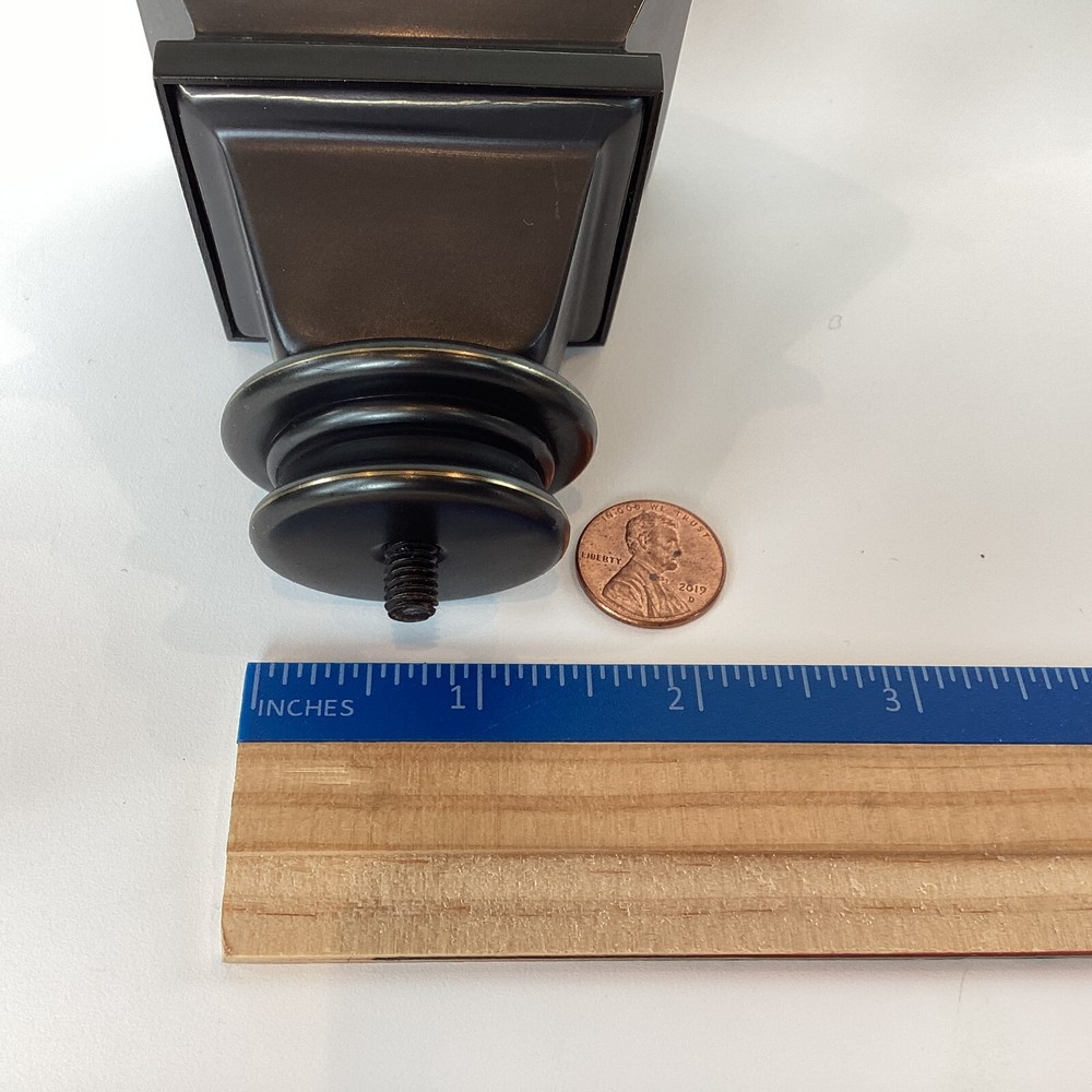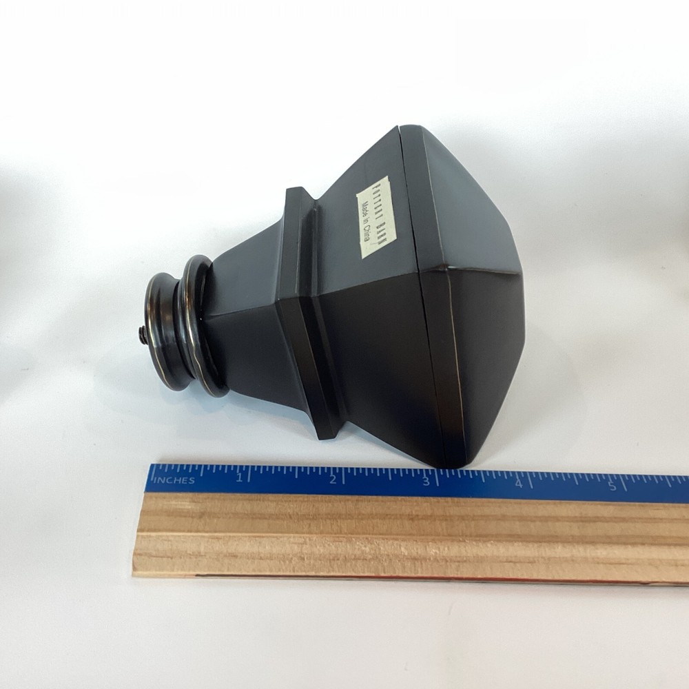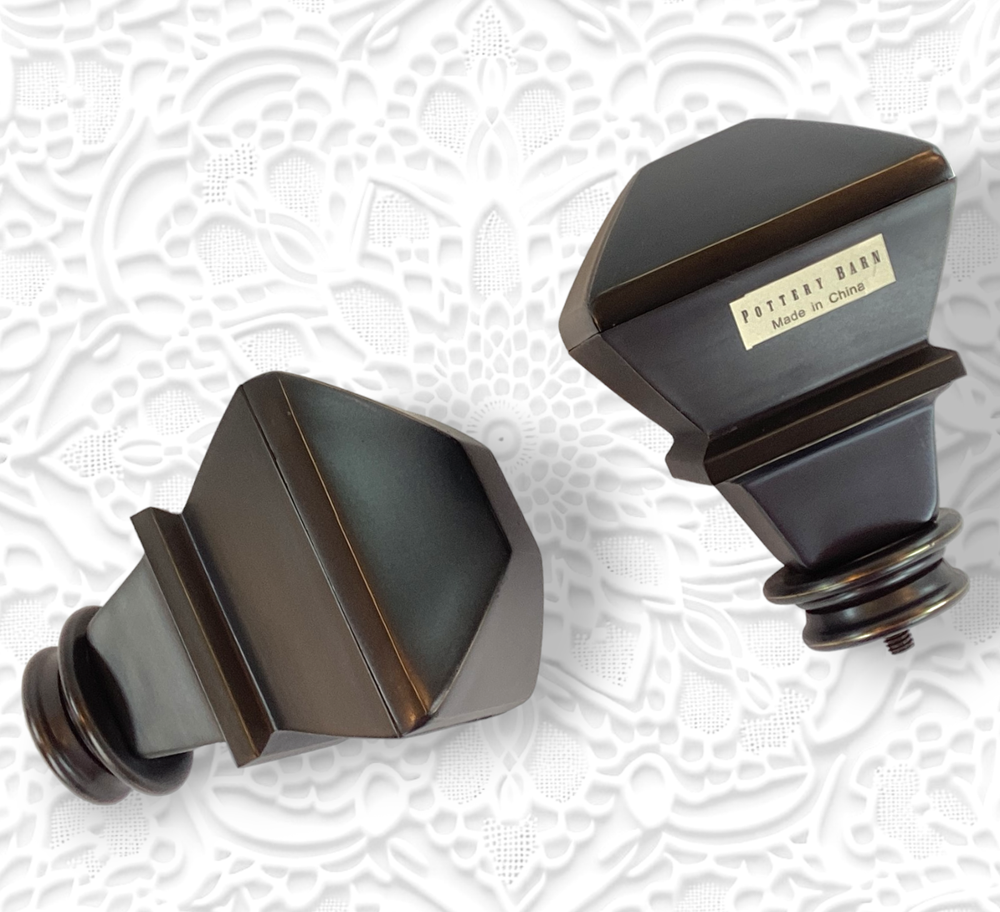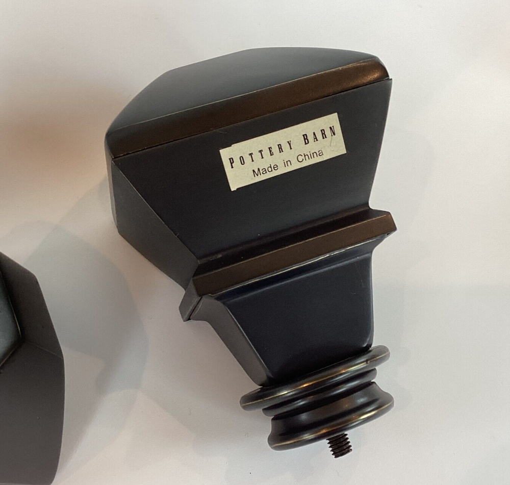 Set of 2 Pottery Barn brand large curtain rod finials in Antique Bronze. Made of steel with antique bronze finish. Finials are for larger size rod (not included) and measure: 2-3/4" at widest point and 4" long. The diameter on the base with the screw is 1-1/4". Please review photos for dimensions, condition, etc. **The last two photos show some scratches on screw-in side (which will not show) and light imperfections on one finial (may be from manufacturing process). Shipped with Priority Mail. Thank you!