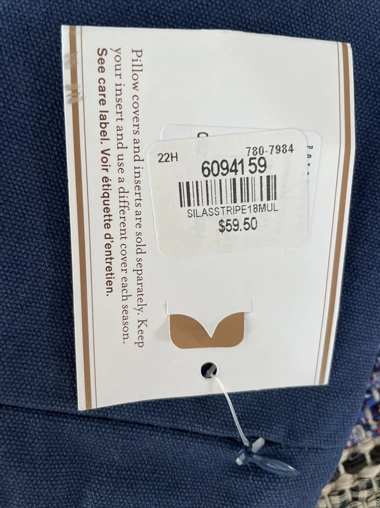 Pottery Barn Square Silas Striped Pillow Cover 18" Multi Blue Backside New W/tag....