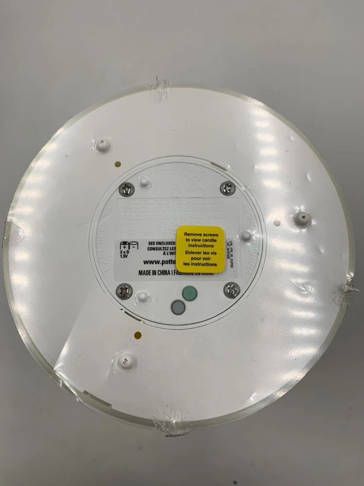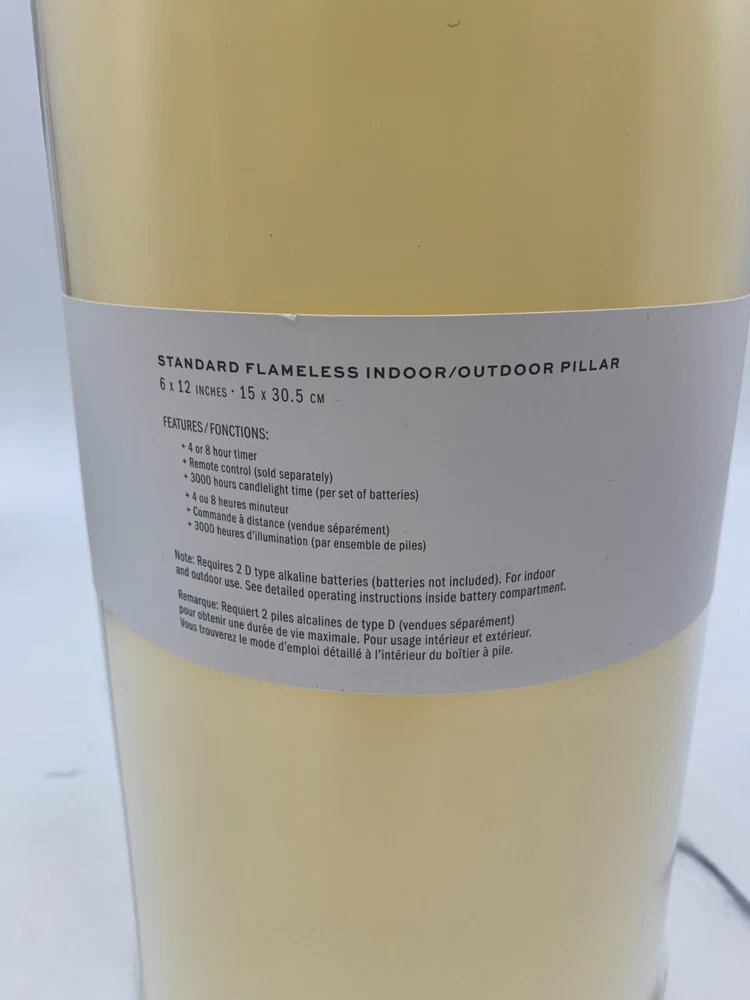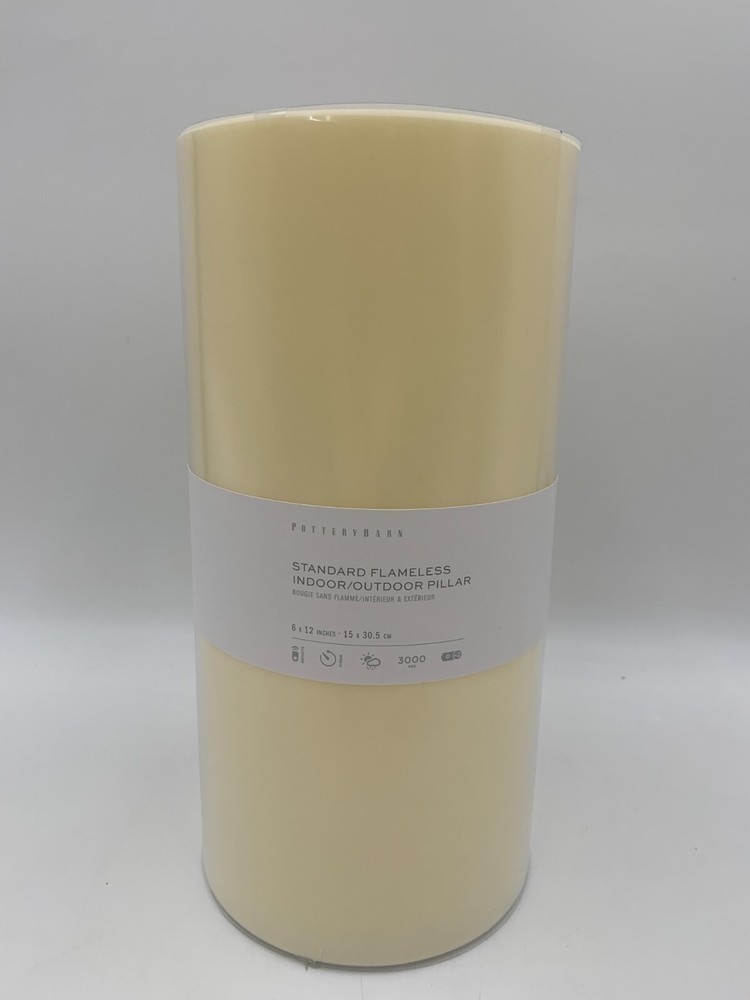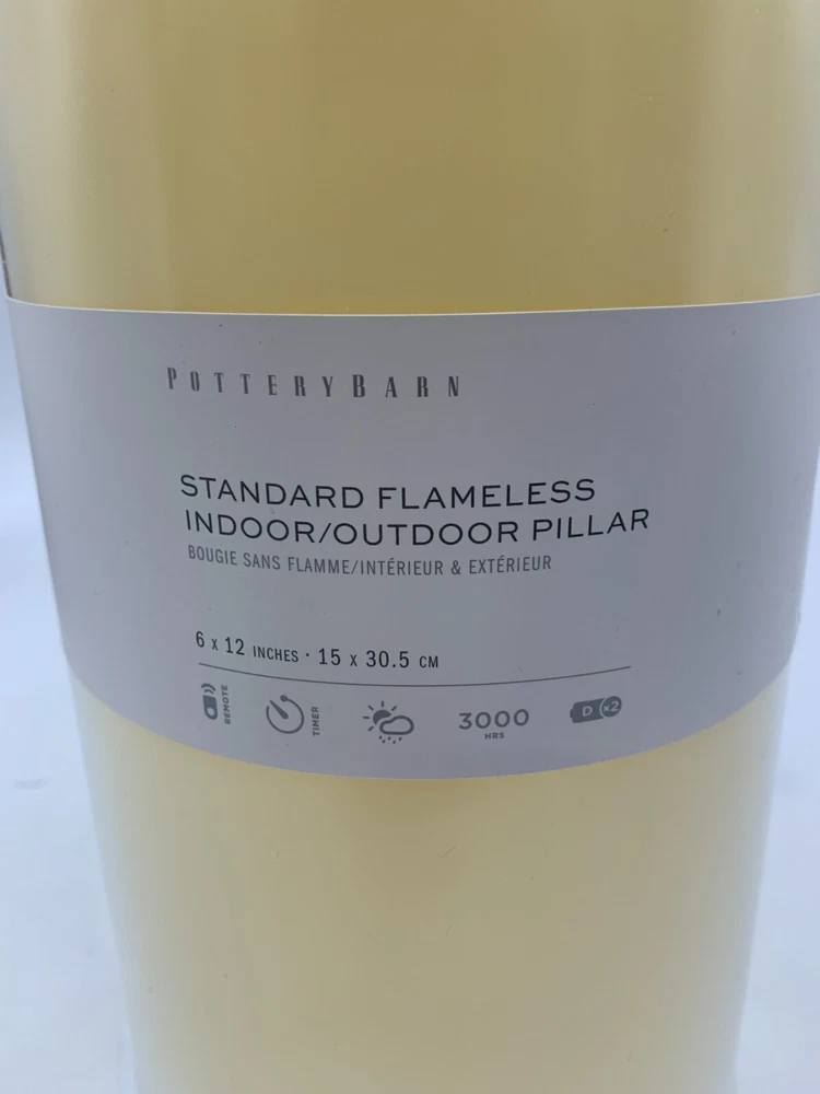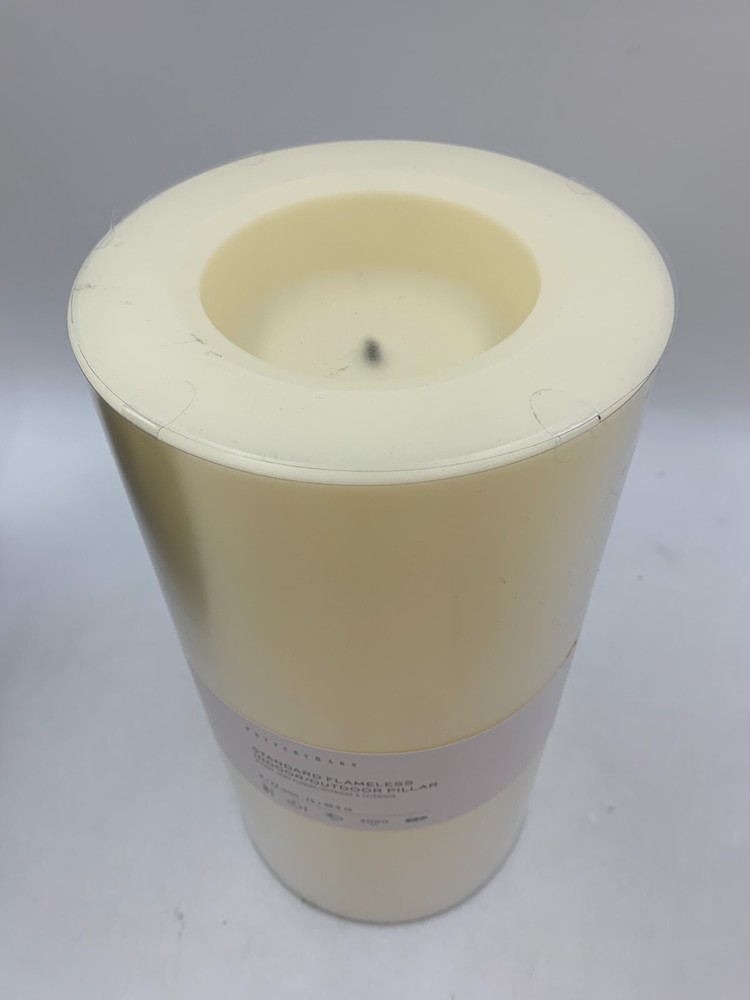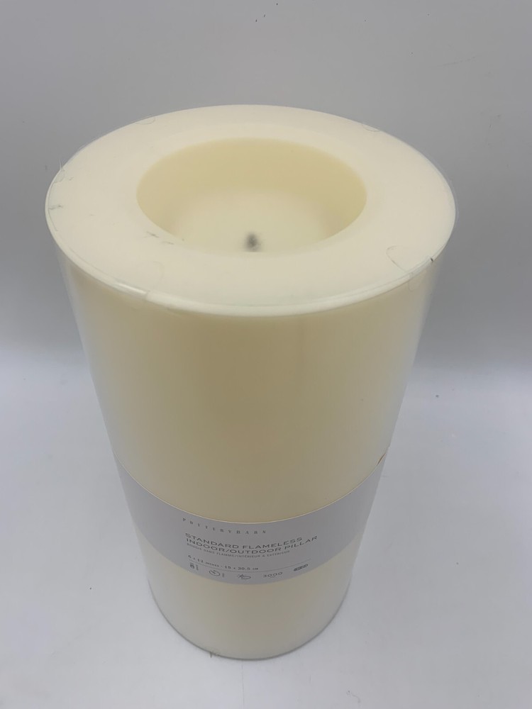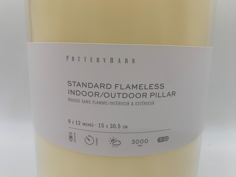 Pottery Barn Standard Flameless Outdoor Pillar Candle Item is brand new Auction includes: 1 pillar candle PRODUCT DETAILS CONSTRUCTION: Plastic-injection-molded shell with patented technology to flicker like a real candle. These will not melt in sun or heat. Batteries not included (except for votives). Each 6" diameter candle requires two D batteries and stays lit for 3000 hours (not included). Imported. Dust with a soft, dry cloth. At desired start time press green button to turn candle on. Press and hold down the green and white buttons simultaneously for six seconds until the candle blinks. Count the number of blinks near the top of the candle; each blink represents one hour of candle time. Release both buttons when number of blinks equals the candle "on" time you desire. If settings are not changed the candle will turn on the same time each day. DIMENSIONS: 6" Diameter Pillar Candle 6" diam, 12" h