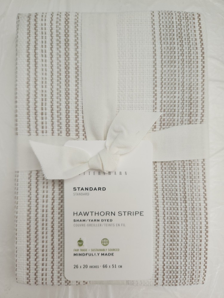 New With Tagged, as Shown on Photos. Add a touch of elegance to your bedroom decor with this Pottery Barn Hawthorn Stripe 1-Sham Pillow Sham. The rectangular pillow sham is made of 100% cotton with a thread count of 200. Features a stylish stripe pattern in taupe and white. Measuring 26 inches in width and 20 inches in length, this pillow sham is perfect for both teens and adults. The machine-washable pillow sham is easy to care for and has no closure type. It is ideal for use in the bedroom and is part of the Pottery Barn Hawthorn Stripe Bedding product line. Whether you are looking to decorate your home or add to your bedding collection, this pillow sham is a great choice.