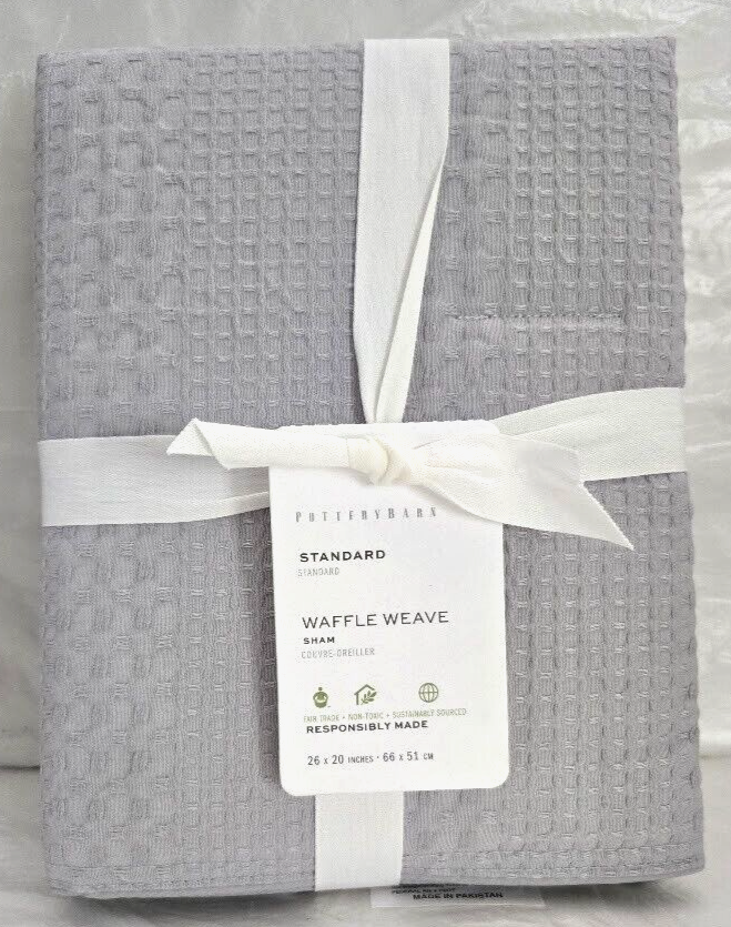 Sold as Show on Photos. Elevate your bedroom with the contemporary charm of the Pottery Barn Standard Honeycomb Waffle Weave Pillow Sham. Measuring 26" x 20", features a sleek Gray Mist hue that brings a tranquil and sophisticated touch to any bedding ensemble. Honeycomb Waffle Weave pattern adds a unique texture that is both visually appealing and comforting to the touch. Crafted from 100% cotton with a 100% polyester fill, this sham promises lasting comfort and ease of care. Its machine-washable design ensures that maintaining its crisp appearance is simple. Designed to coordinate seamlessly with the Pottery Barn Honeycomb Waffle Weave Comforter Set, this sham is a perfect choice for both teens and kids who appreciate a stylish and cozy bedroom aesthetic.