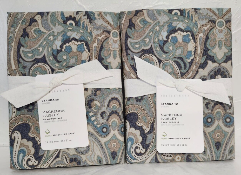 Brand New With Tagged, as Shown on Photos. Pottery Barn Standard Mackenna Paisley 2-Shams 26" x 20" Blue Multi-color Add a touch of contemporary style to your bedroom with this Pottery Barn Mackenna Paisley Bedding. The rectangular pillow sham measures 26" in width and 20" in length, featuring a stylish multi-color blue design. Made of 100% cotton material, this pillow sham is machine washable for easy care. Ideal for both teens & adults, the sham is part of the Pottery Barn Mackenna Paisley collection & features the brand's signature style. Perfect for any bedroom, this pillow sham is a must-have addition to your home decor.