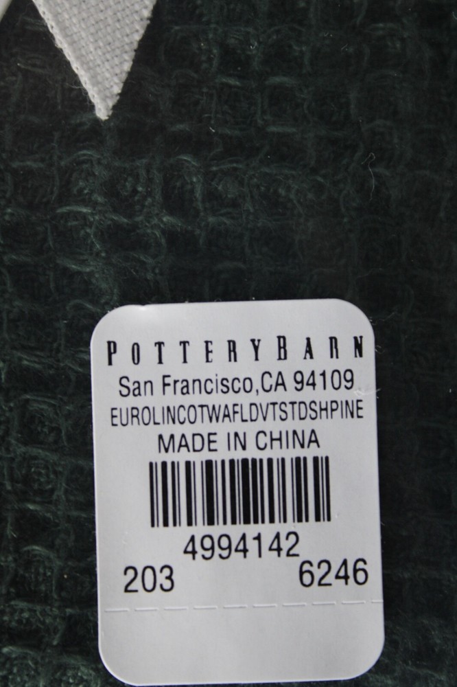 Brand New Sealed NWT With Tags Pottery Barn Standard Pine Dark Green Euro European Linen Cotton Blend Quilted Waffle Weave Pillow Cover Sham 26x20 in 4994142 Details Condition: New Shipping Dimensions: 11x8x3 in / 28x20x8 cm USA Shipping Weight: Mailing: 12 oz Ground Cost: Calculated International Shipping Weight: Mailing: 12 oz eBay International Shipping Cost: Calculated Local Pickup 98635 98620 97058 Be sure to check out our other Items for sale Refer to eBay Return policy for more details. You are covered by the eBay Money Back Guaran tee.