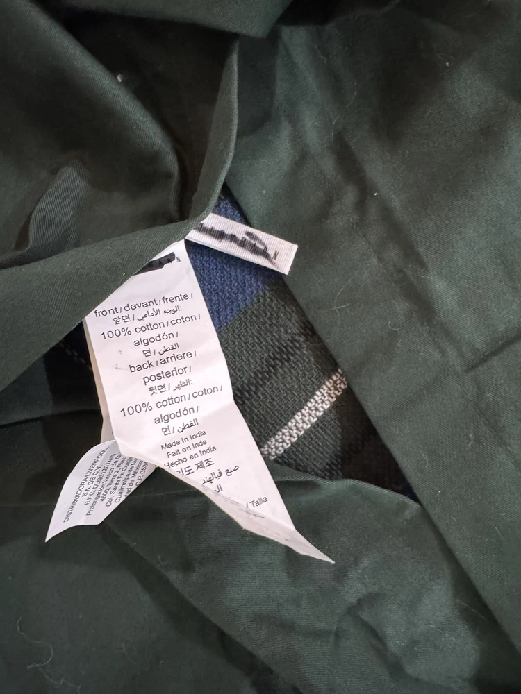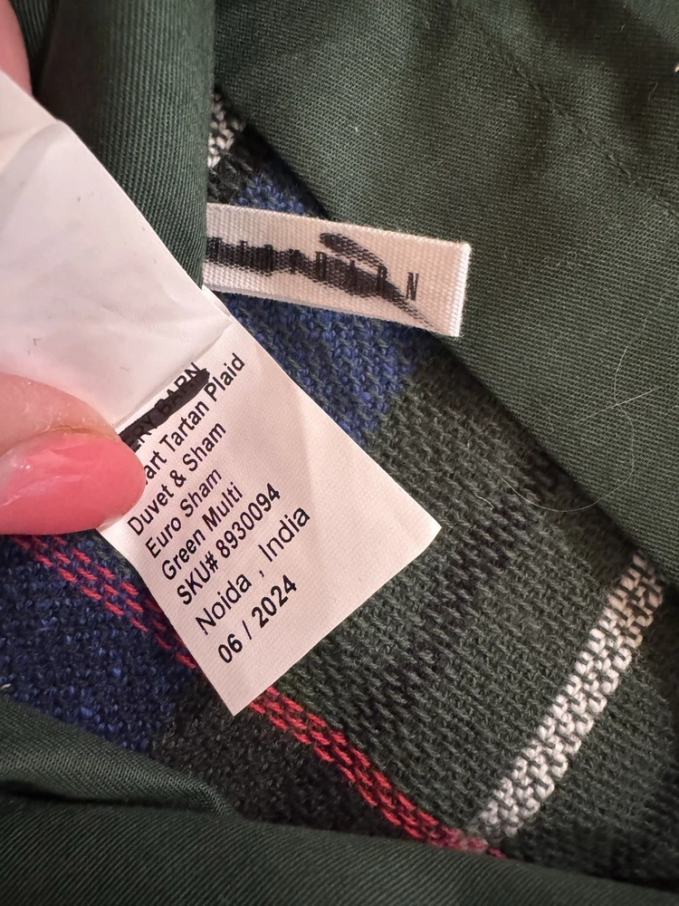 Tags marked from outlet with black marker as shown in photos *last two photos show flaws- item was not washed in my home and marks may come out with wash Euro sham in like new condition A tribute to classic tartan prints, a timeless design in green. Adding a merry mix to your seasonal bedding, it's crafted of cotton for a cozy and comfortable feel you’ll want to be tucked into night after Front is made from 100% yarn-dyed cotton. Reverses to solid. Duvet features a button closure and interior ties to help keep insert in place.