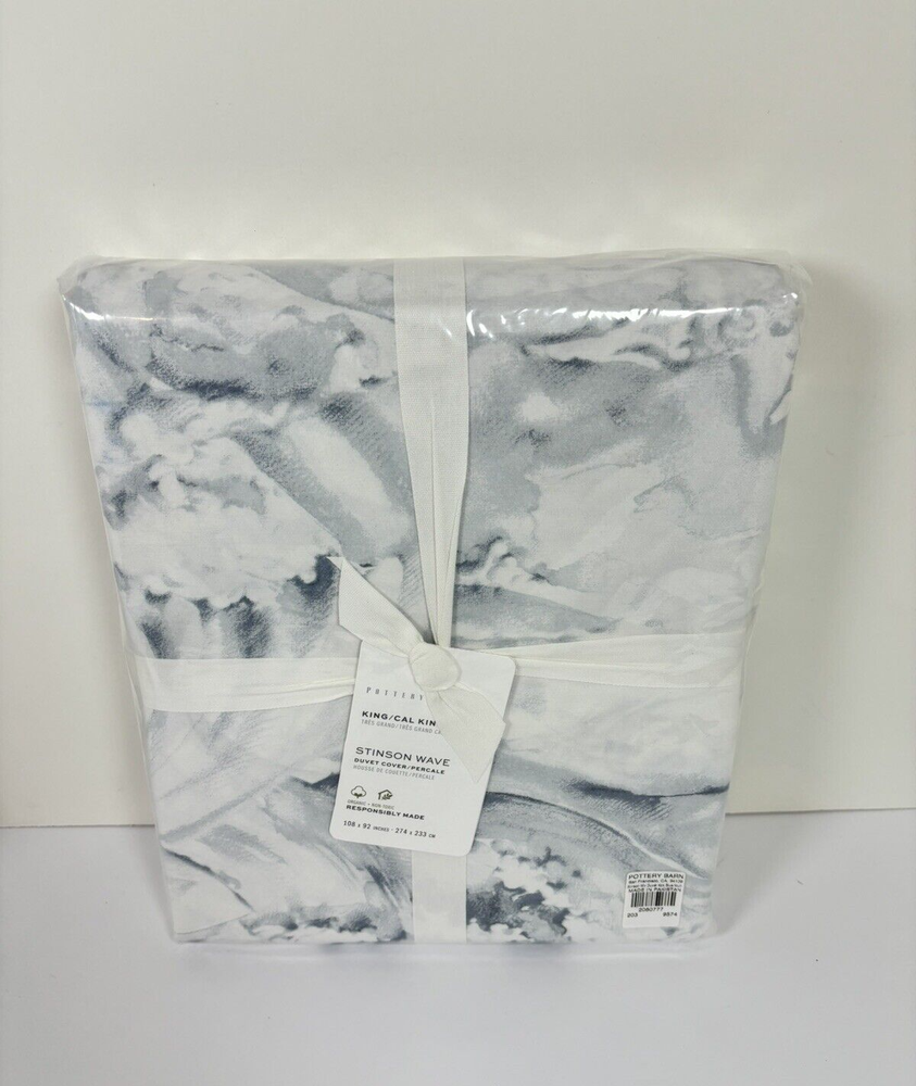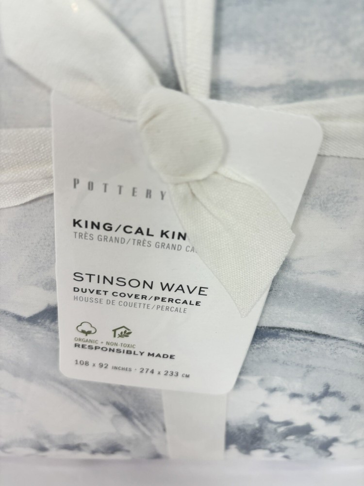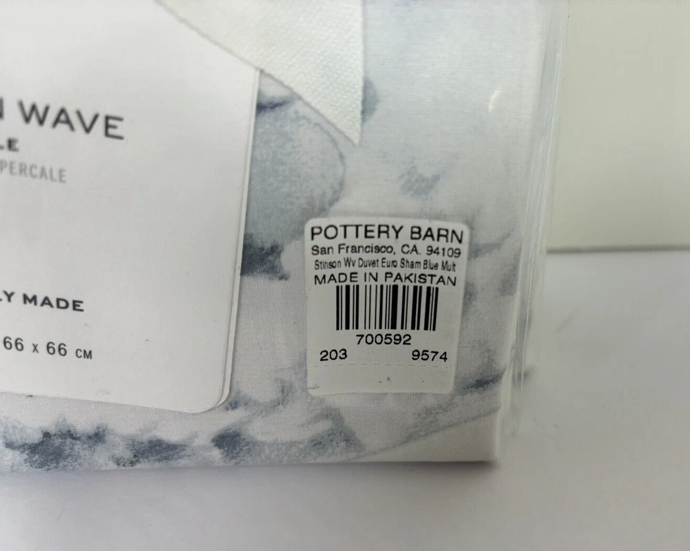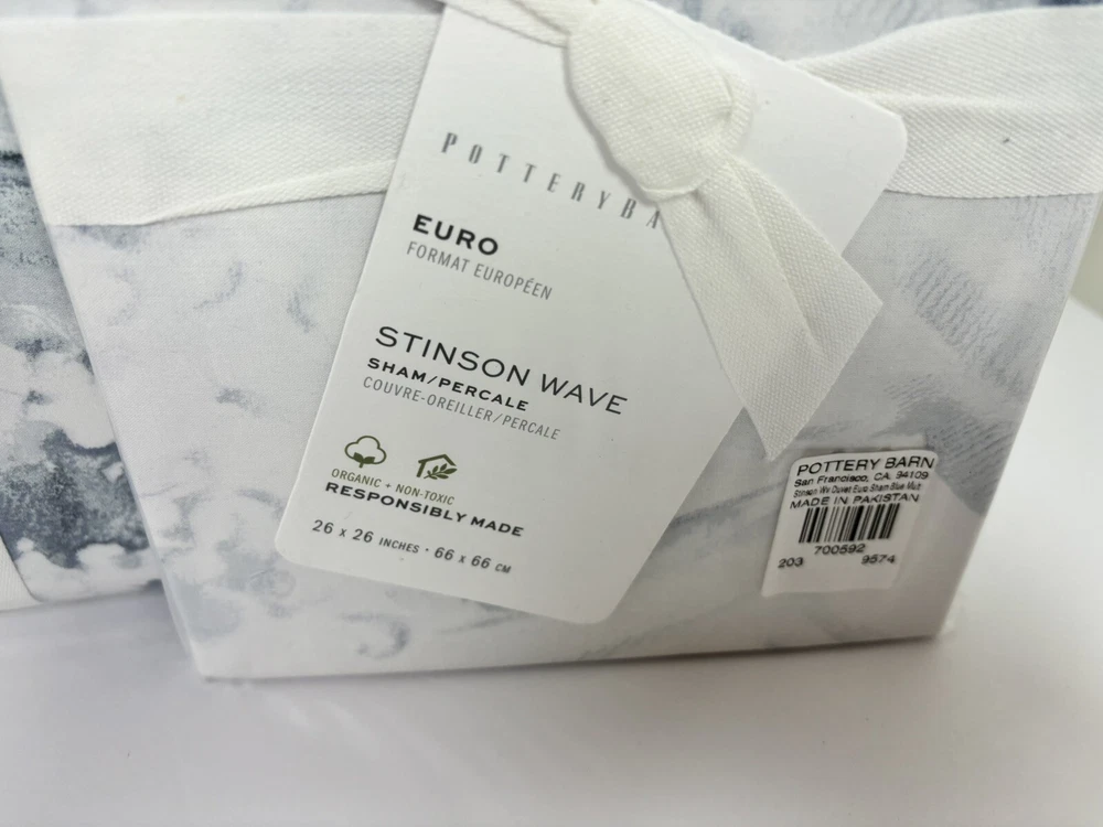 Pottery Barn Stinson Wave King Duvet Cover + 3 Euro Shams Color: Blue/White Duvet Cover: 92" x 108" Sham: 26" x 26" 100% organic cotton percale 200-thread count Machine wash Condition Specifics: Factory folded in original packaging.
