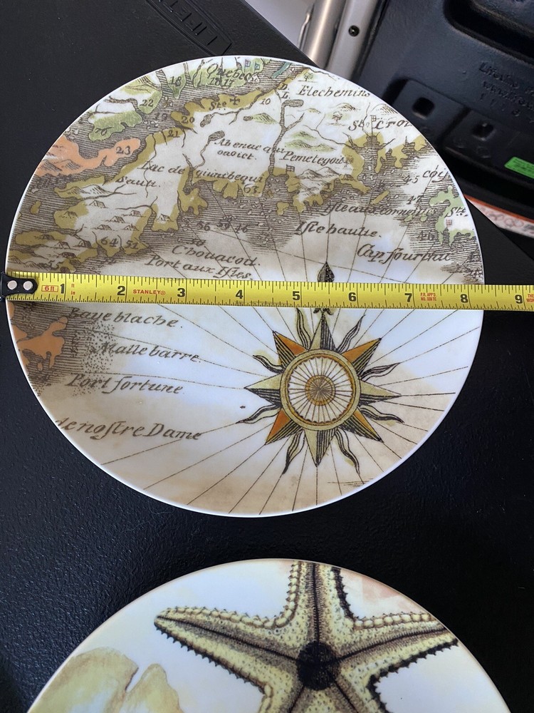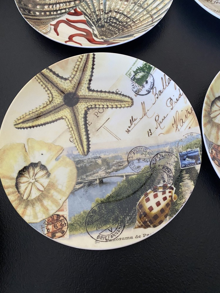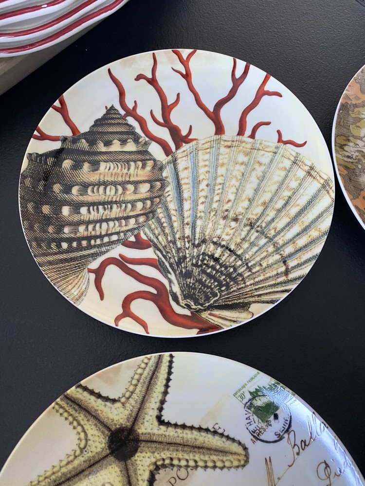 Add a touch of coastal charm to your table setting with this set of 4 salad plates/condiment dishes from Pottery Barn. Each plate has a unique seashell design that will transport you to the beach with every bite. Made of sturdy stoneware and measuring 8 inches in diameter, these plates are perfect for everyday use or special occasions. The nautical pattern is ideal for any coastal or beach-themed decor. This set includes 4 plates and is perfect for serving salads, appetizers, or desserts.