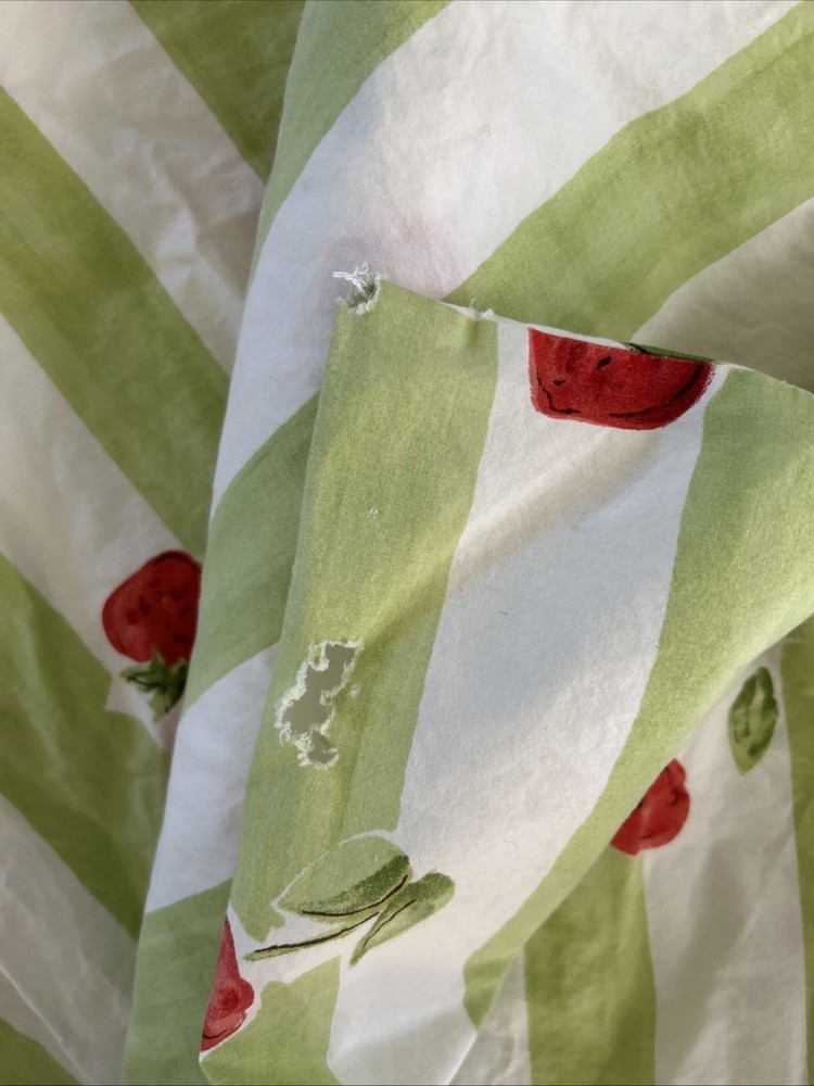 Pottery Barn Strawberry Fields cotton Duvet Cover, size Full/Queen. 66”x84” Listing is for duvet cover only, no shams ** there are two holes in one corner, see pics. Clean and stain free.
