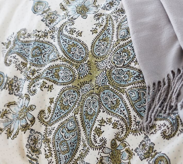 POTTERY BARN SUSANNA DUVET Tiny polka dots in the background bring a playful twist to this paisley medallion pattern. It’s an easy bedding update for any time of year. Made of 100% cotton from Israel; including 5% organic cotton. Reverses to self. Duvet features a hidden button closure with inner ties that keep insert in place; sham features an envelope closure. 200 thread count. Machine washable. Imported. Auction is for QUEEN duvet with TWO STANDARD SHAMS. Item is BRAND NEW in ORIGINAL PACKAGING! A d d i T i O N a l P h o T O s A v a i L a B Le U p O n R e Q u e S T PURCHASED DIRECTLY FROM POTTERY BARN. AUTHENTIC.