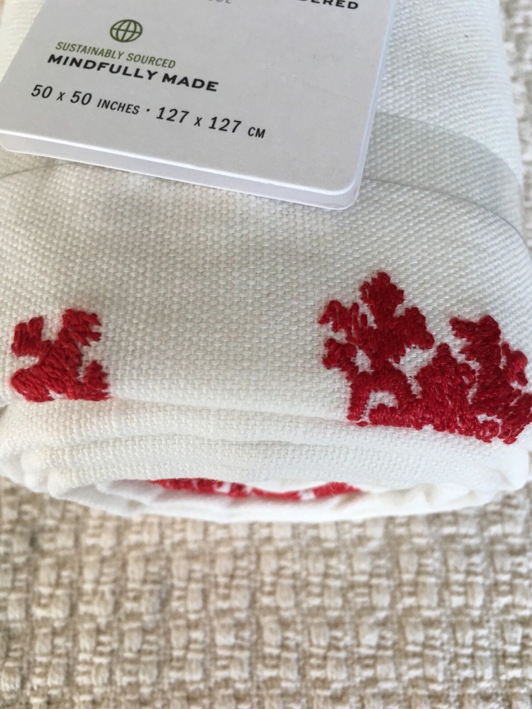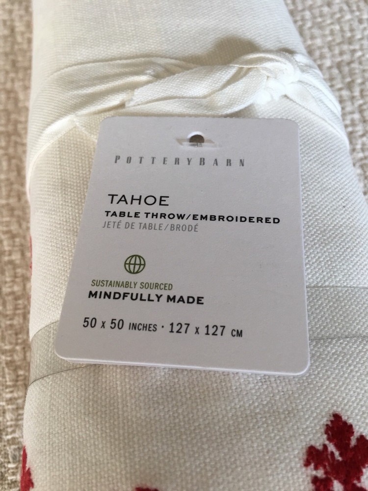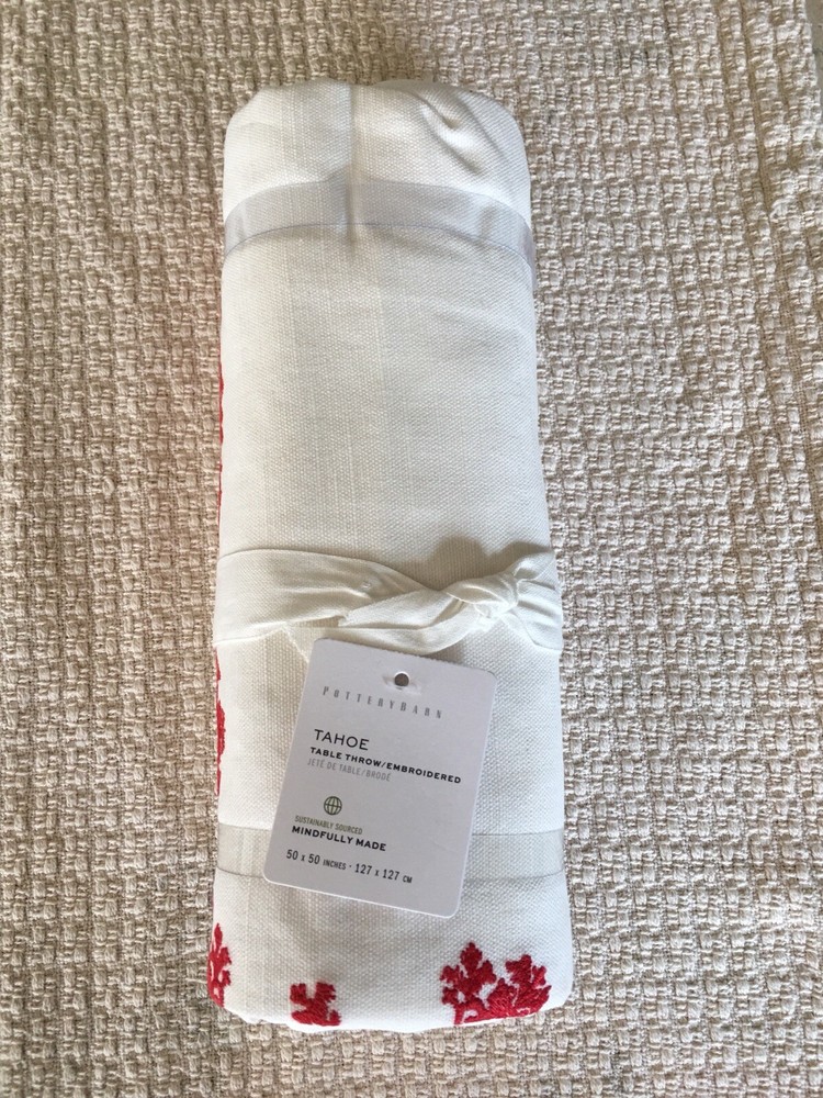 Pottery Barn TAHOE Embroidered Table Throw size: 50 x 50 color: Ivory with red embroider Absolutely Gorgeous!! New with tags. Shipped with USPS Priority Mail Retail $129