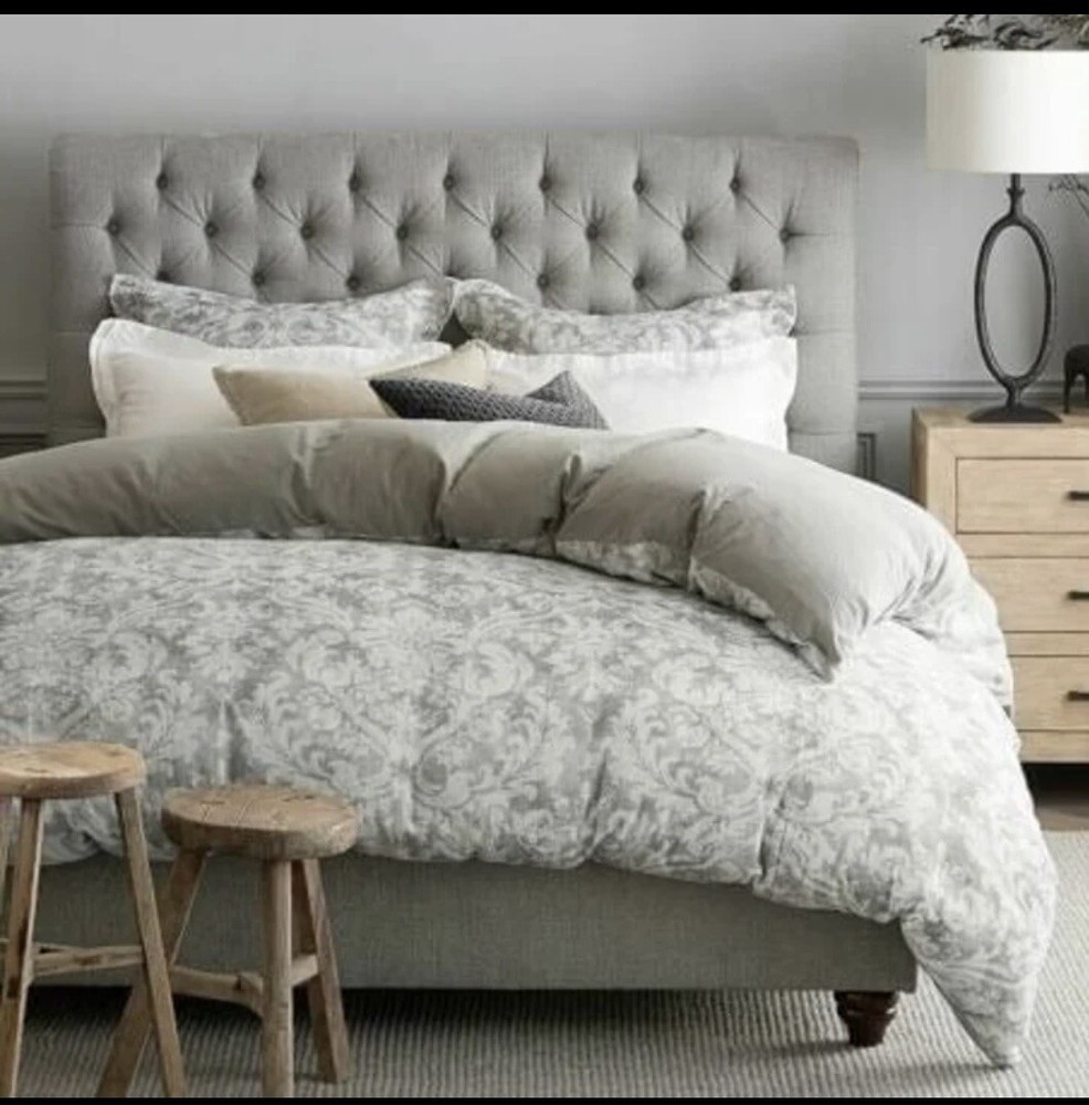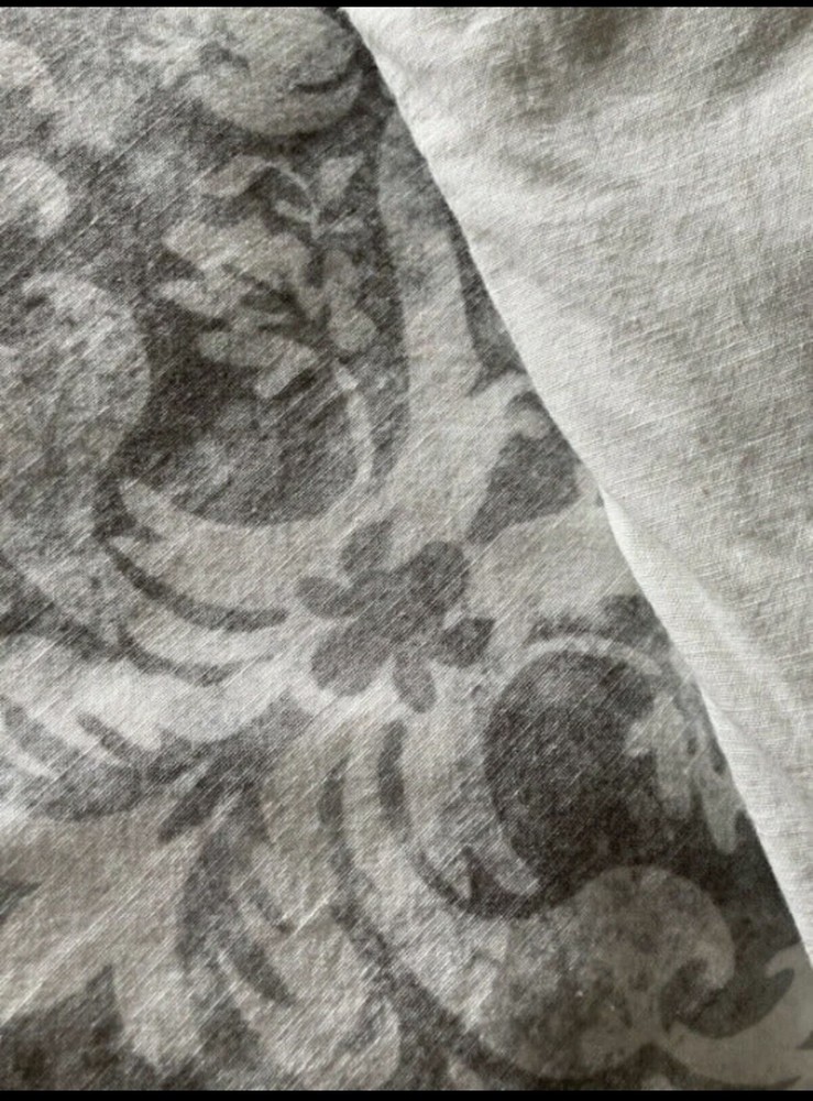New condition. Washed. Unused. No original packaging. The first 3 photos are stock images. The last photo is the actual duvet cover which gives some idea of the beautiful color and texture. Exceptionally lovely in a way that the pictures can't capture. A gorgeous soft pewter grey and off-white. This set includes 1 Full/Queen Duvet Cover and 1 Euro sham. Duvet Full/Queen: 88" long x 92" wide Sham Euro: 26" square Flange: 1.5" From the Pottery Barn website: Get your best sleep during the warmer weather with the Talisa Duvet Cover & Shams. The intricate design has a modern quality while the fabric is all about relaxation. Woven of 85% cotton and 15% linen. Duvet features a hidden button closure with inner ties that keep insert in place; sham features an envelope closure. Reverses to solid. Oeko-Tex® certified, the definitive mark of excellence for products that are healthy for you and healthy for the environment.