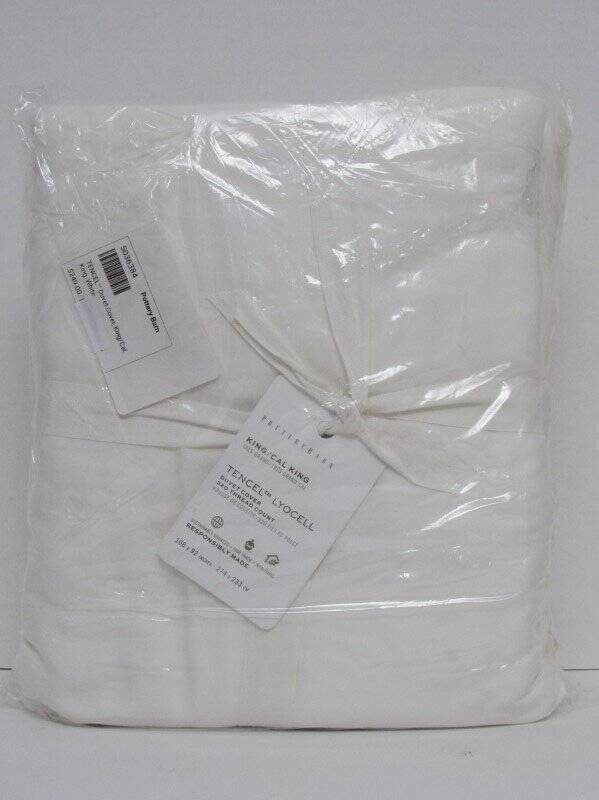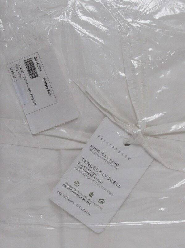 Pottery Barn TENCEL™ Lyocell Duvet Cover, King/Cal.King White NWT Pottery Barn TENCEL™ Lyocell Duvet Cover, New with tags... One king/cal.king duvet cover---108"wide x 92" long----274 x 233 cm Color--White Eco-friendly and luxurious, our TENCEL™ Duvet Cover adds comfort and style to your bed. Simple neutrals are easy to layer with patterned sheets, or keep the look cool with solid hues. Made of a satin weave of Lyocell, an eco-friendly fiber that is soft and breathable. It has a naturally smooth drape, which helps reduce wrinkles. TENCEL™ is a quality brand of Lyocell fiber. TENCEL™ Lyocell True Carbon Zero is a carbon-neutral, wood-based fiber made to reduce GHG emissions. TENCEL™ is a trademark of Lenzing AG. STANDARD 100 by OEKO-TEX® Certified: WSI Certificate #: 14.HUS.42449 HOHENSTEIN HTTI: tested for 400+ harmful substances to keep you and your family safe from chemicals common to textile manufacturing. Made in a Fair Trade Certified™ factory. Duvet reverses to self. Duvet cover features a hidden button closure with inner ties to keep insert in place. Yarn dyed for rich and lasting color that wears well over time. Machine wash. Imported. Care Machine wash in warm water, gentle cycle. Use only non-chlorine bleach when needed. Tumble dry on low heat; remove promptly. Warm iron as needed. See my other listings for more great items! Please read our return policy before you purchase: We take pride in our business, and we strive to do our best. We purchase brand new items and we do our best to give accurate descriptions and photos. If you have any questions about an item, please contact us through eBay prior to your purchase. We try our best to resolve any issues as fast as possible. Please contact us right away if there are any issues with your purchase. Item must be returned within 30 days of the original delivery date. When we receive the returned item, inspect it, and it is found to be in the same condition that we shipped it in (brand new, unused and in the original packaging) You will immediately receive your refund. Returns that have any signs of use or handling will NOT be accepted and no refund will be given. Thank you! Please read our return policy before you purchase: We take pride in our business, and we strive to do our best. We purchase brand new items and we do our best to give accurate descriptions and photos. If you have any questions about an item, please contact us through eBay prior to your purchase. We try our best to resolve any issues as fast as possible. Please contact us right away if there are any issues with your purchase. Item must be returned within 30 days of the original delivery date. When we receive the returned item, inspect it, and it is found to be in the same condition that we shipped it in (brand new, unused and in the original packaging) You will immediately receive your refund. Returns that have any signs of use or handling will NOT be accepted and no refund will be given. Thank you! Feedback: We strive to give you the best service. If you have any issues regarding your item, please contact us right away . Customer satisfaction is our priority. We accept MasterCard, Visa, Discover, Paypal and American Express, securely and conveniently via eBay Managed Payments. We will use the address listed on your eBay account...so please make sure it is correct. WE WILL SHIP TO CONFIRMED EBAY ADDRESSES ONLY!! DO NOT send money via PayPal if your address is not confirmed...we will not be able to accept it. We provide fast shipping! Your item will be shipped within 1-3 business days via UPS, USPS priority mail or Fed-Ex. We reserve the right to choose shipping company. They can NOT deliver to PO boxes, so please provide us with a physical street address. Once your item is shipped you will receive an email with your tracking number. We are HAPPY to combine shipping on items that can be combined. Please email us for shipping rates to HI and AK. Signature at delivery is required for all items over $250. All items must also be shipped to the address on your eBay account.. We are enrolled in eBay's Global Shipping Program . Only countries approved in eBay's Global shipping can receive deliveries from us. Other Items Feedback Contact txzj pxzj432 txzj-11 txzj-4 txzj1 txzj115