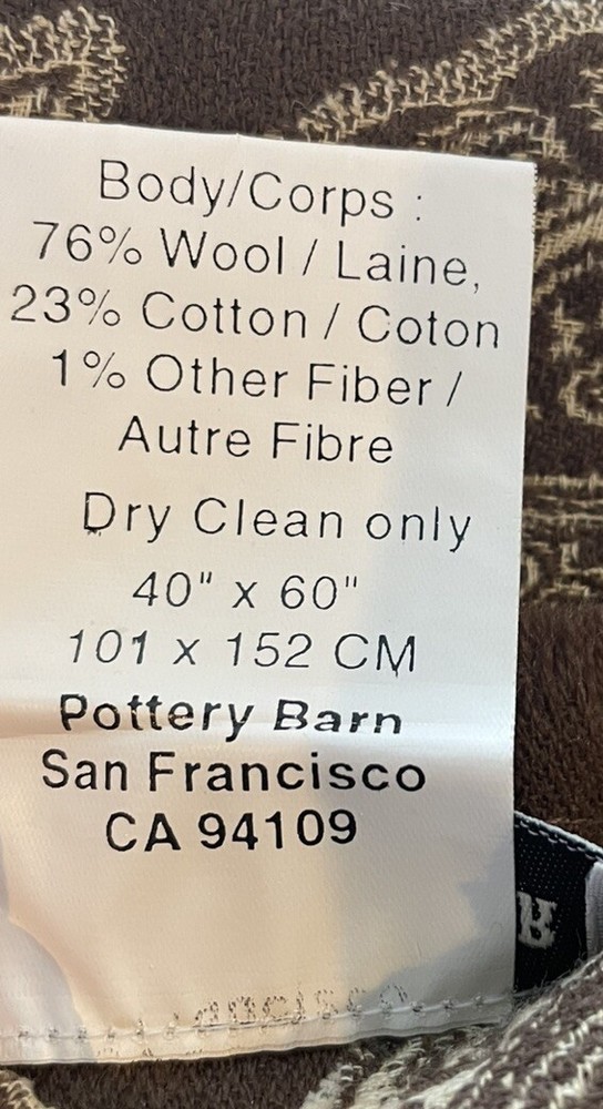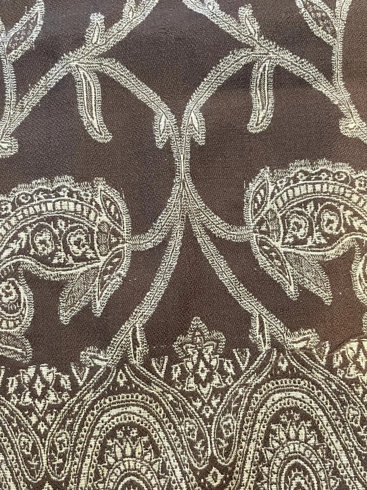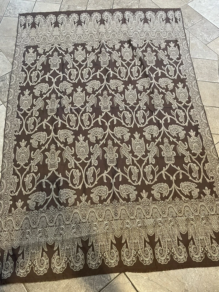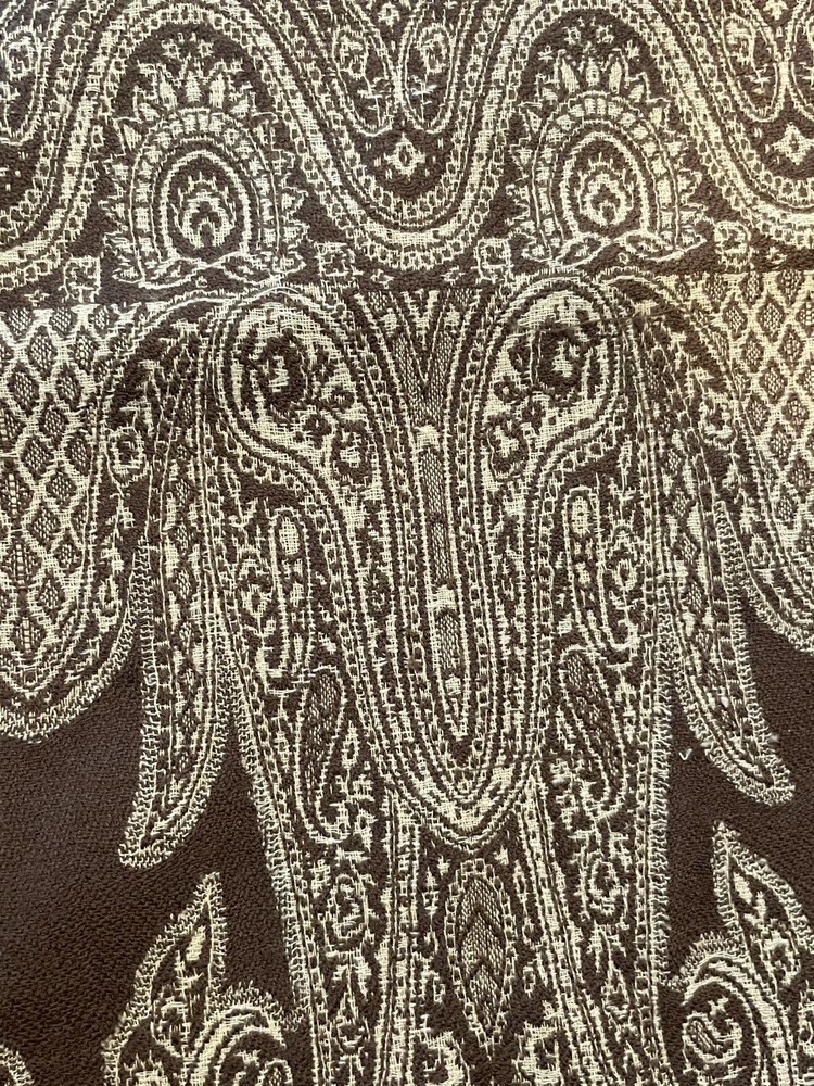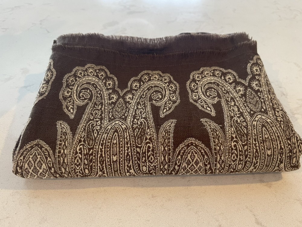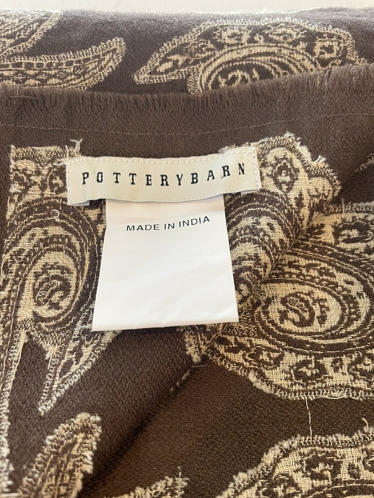 This Pottery Barn tablecloth scarf is a luxurious and chic addition to any kitchen or dining room. Made from a wool blend material in a rich brown color with a paisley pattern, this rectangular tablecloth measures 60 inches in length and 40 inches in width. Designed with a boho chic style, this tablecloth scarf adds a touch of elegance to your dining space. Made in India, this high-quality piece is perfect for elevating your dining experience and creating a stylish atmosphere for your meals. New without tags. Two available each sold separately.