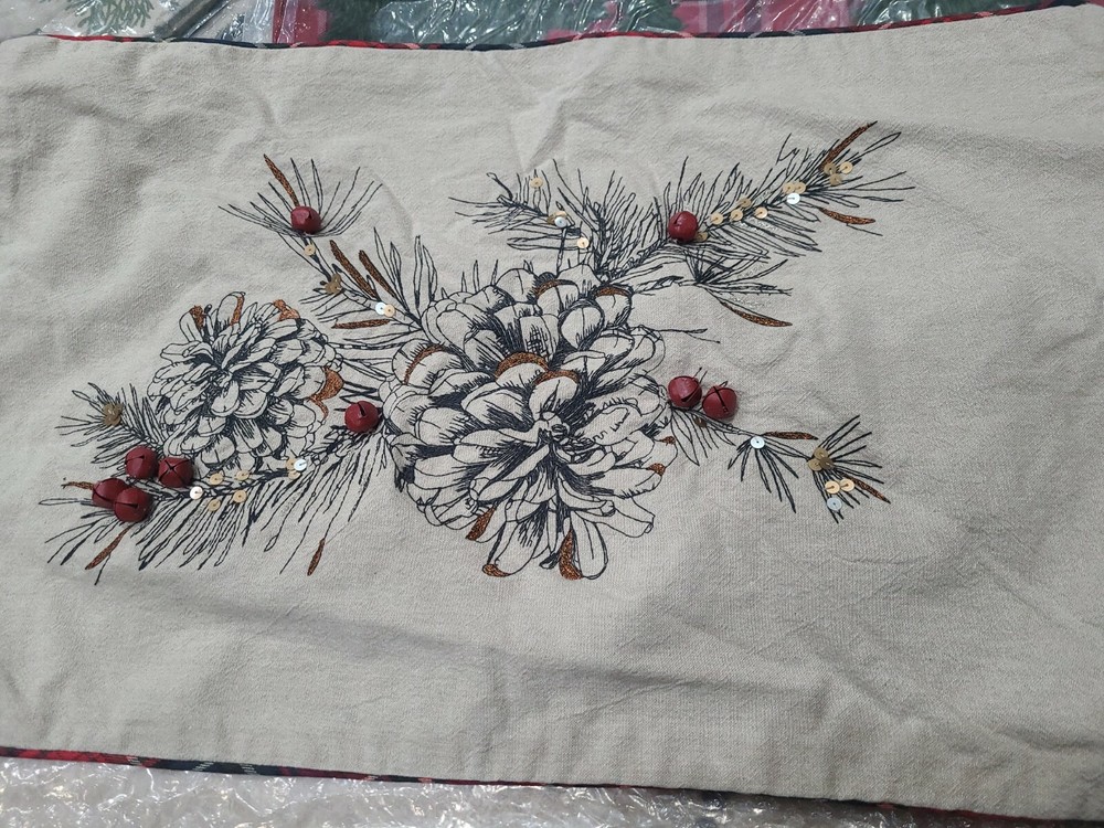 You are purchasing one Pottery barn Tarake pinecone pillow cover embroidered front, plaid zippered back 16x26" new with tags. pb tag has a black line through the paper tag.