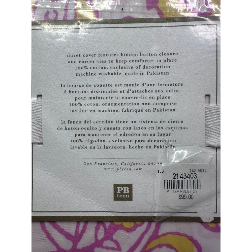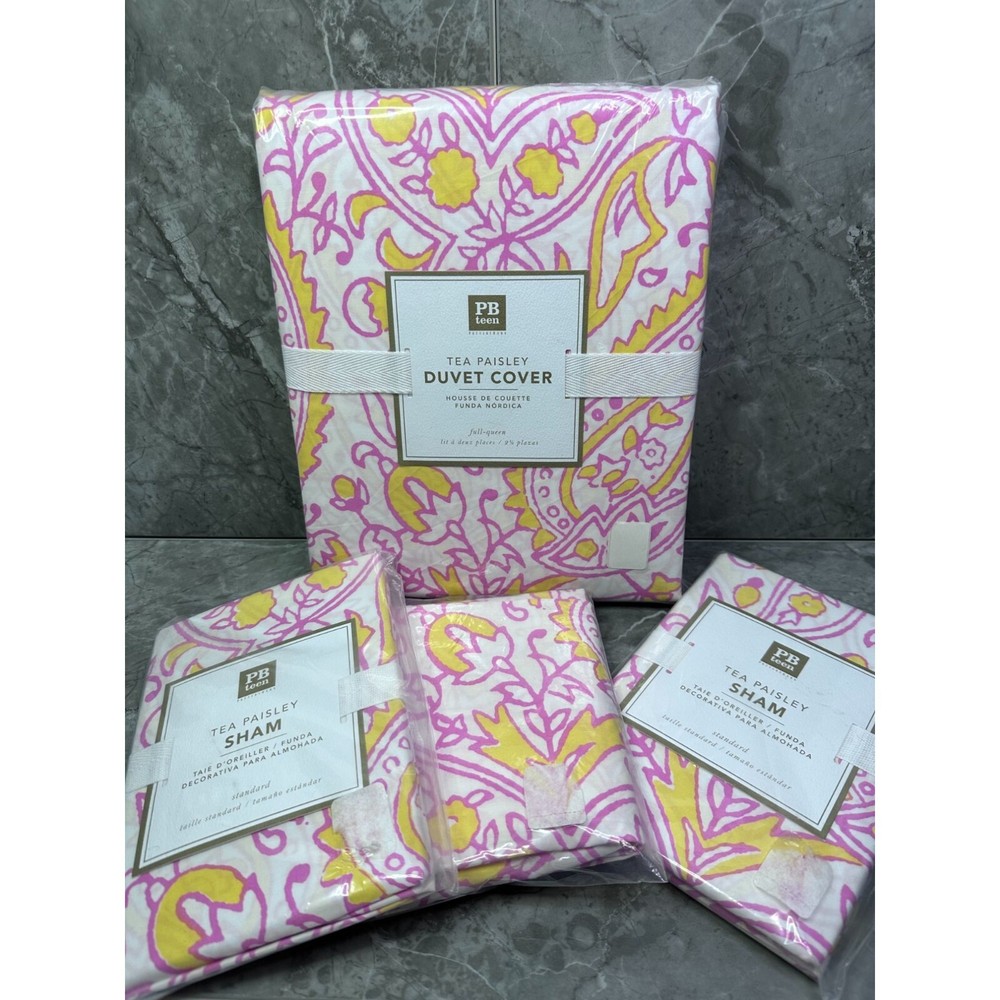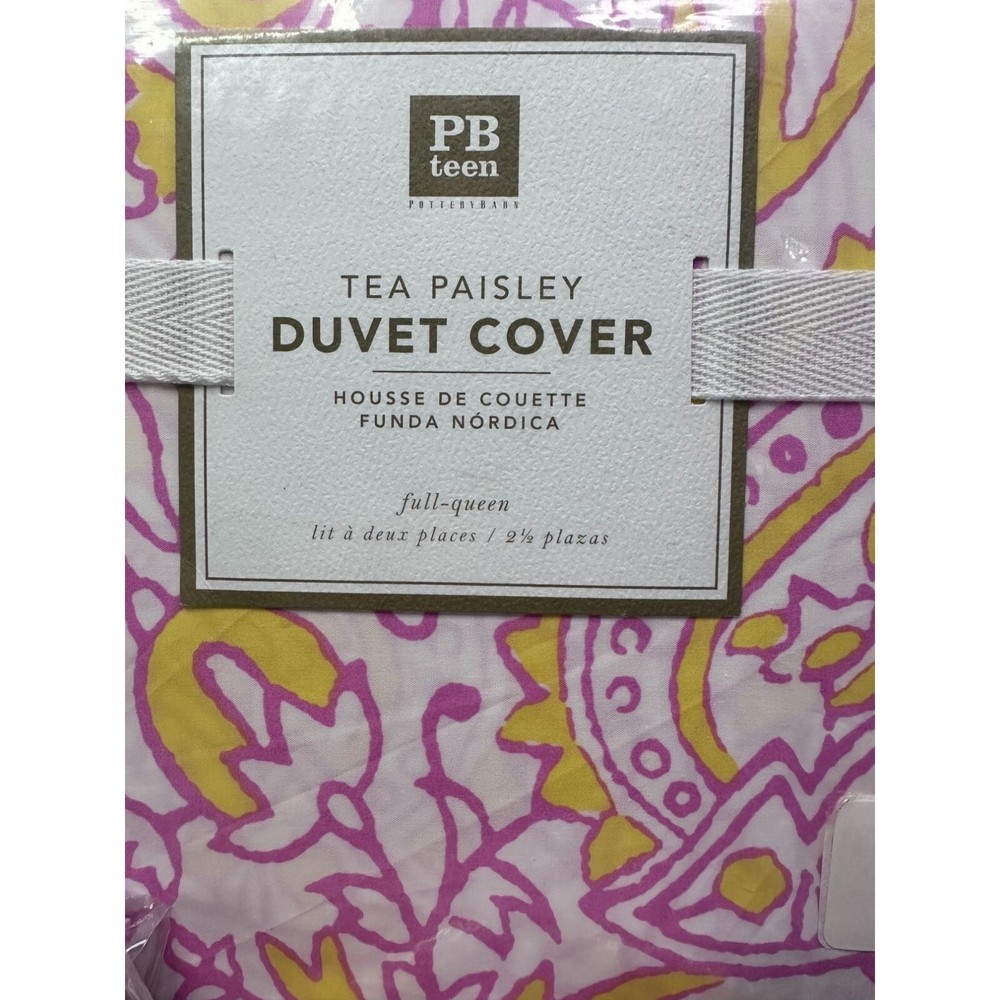 Elevate your bedroom with the Pottery Barn Tea Paisley Comforter/Duvet Cover and 3 Pillow Shams. Crafted from 100% cotton in vibrant yellow, pink, and white, this set is perfect for any Full/Queen bed. • Made by Pottery Barn • Includes 3 pillow shams • Vibrant paisley pattern • 100% cotton material • Unisex design • Button closure BOX G Features: • Full/Queen Comforter Duvet w/3 Pillow Shams • Pottery Barn Tea Paisley Pattern Duvet and Pillow Shams • Pink/Yellow/White Paisley Pattern • Machine Washable 100% Cotton • Duvet Cover has Butons to help keep in place, 3 pillow shams • Any • Pottery Barn Tea Paisley • Made in Pakistan • Machine Washable Size: Unisex Full/Queen Condition: New With Tags